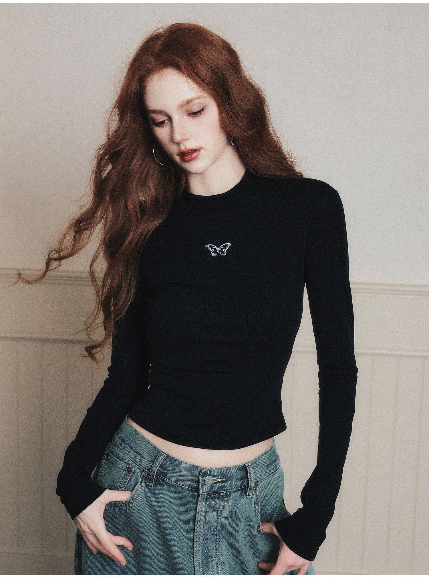 Pleated Fitted Mock Neck T-Shirt With Bird Motif