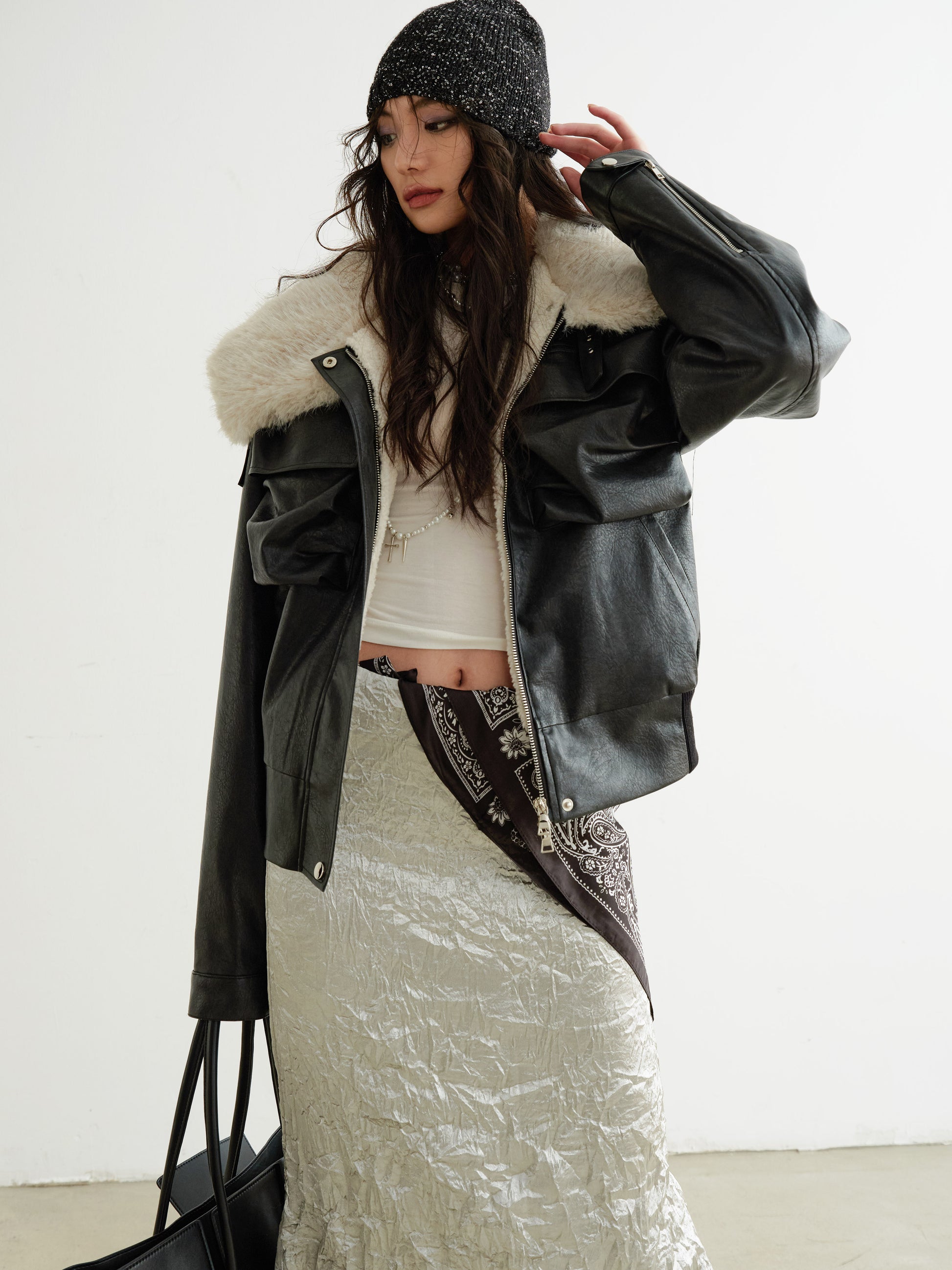 Faux Leather 3D Pocket Jacket With Fur Collar