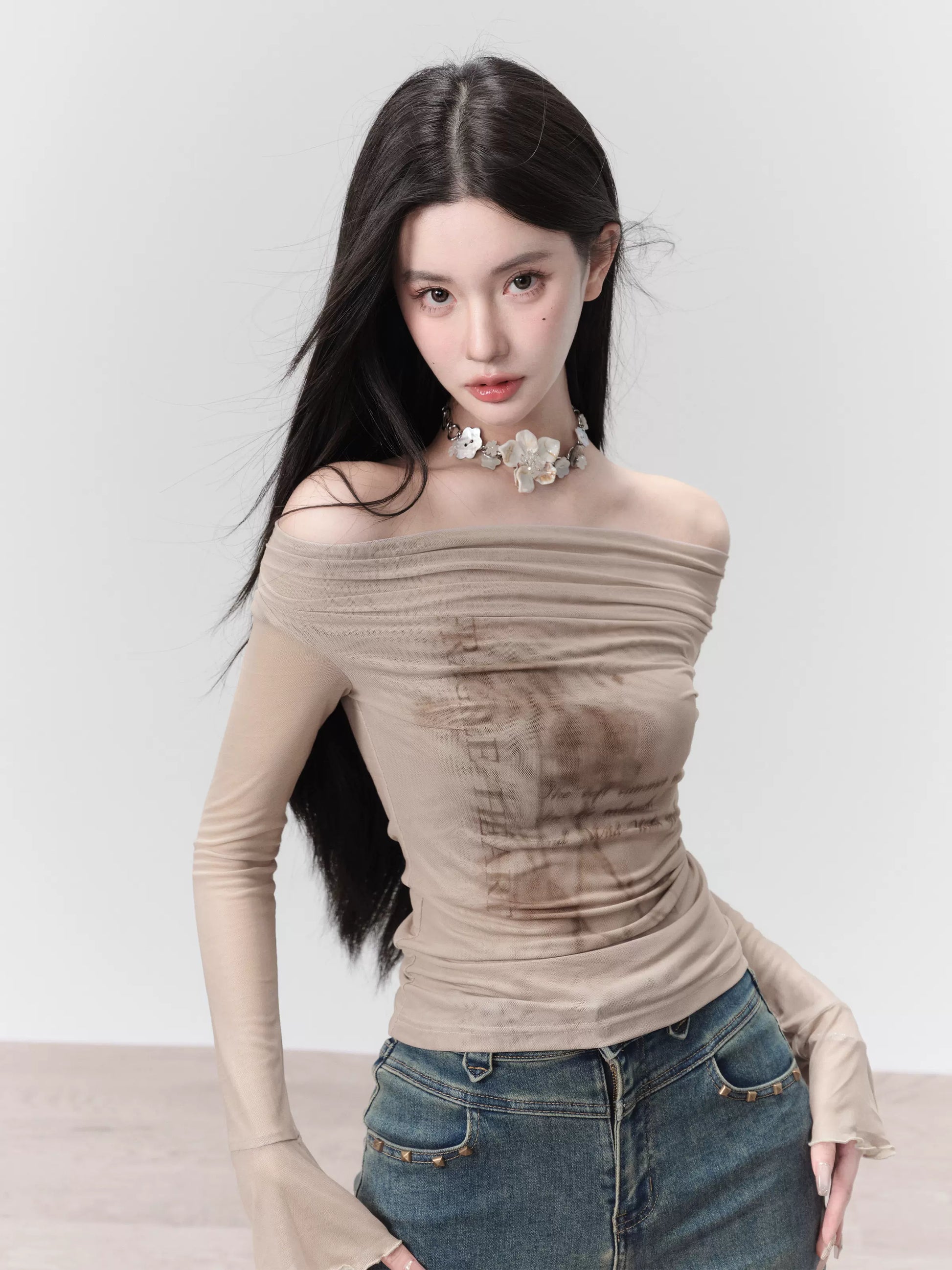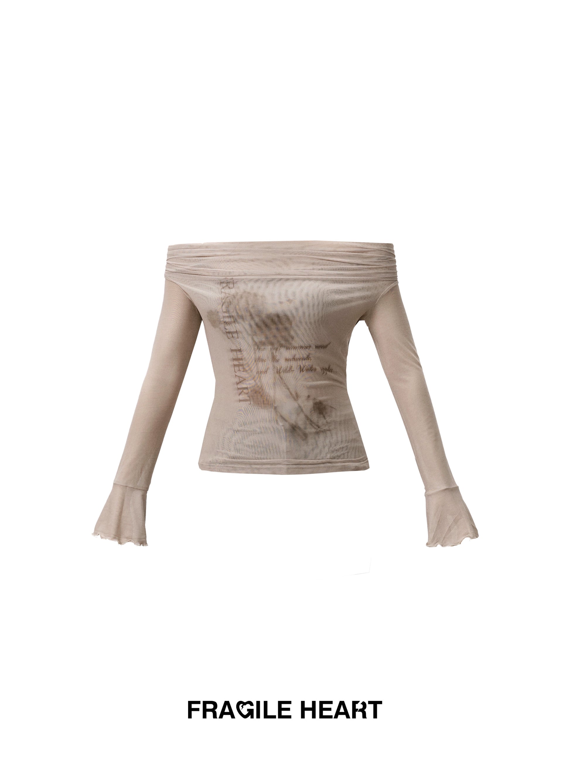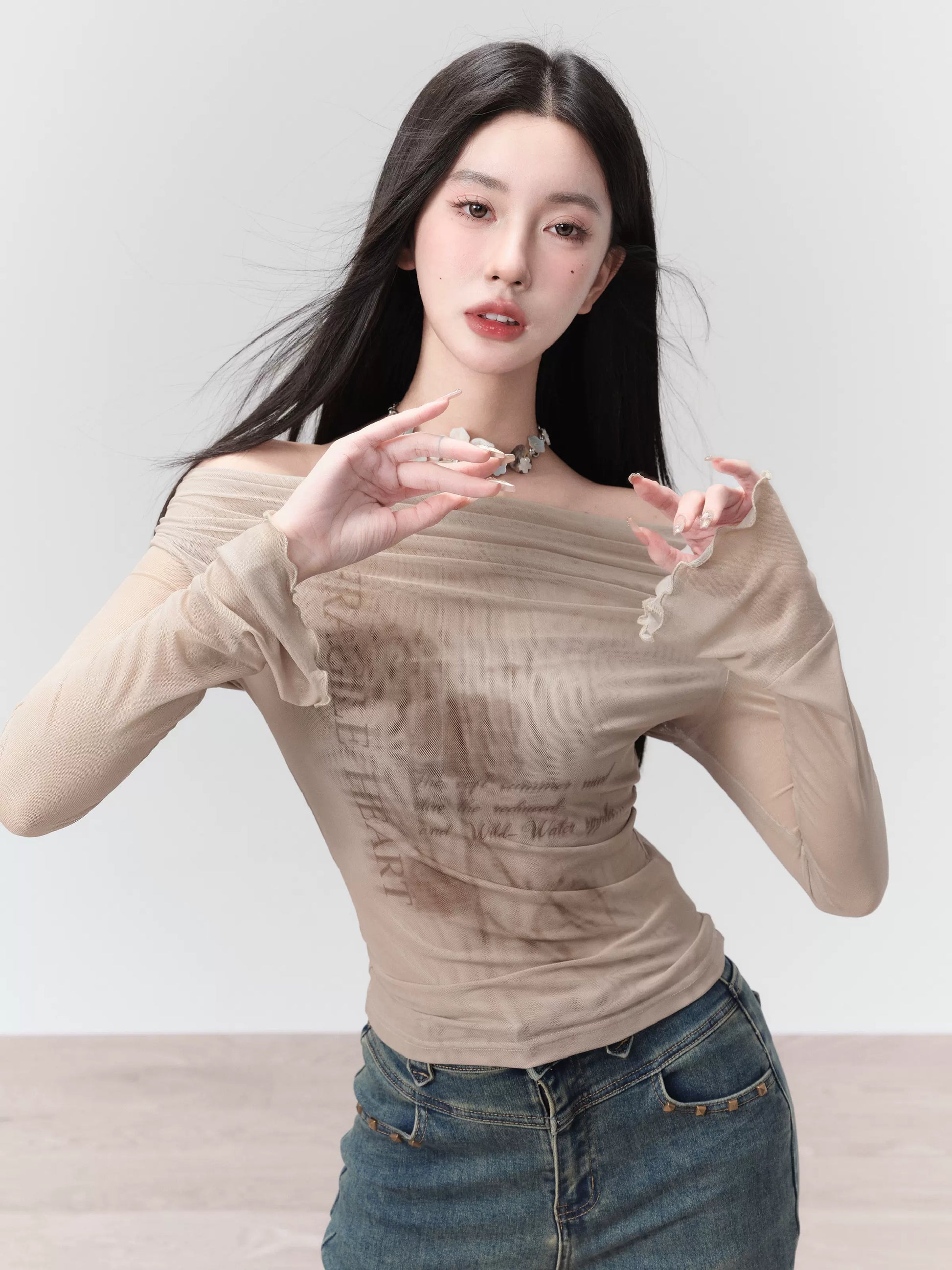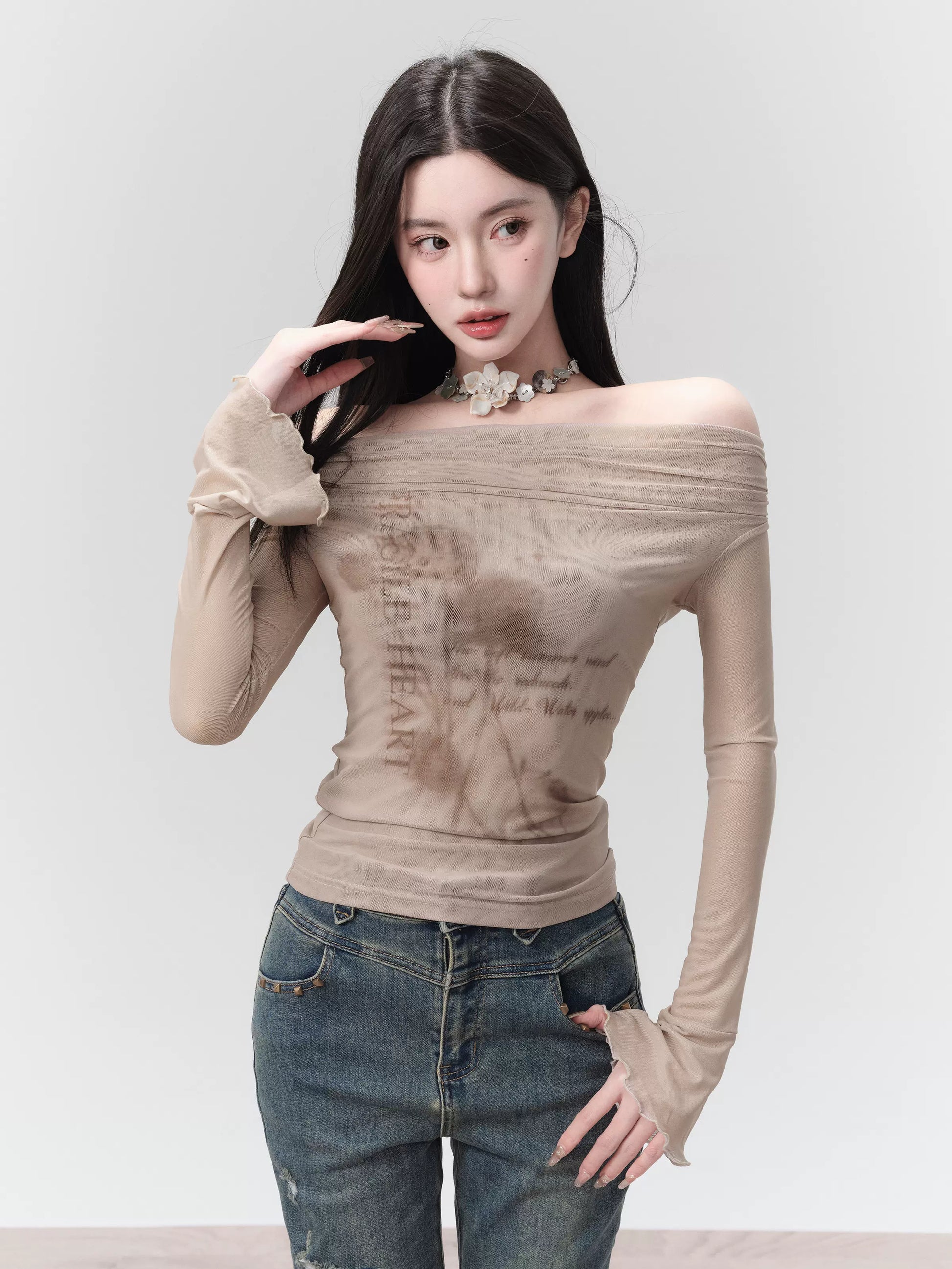 Off Shoulder Slim Fit Long Sleeved Mesh Top