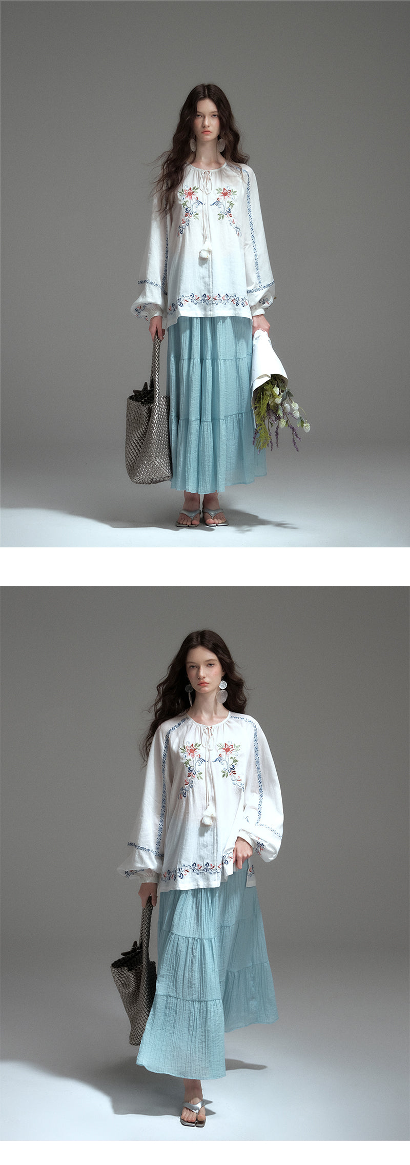 Boho Floral Embroidered Peasant Blouse With Tassel Tie