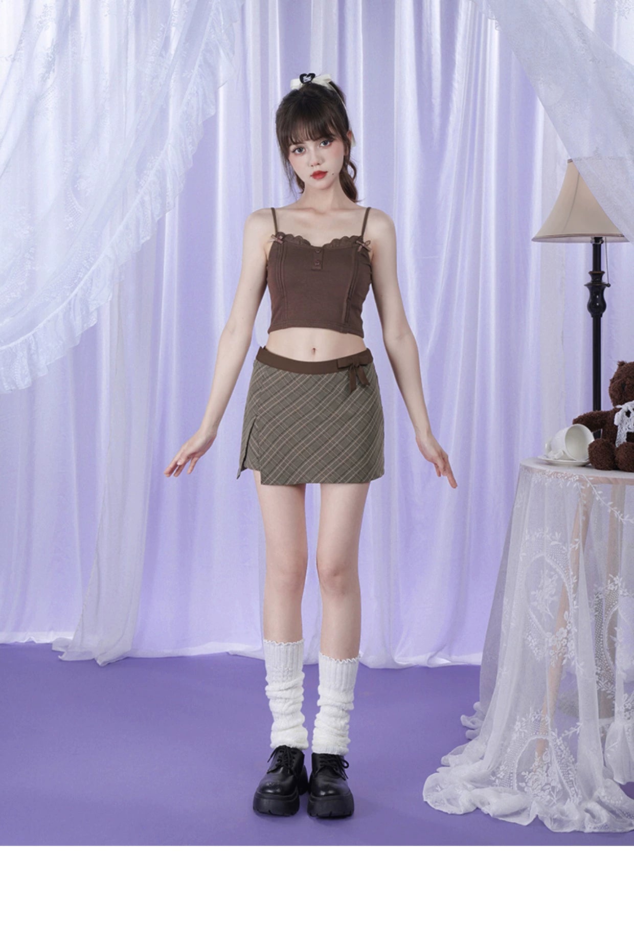 Brown Checked Bow and Slit Details Low Rise Skort Pants