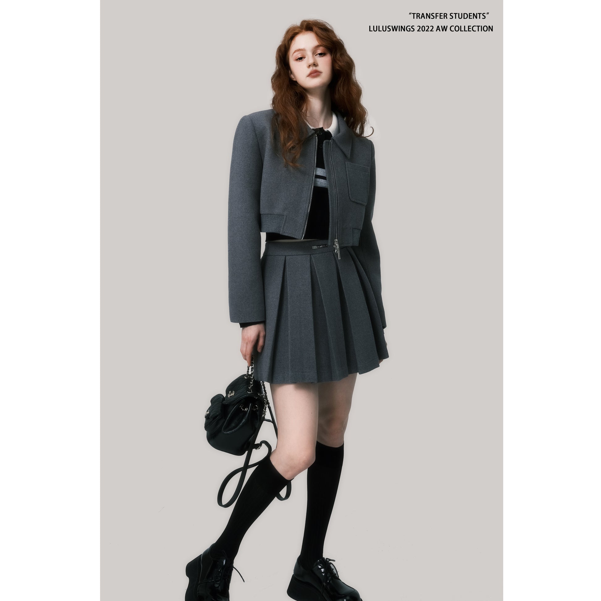 Double-Sided Zip Cropped Jacket & Pleated Skirt