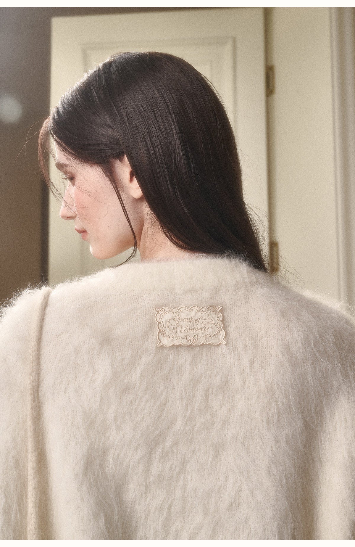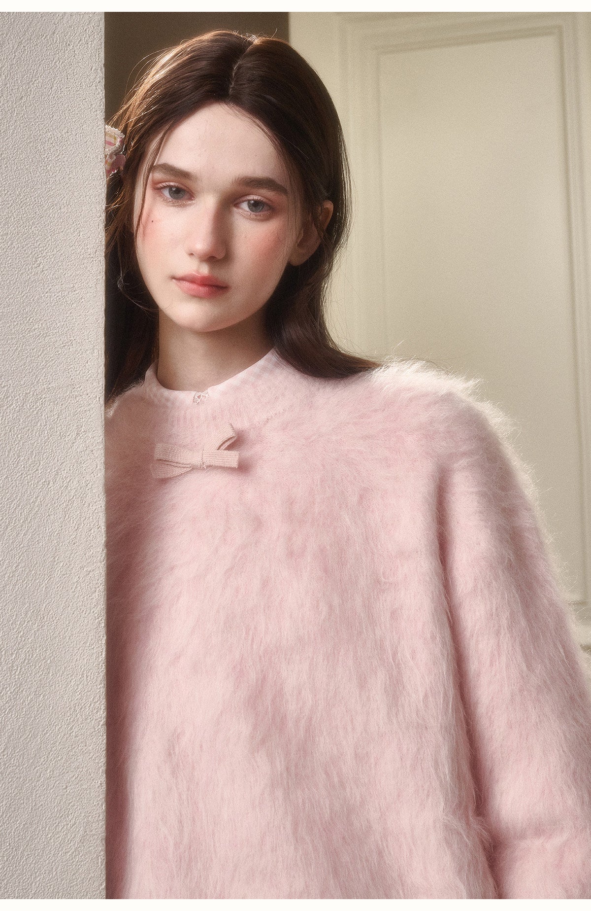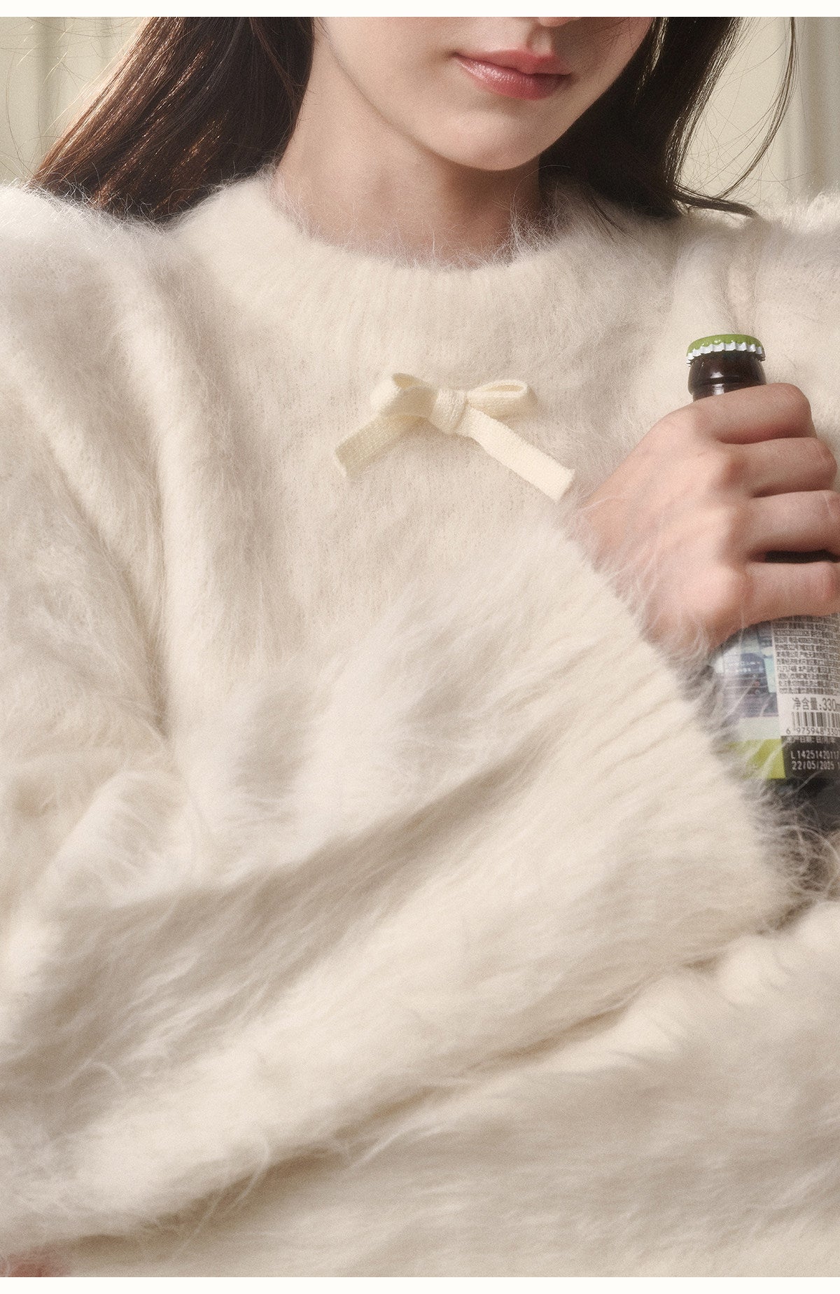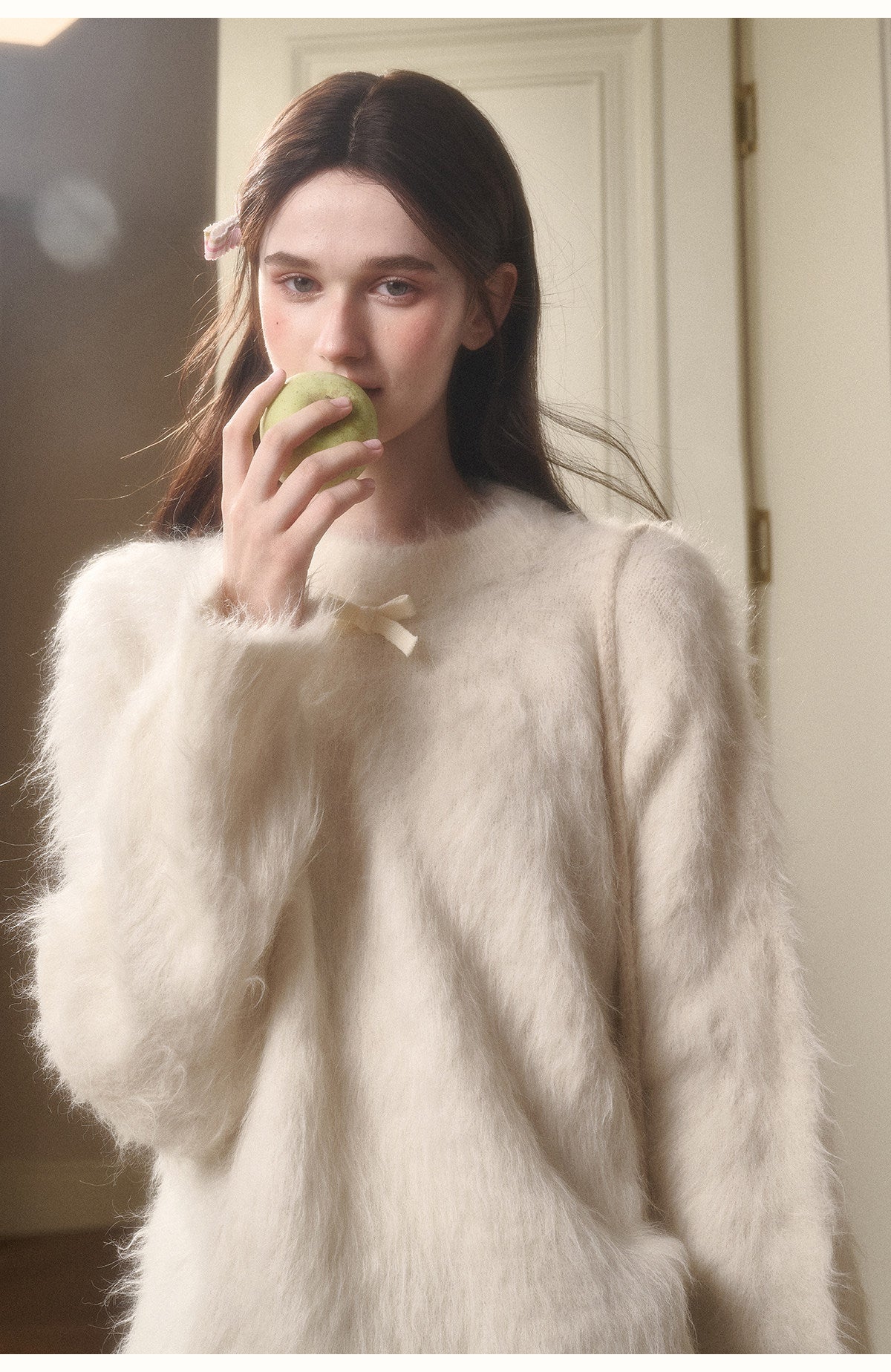 Alpaca-Blend Long-Pile Knit Top With Bow Detail
