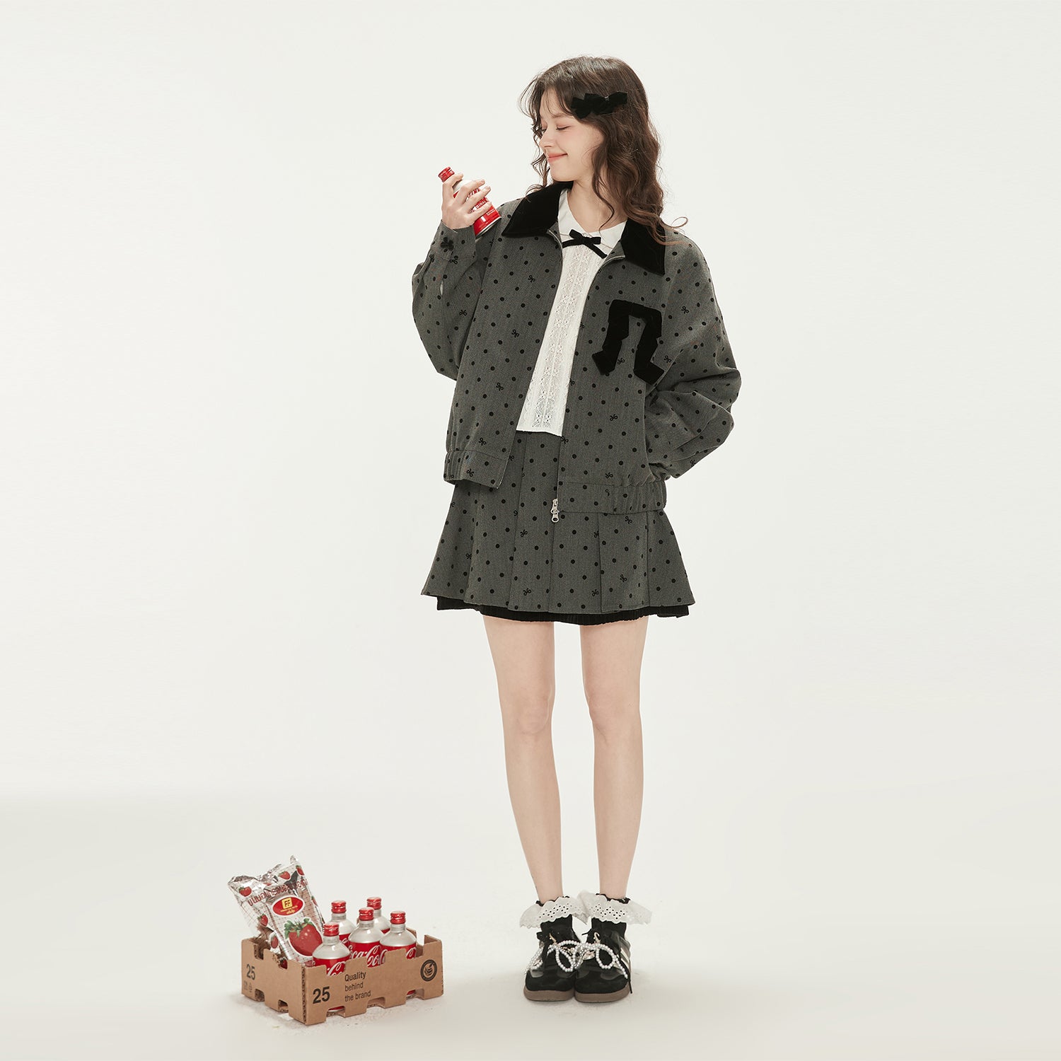 Bow Dot Herringbone Zip Jacket And Pleated Skirt