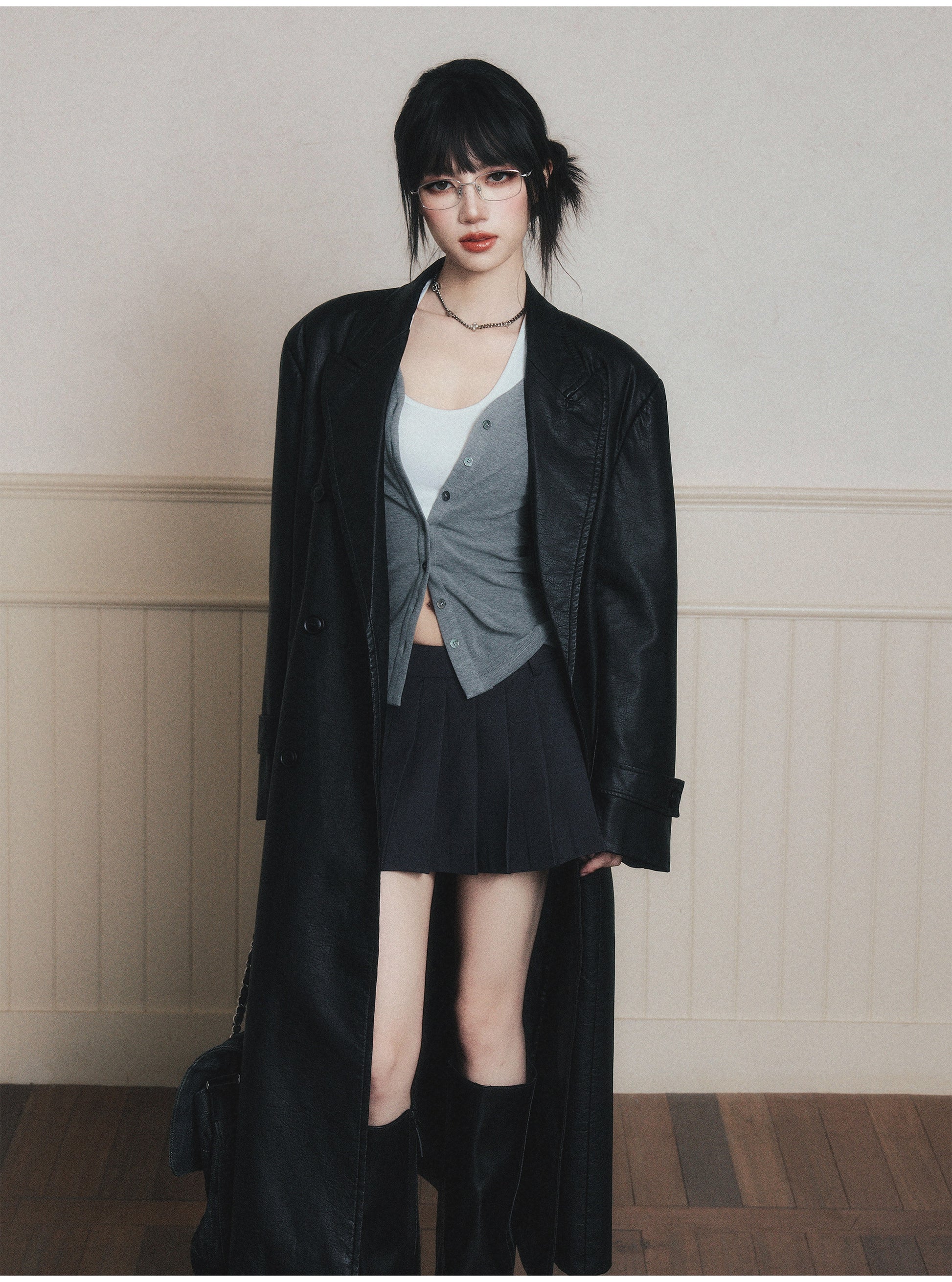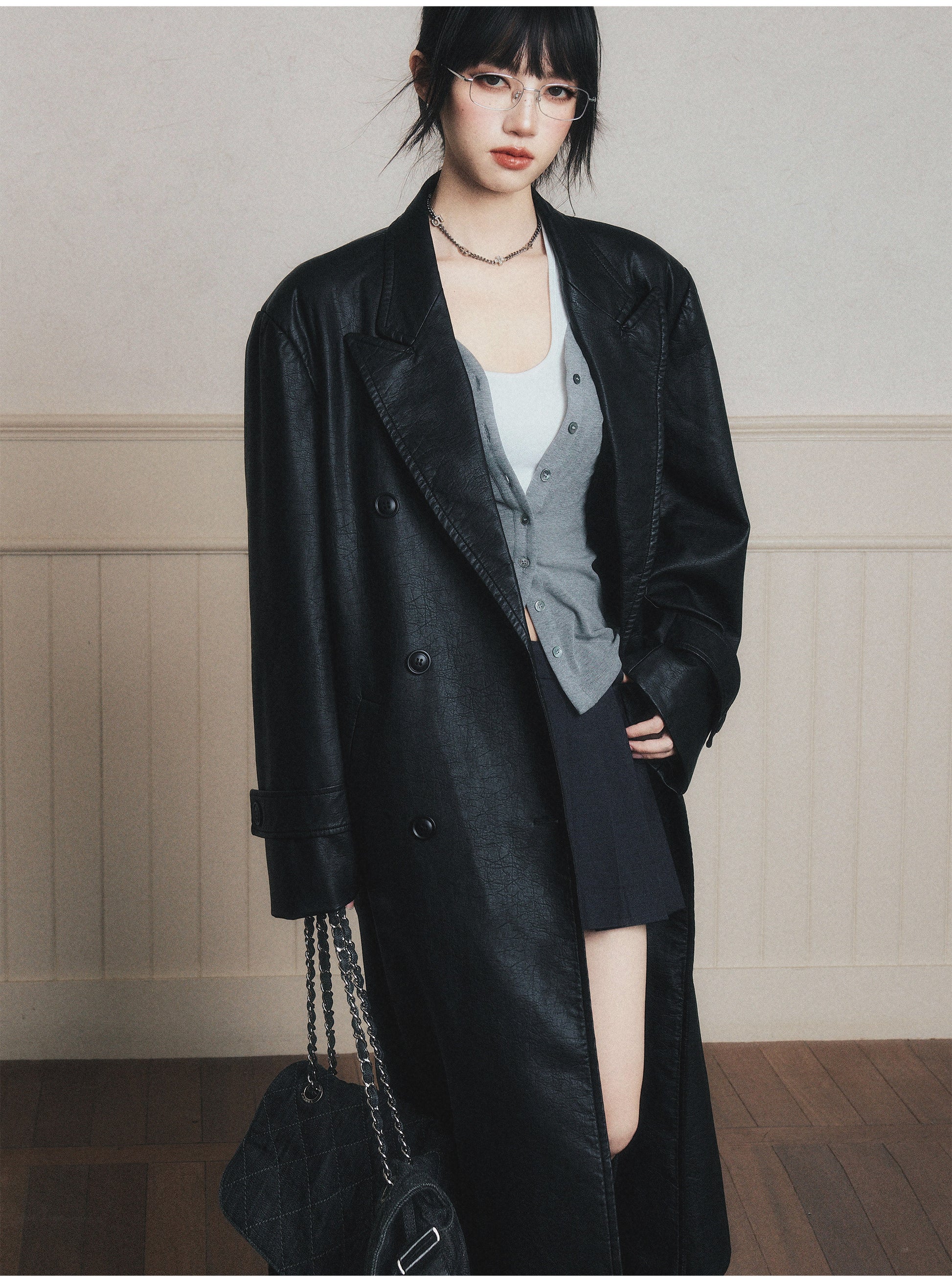 Double-Breasted Wrinkled Faux-Leather Overcoat