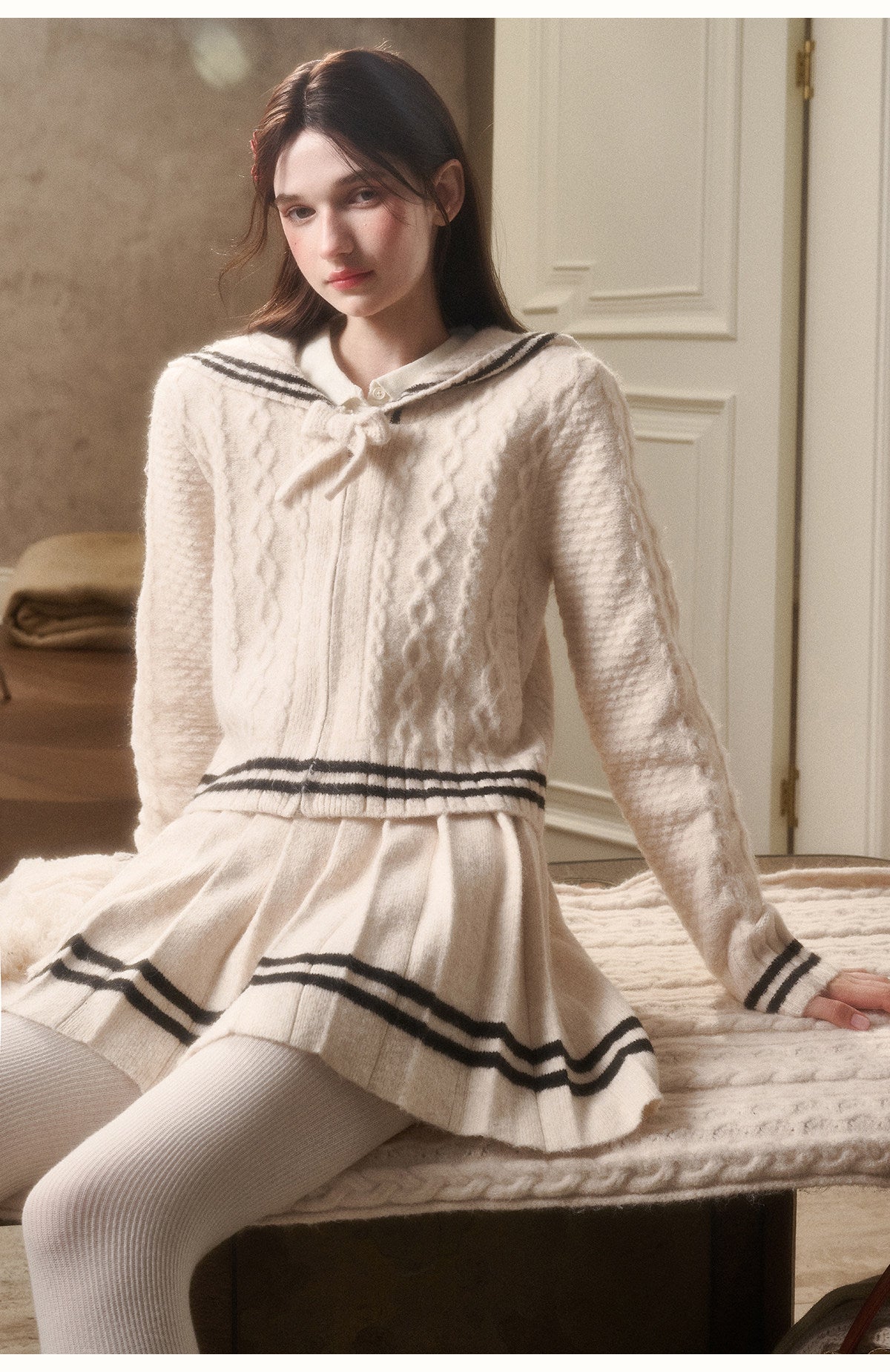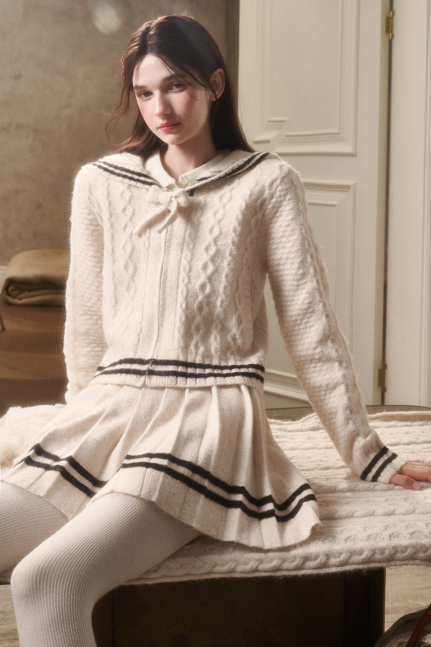 Preppy Cable Knit Zip-Up Top & Pleated Skirt