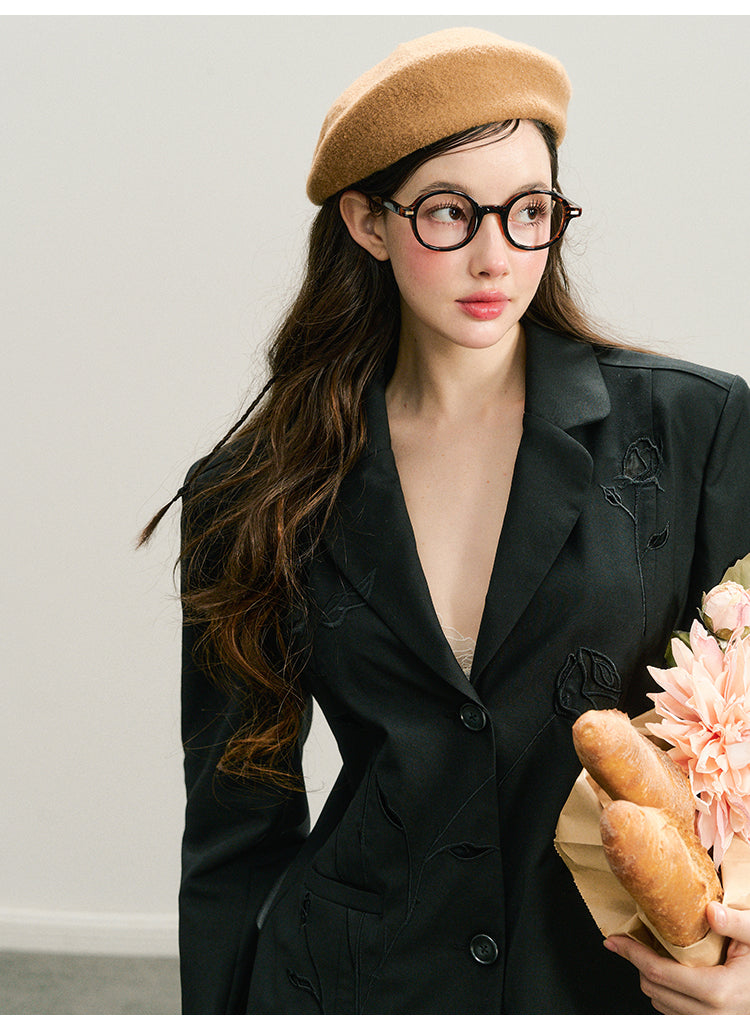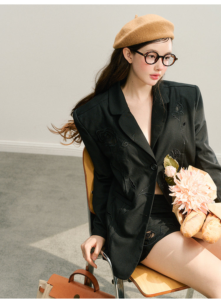 Rose Embroidered Blazer And Mini Skirt Suit