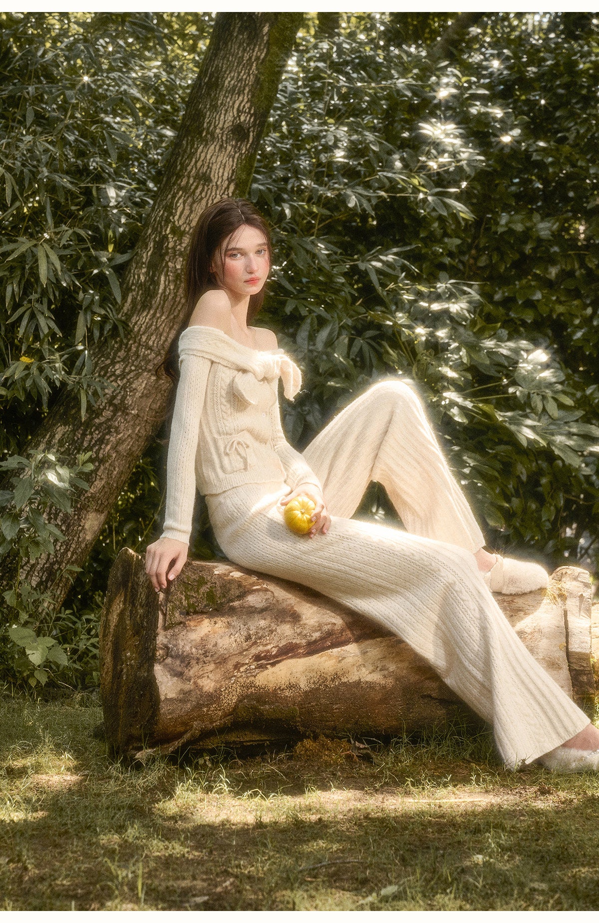 Off-Shoulder Pointelle Knit Top & Pants With Bow Details