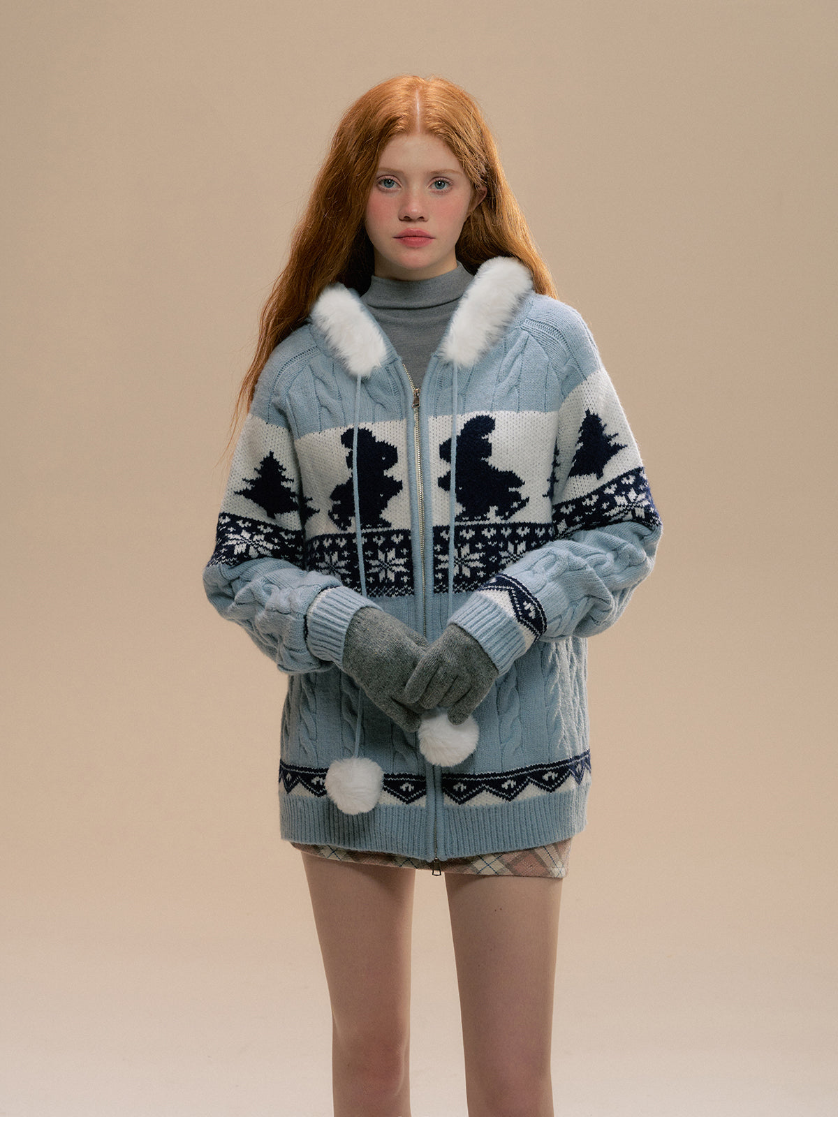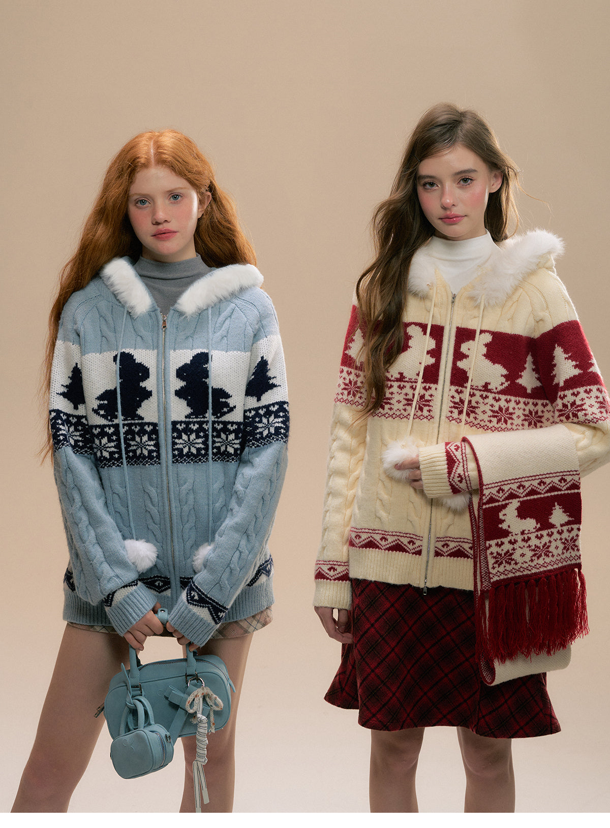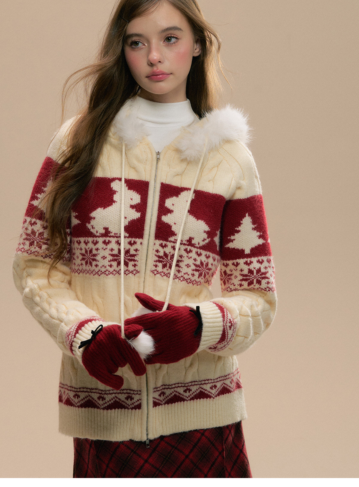Faux Fur Trimmed Knit Bunny Hoodie And Matching Scarf