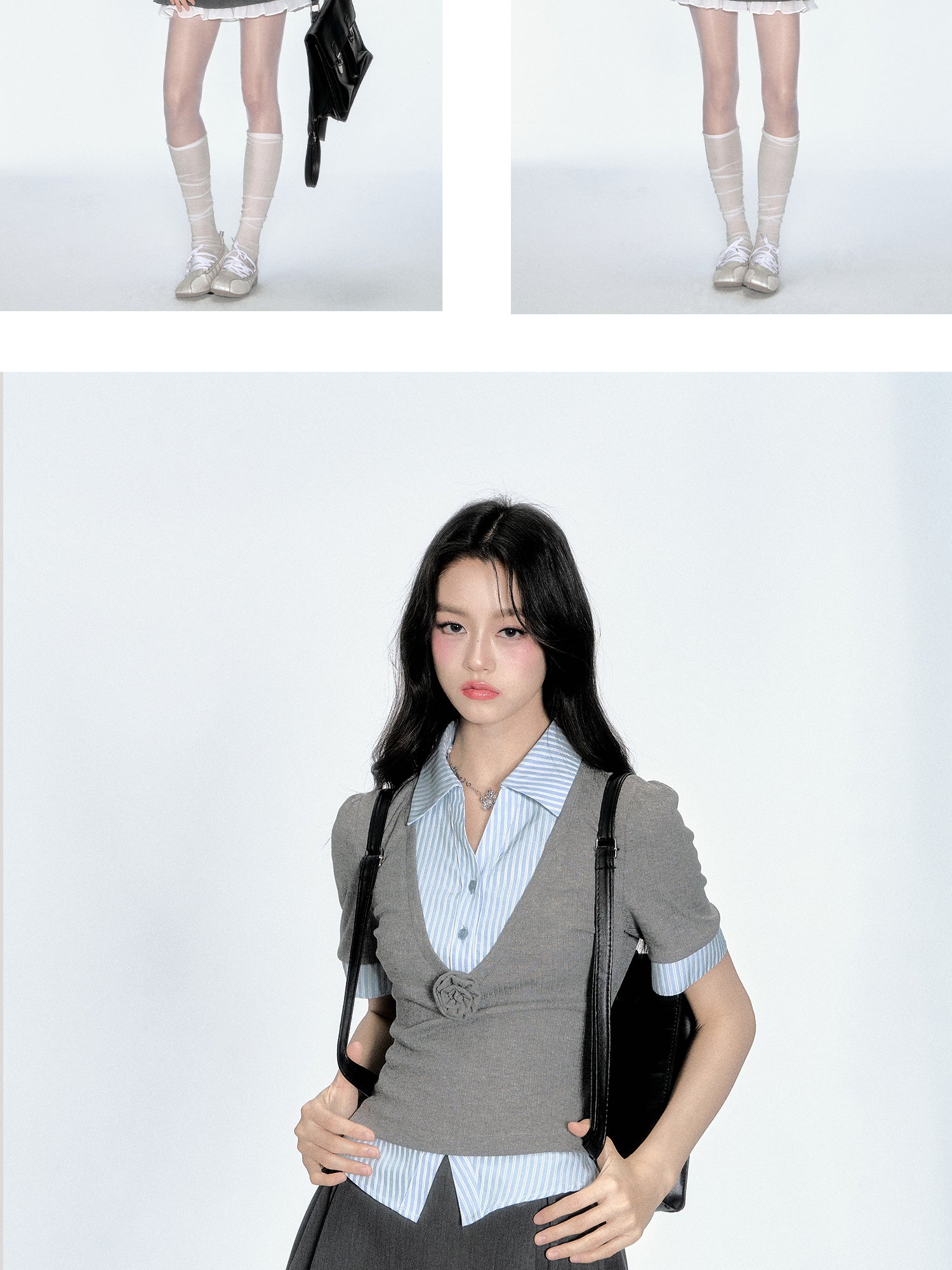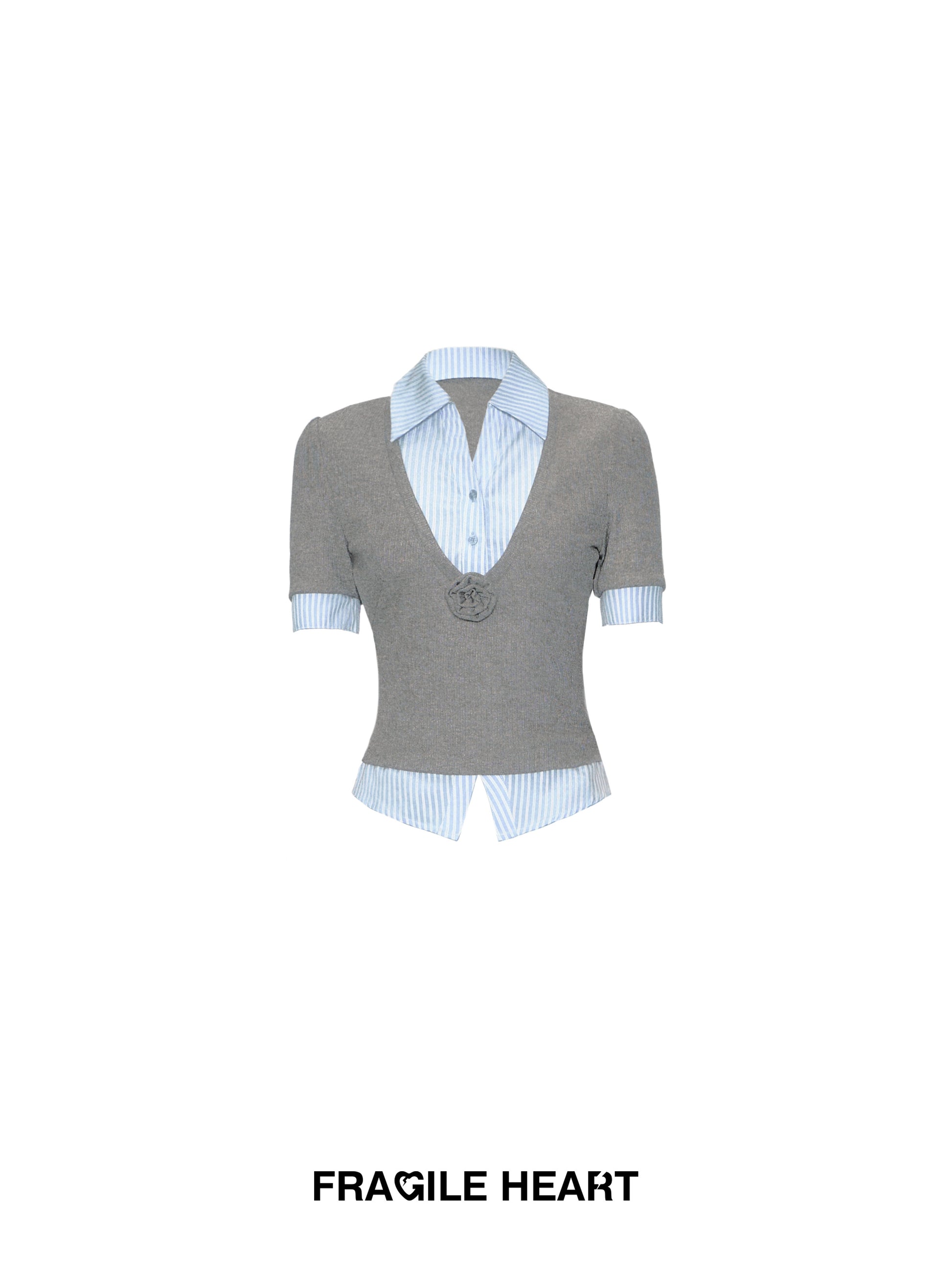 2-In-1 V-Neck Knit Top With Layered Striped Shirt