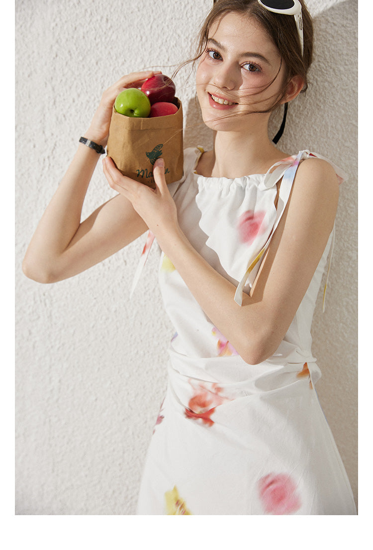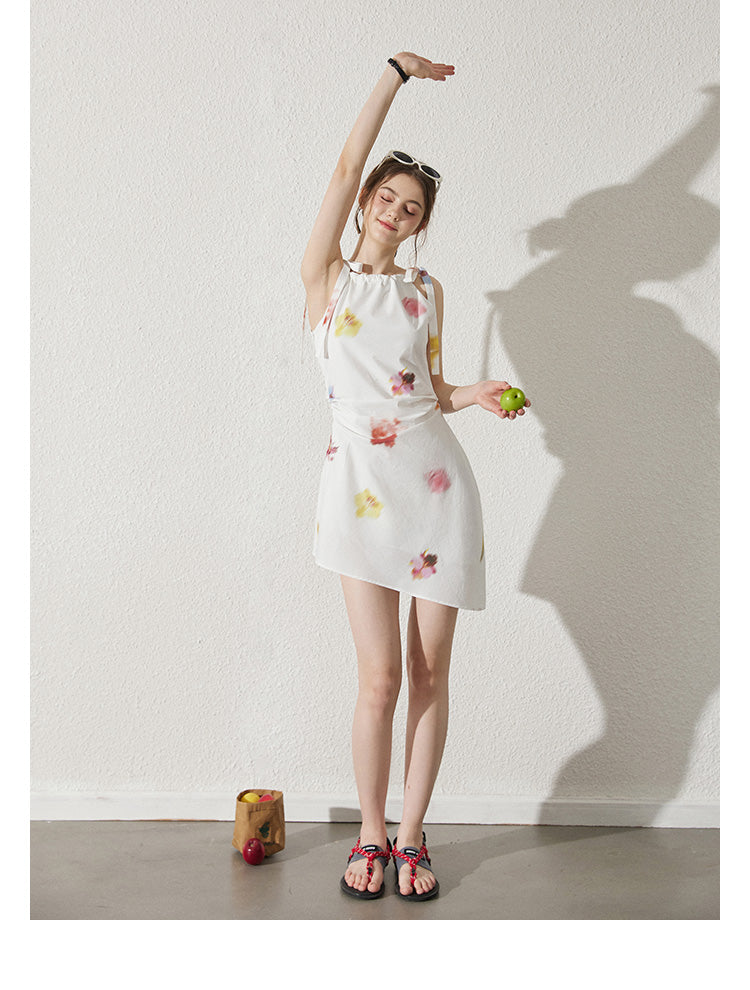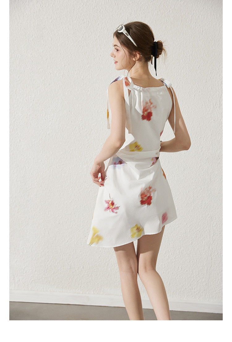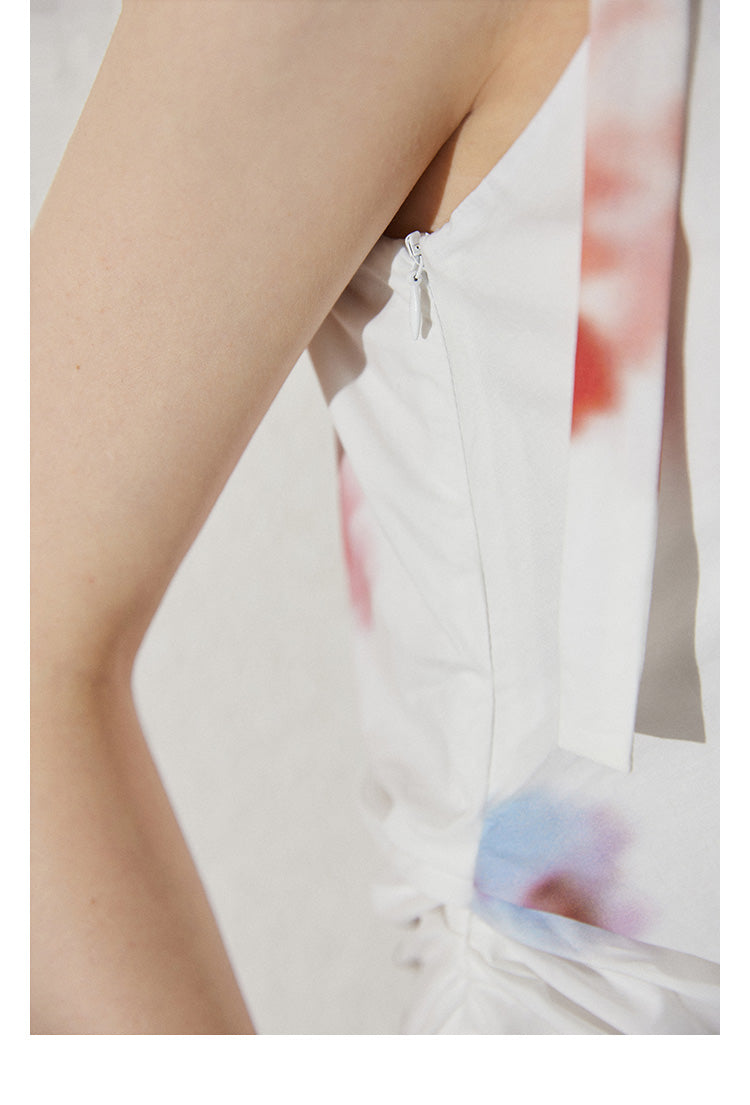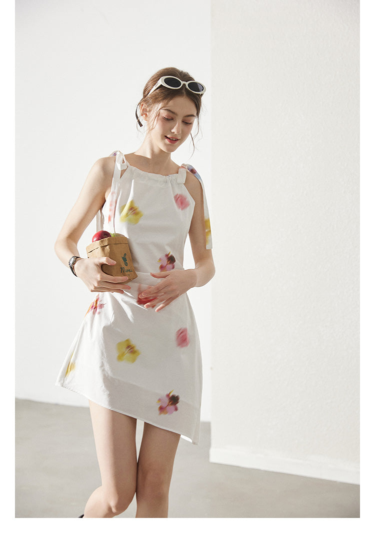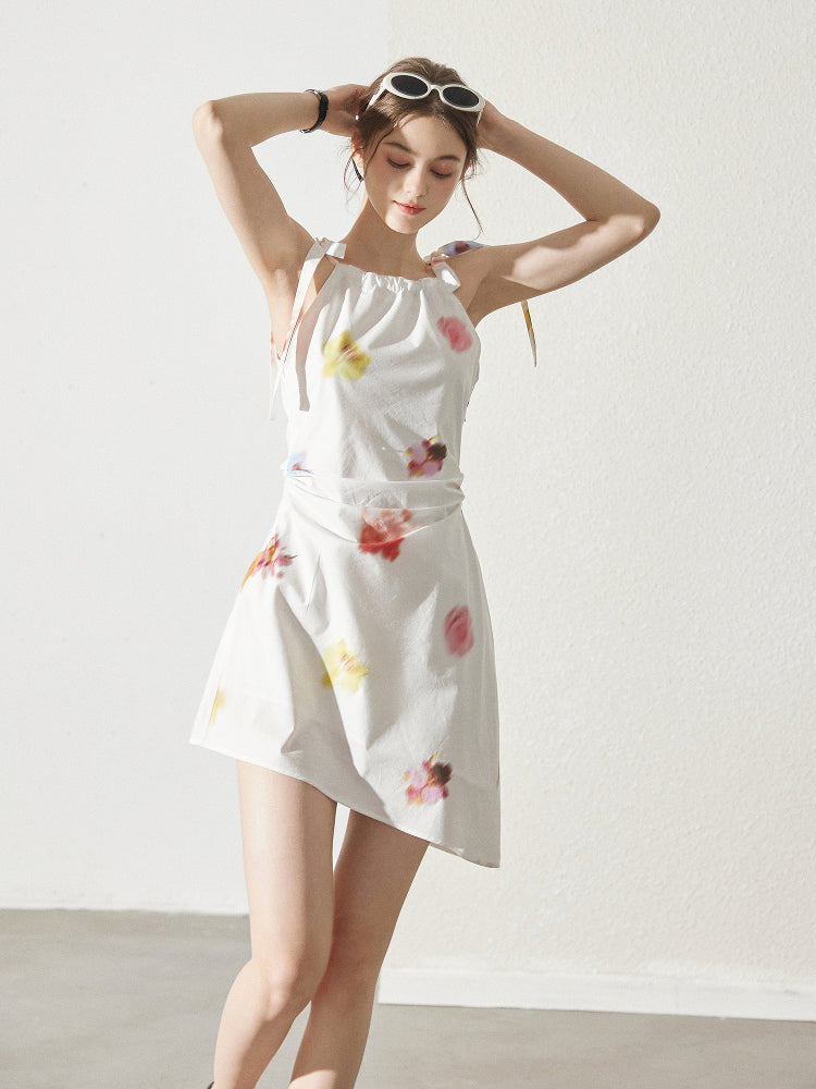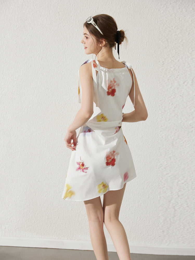 Asymmetric Blurred Floral Strappy Cotton Dress