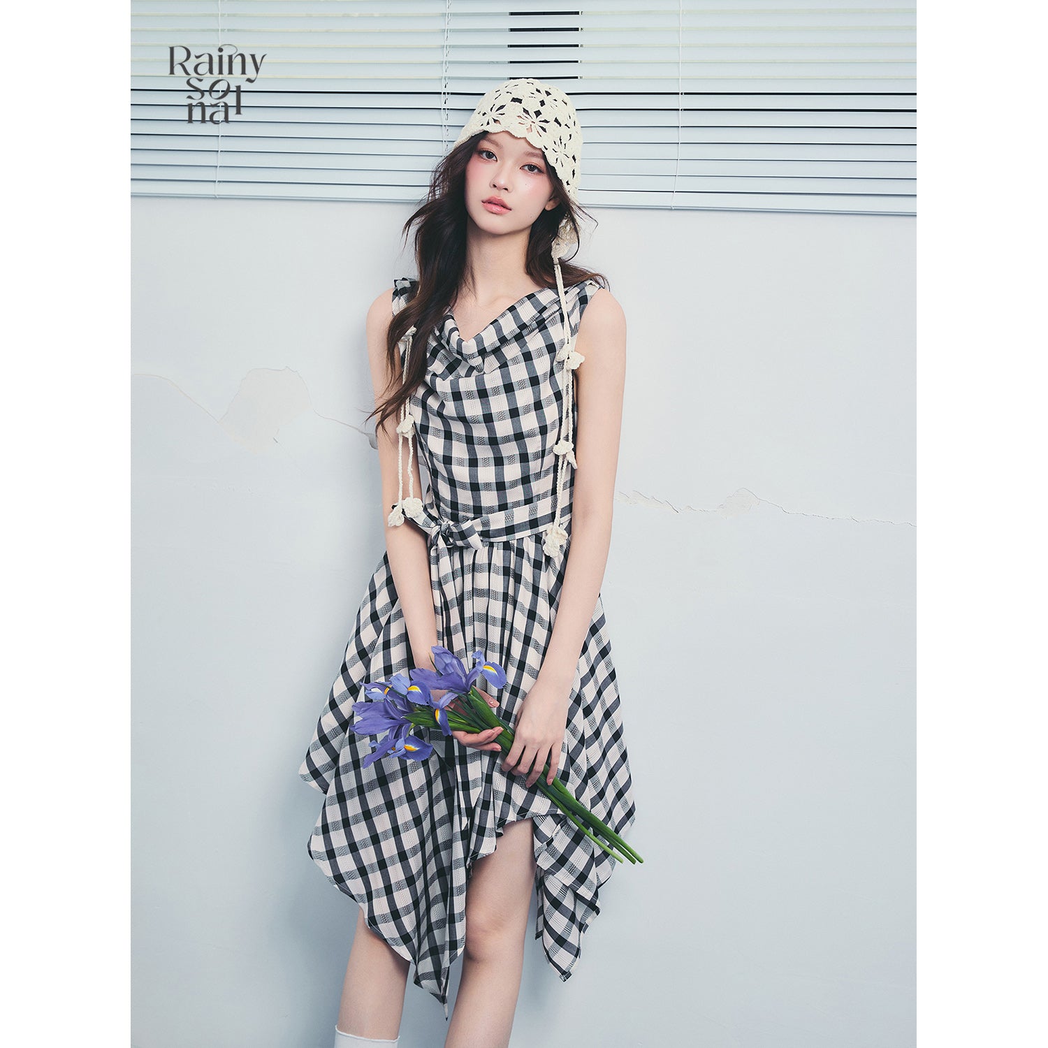 Asymmetrical Draped Plaid Dress With Tie Waist