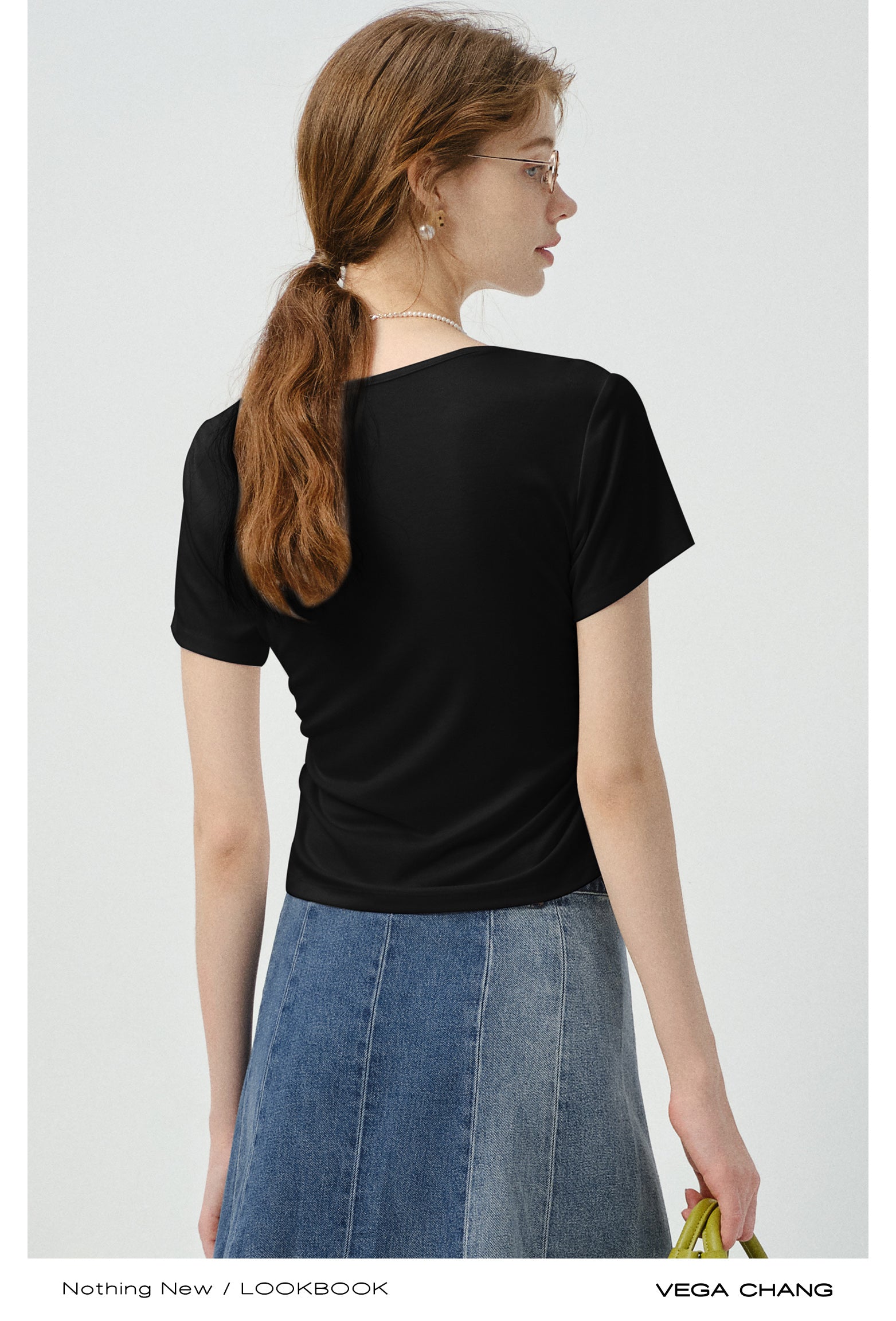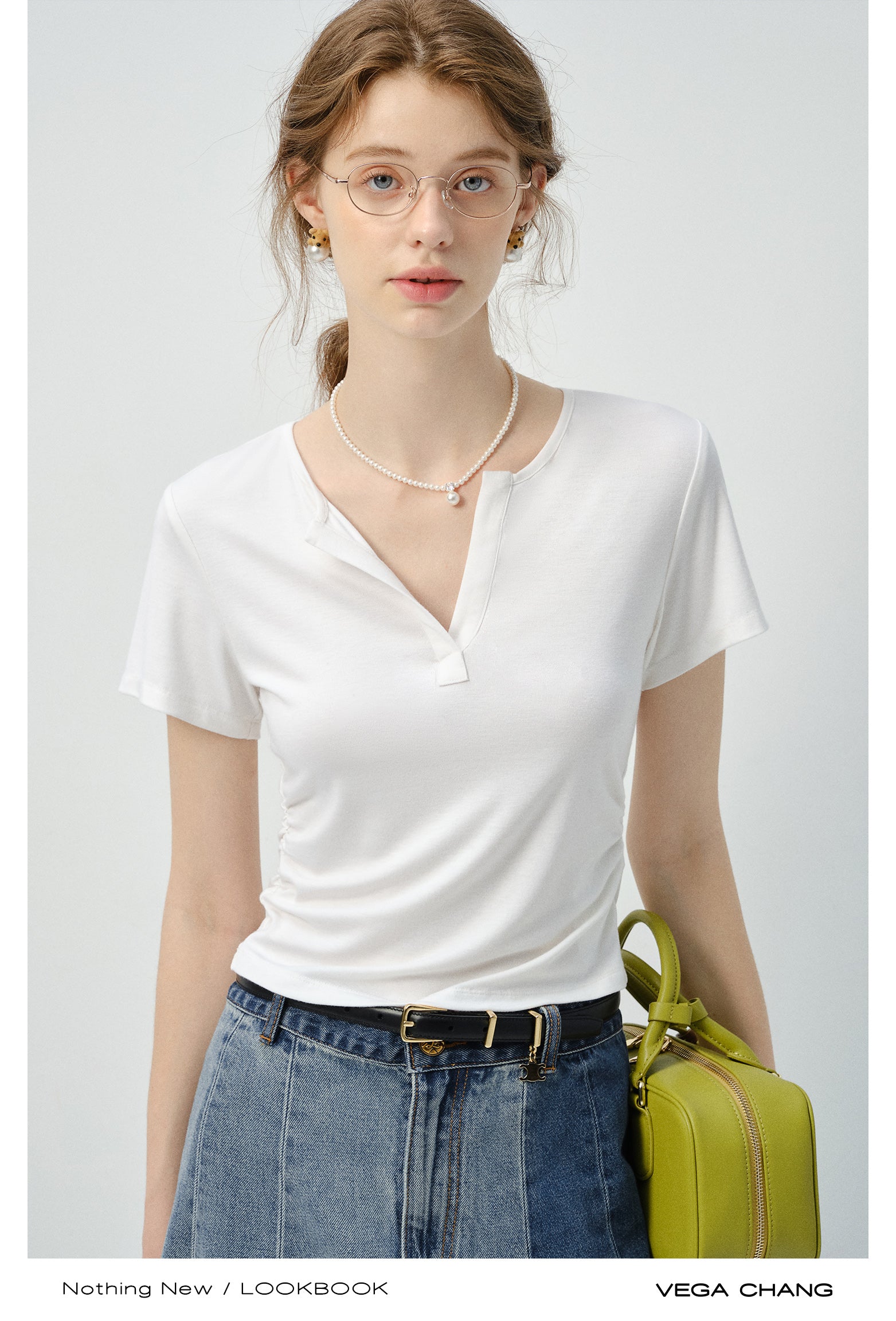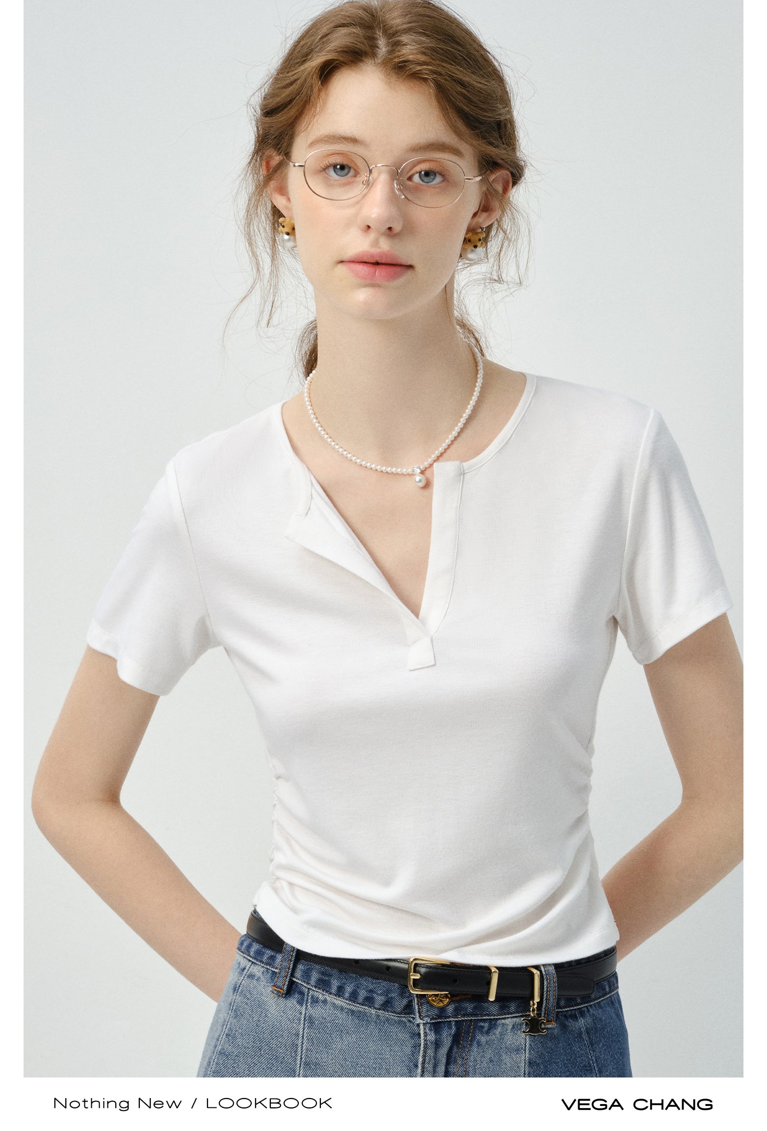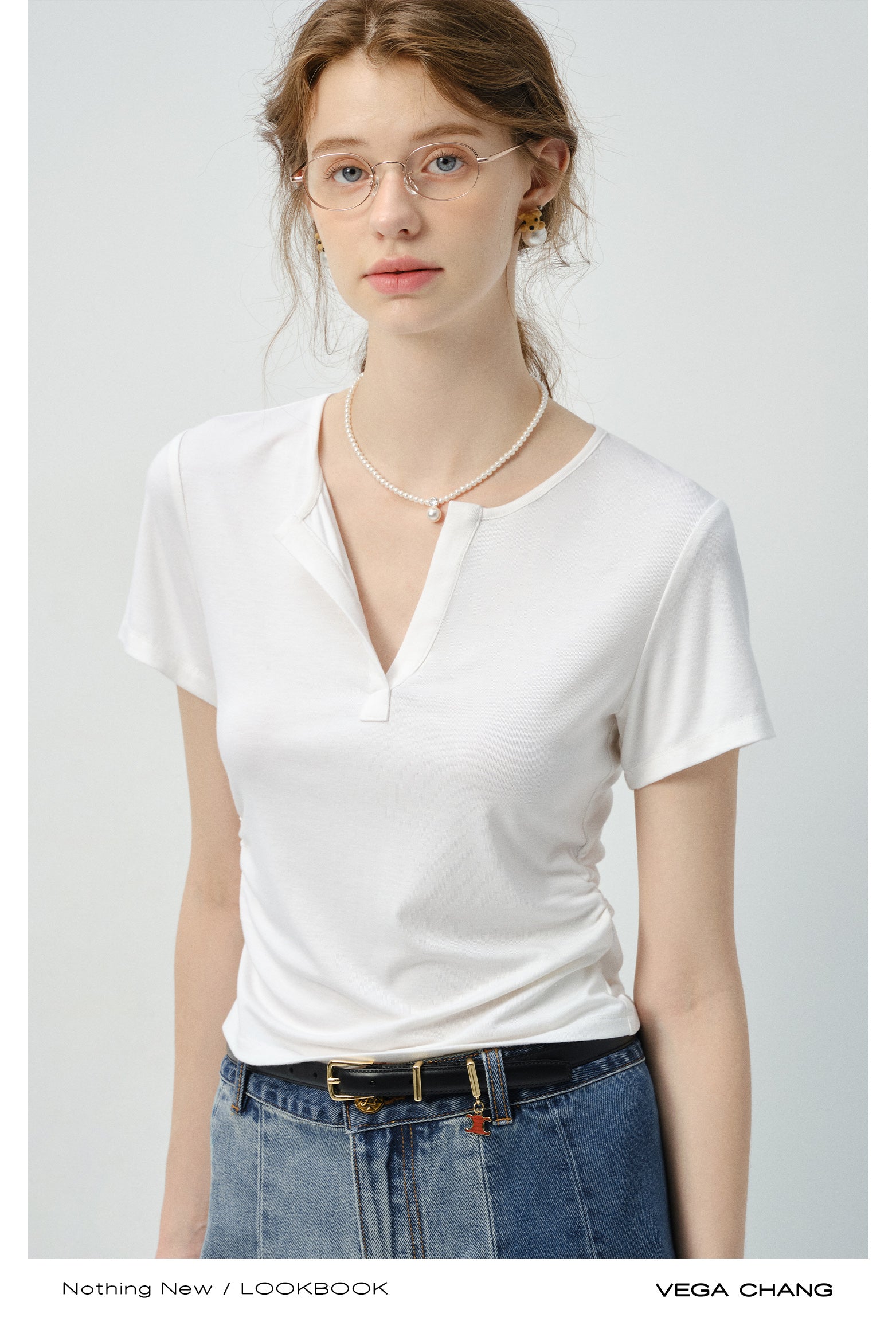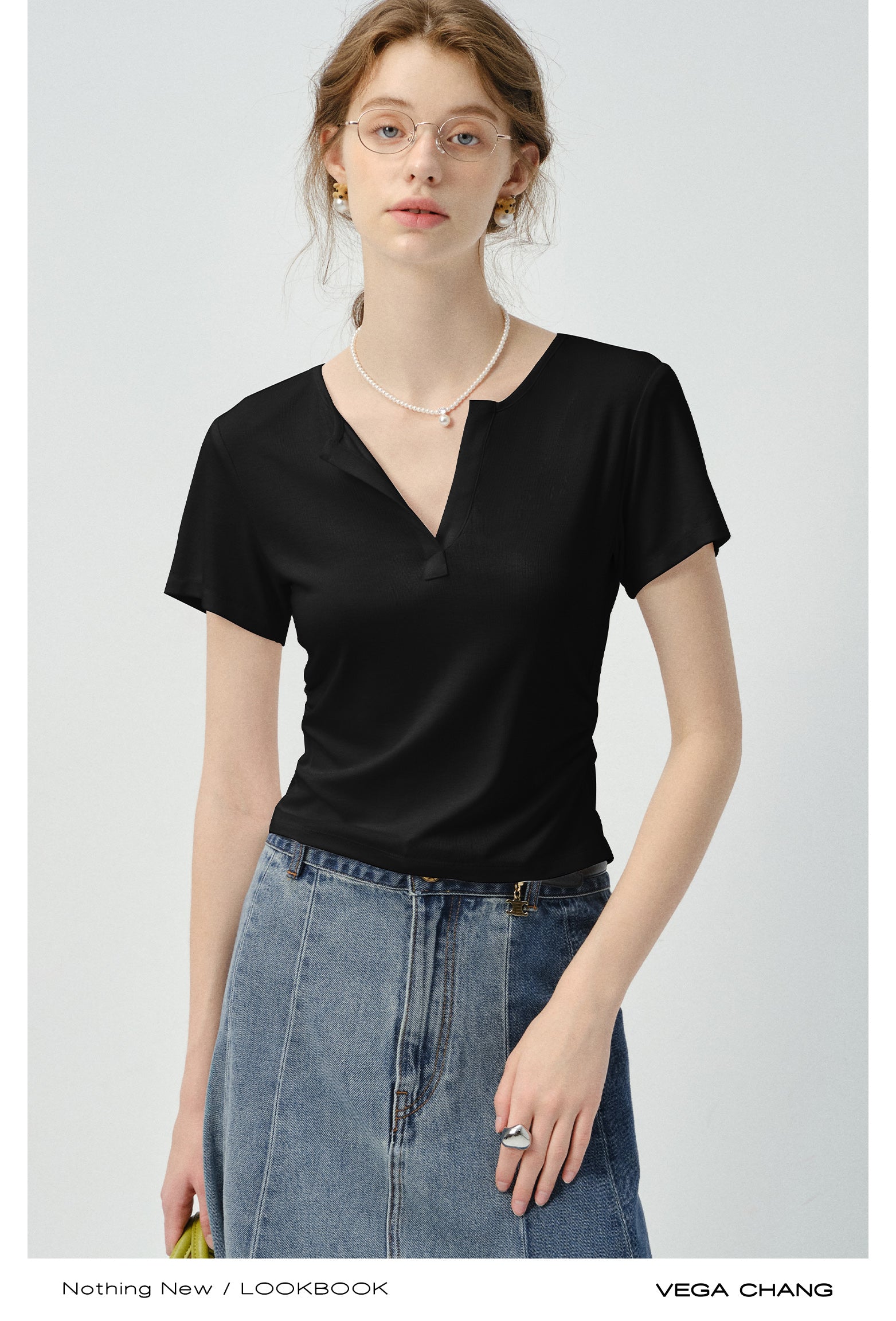 Basic Ribbed V-Neck T-Shirt With Side Gathers