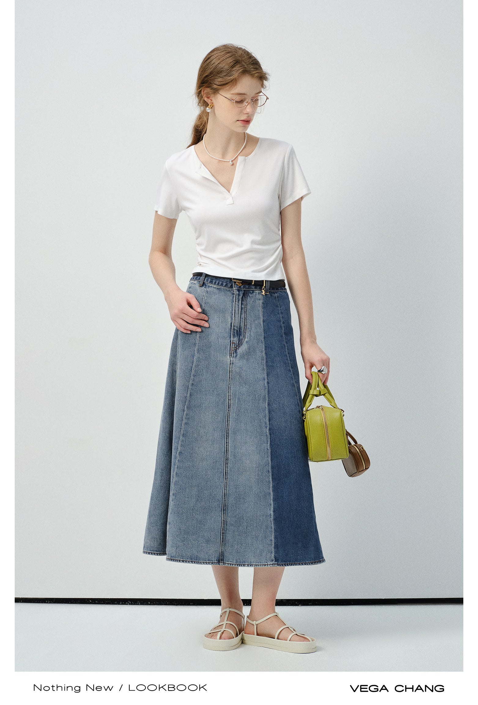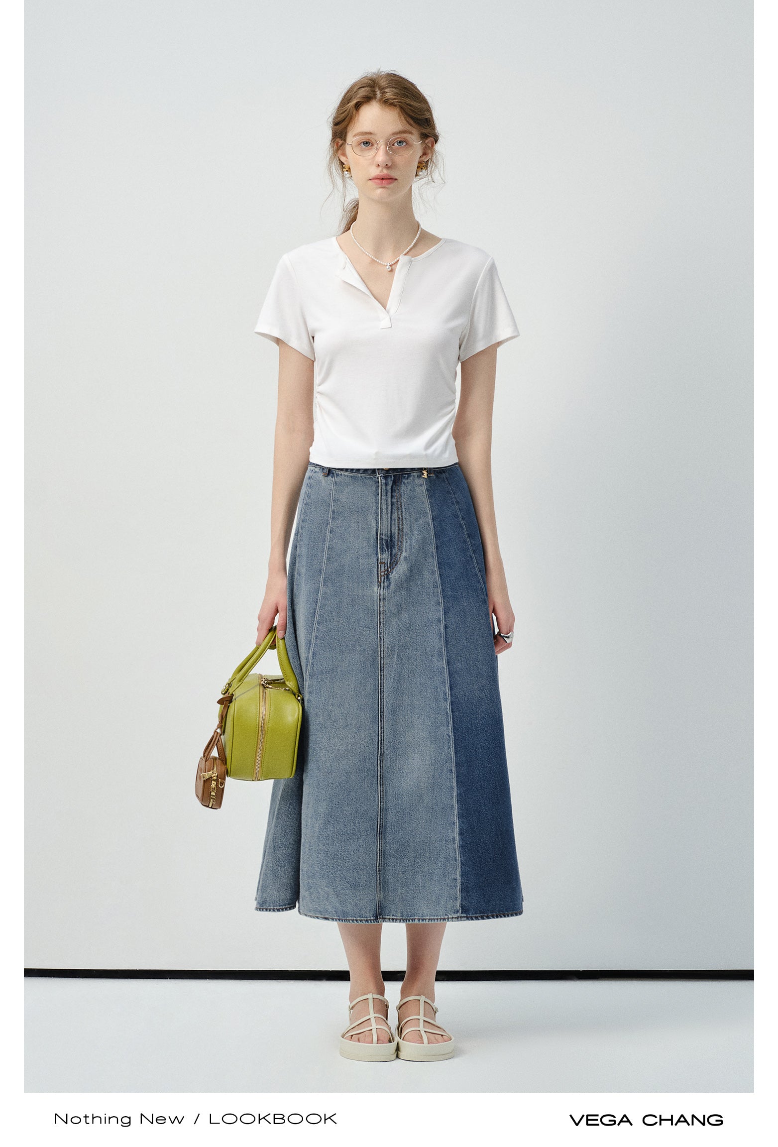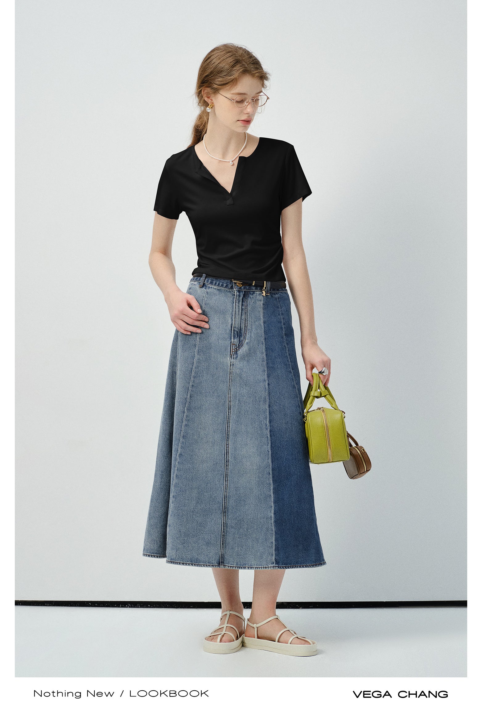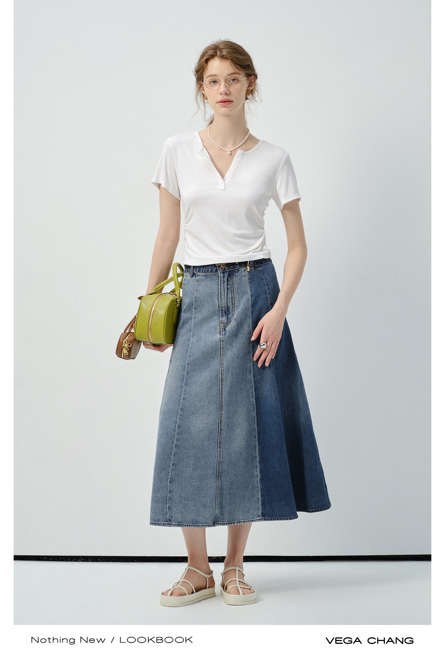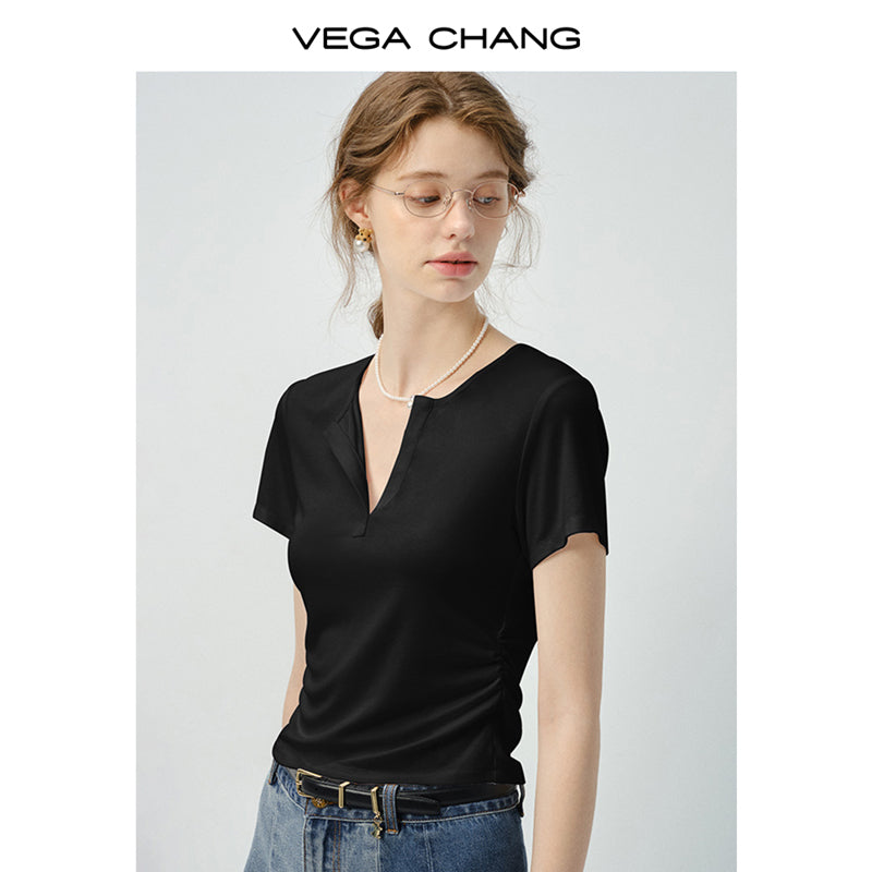 Basic Ribbed V-Neck T-Shirt With Side Gathers