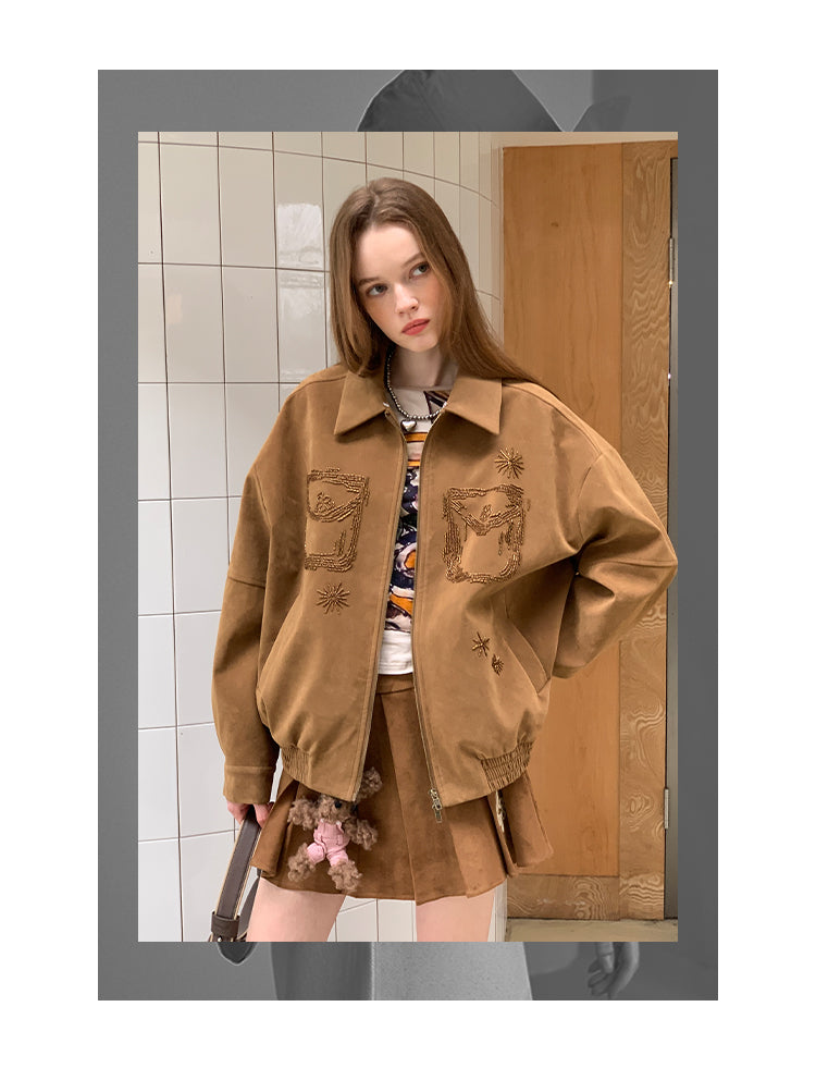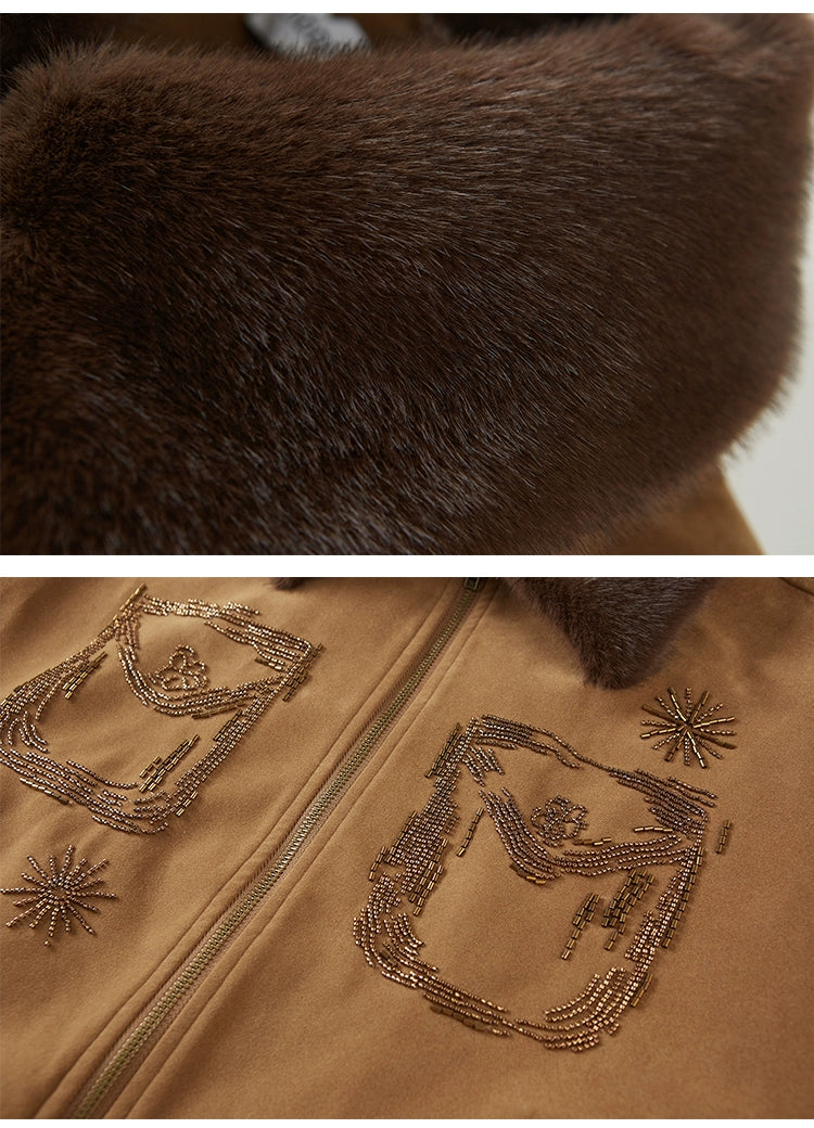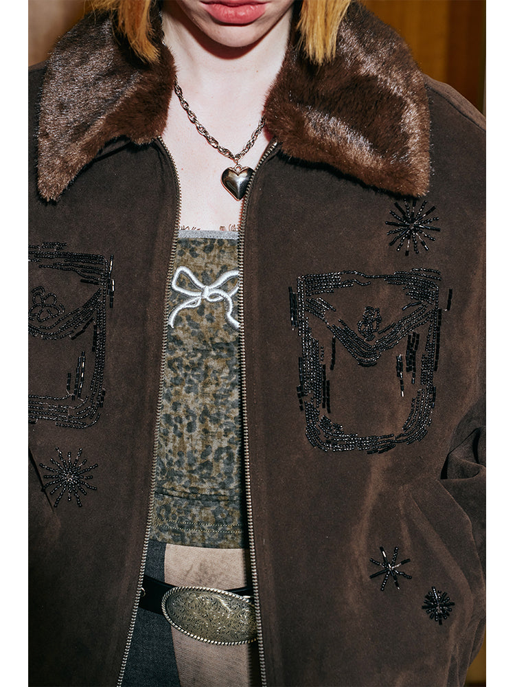 Beaded Suede-Style Jacket With Faux Fur Collar