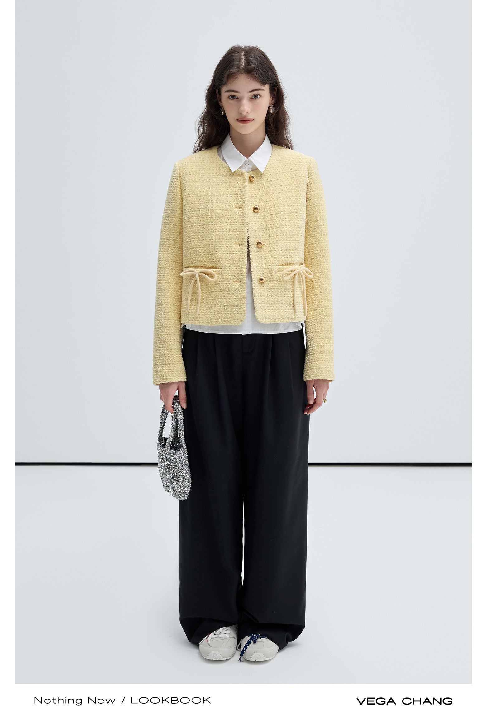 Bow Detail Collarless Tweed Wool Blend Jacket