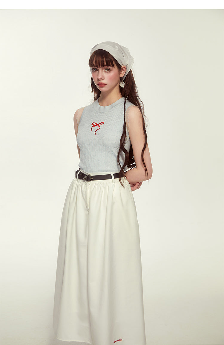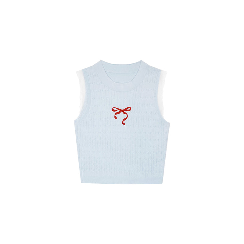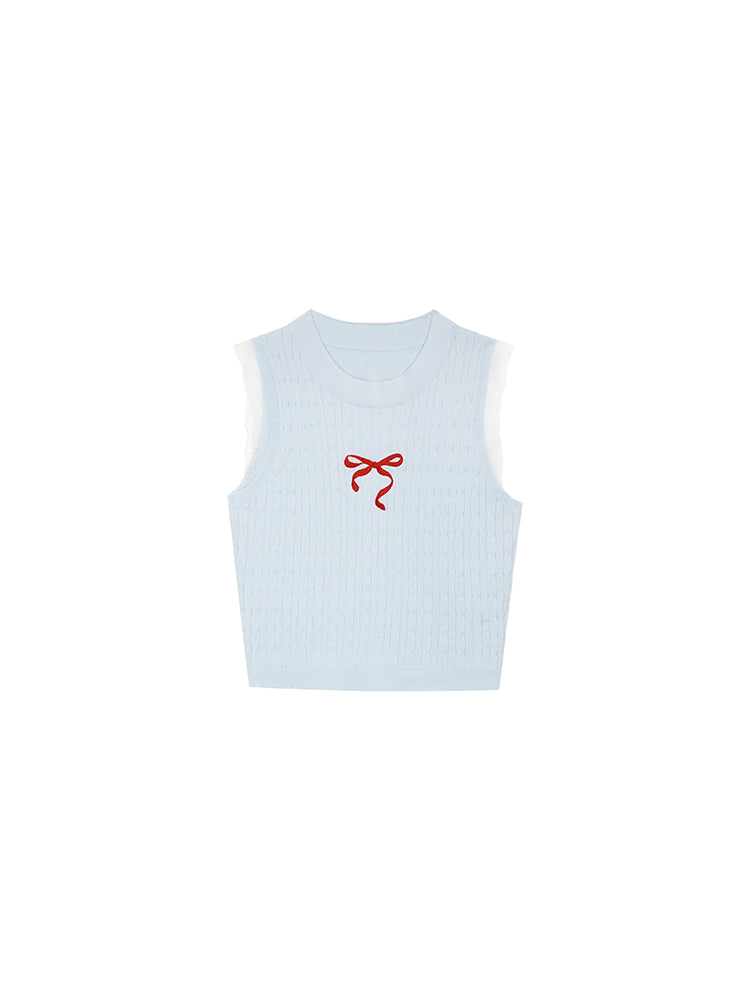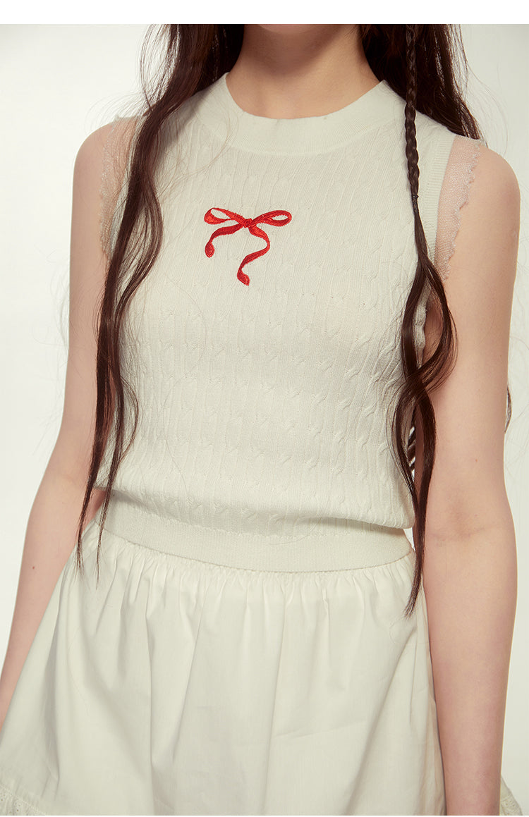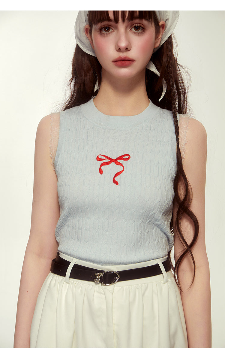 Bow-Embroidered Sleeveless Fitted Cable Knit Top