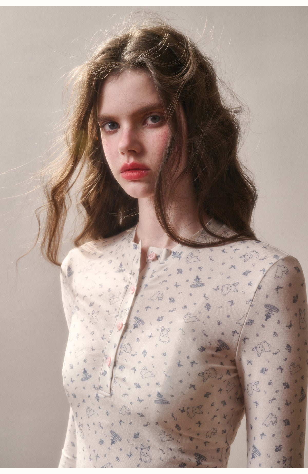 Bunny Print Henley Neck Ruffled T-Shirt