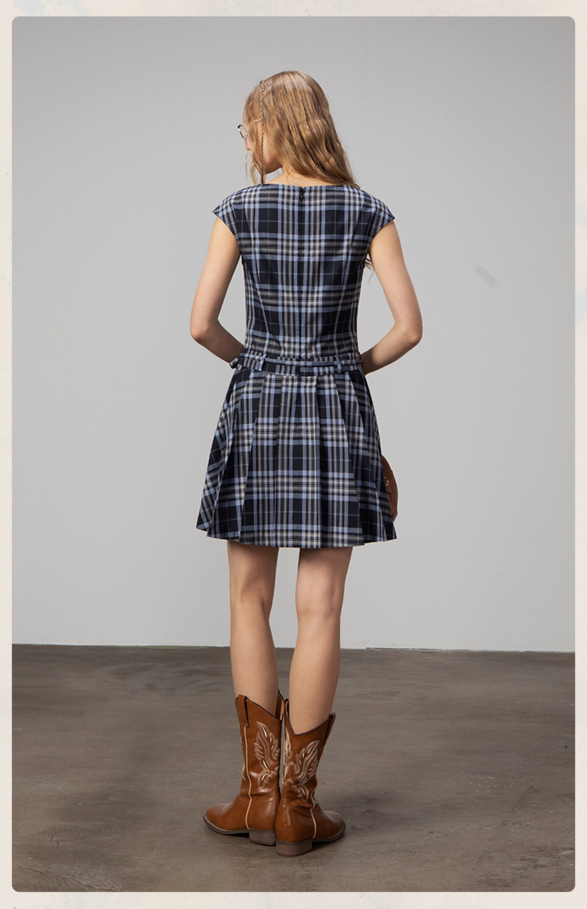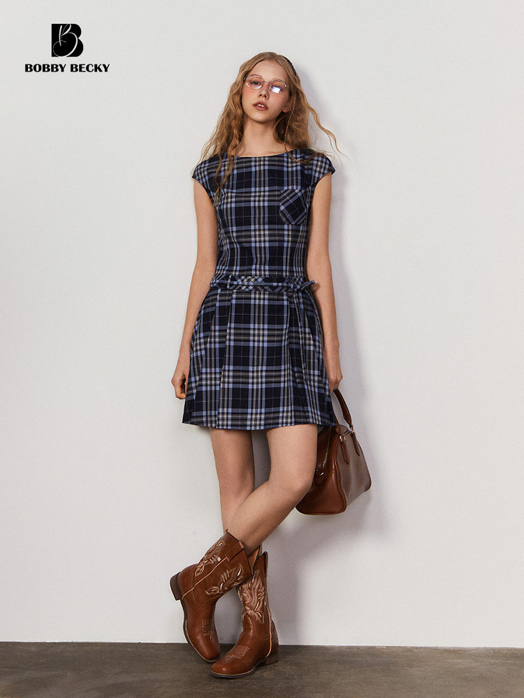Cap-Sleeve Plaid Dress With Waist Tie