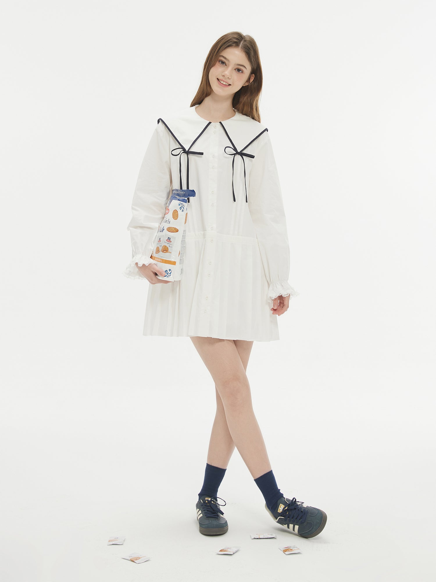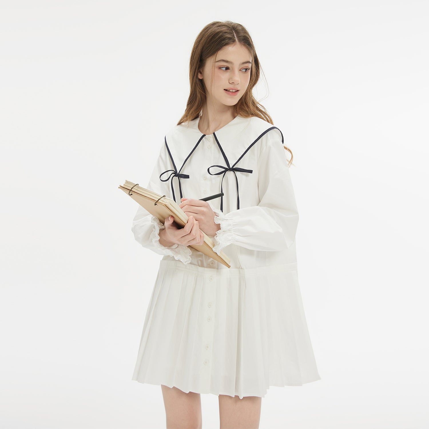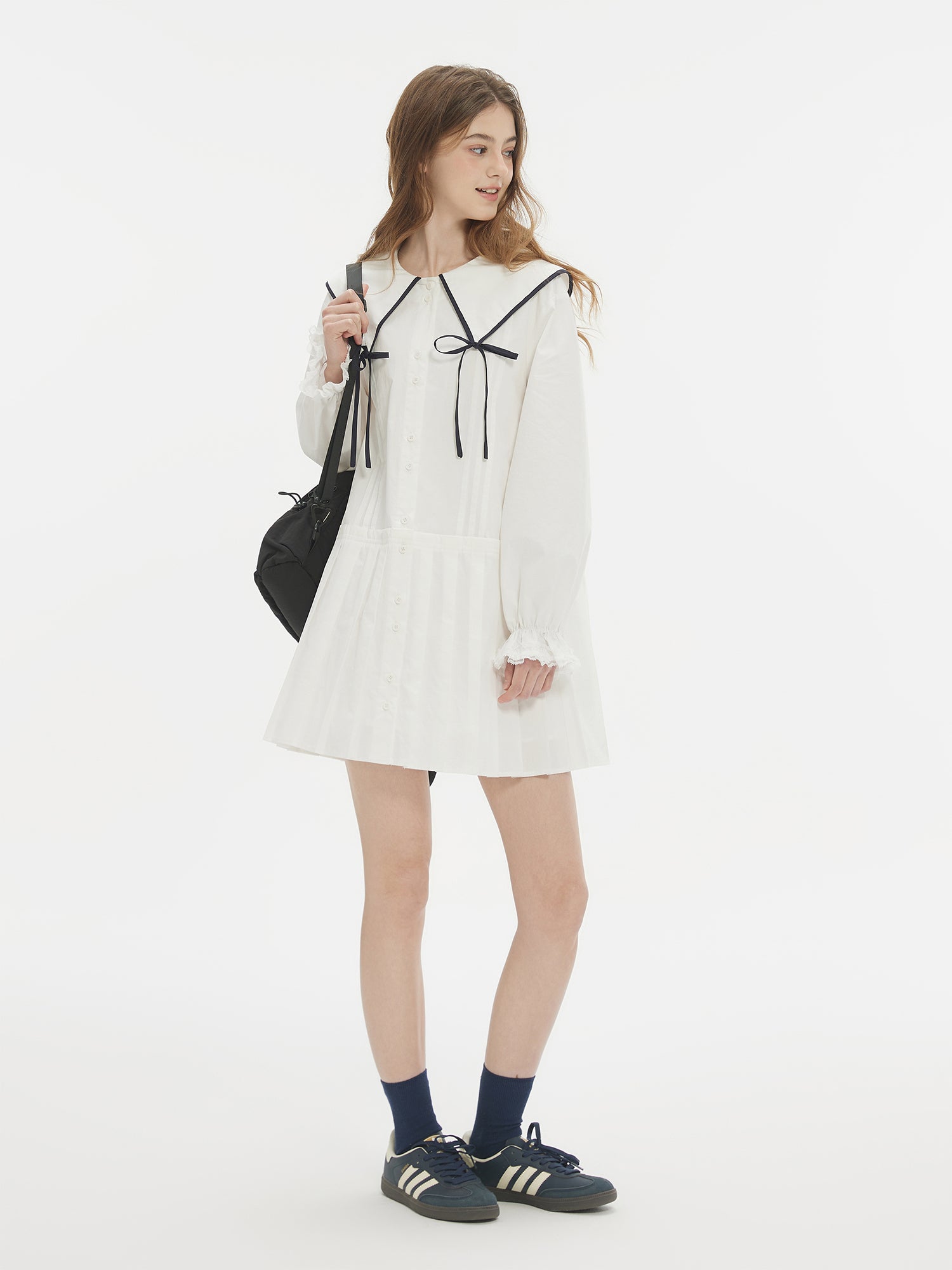 Contrast Trim Large Ribbon Collar Pleated Dress