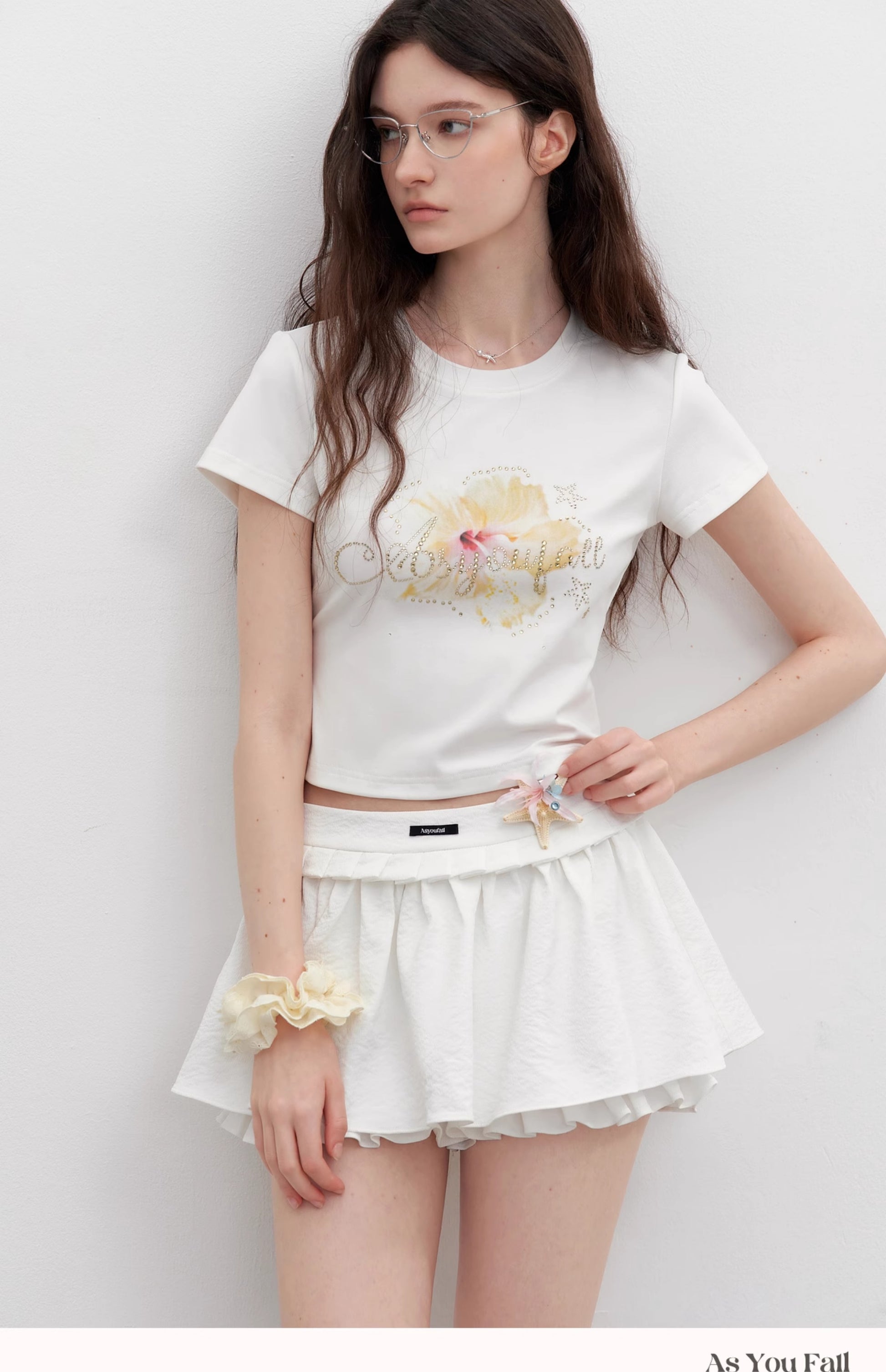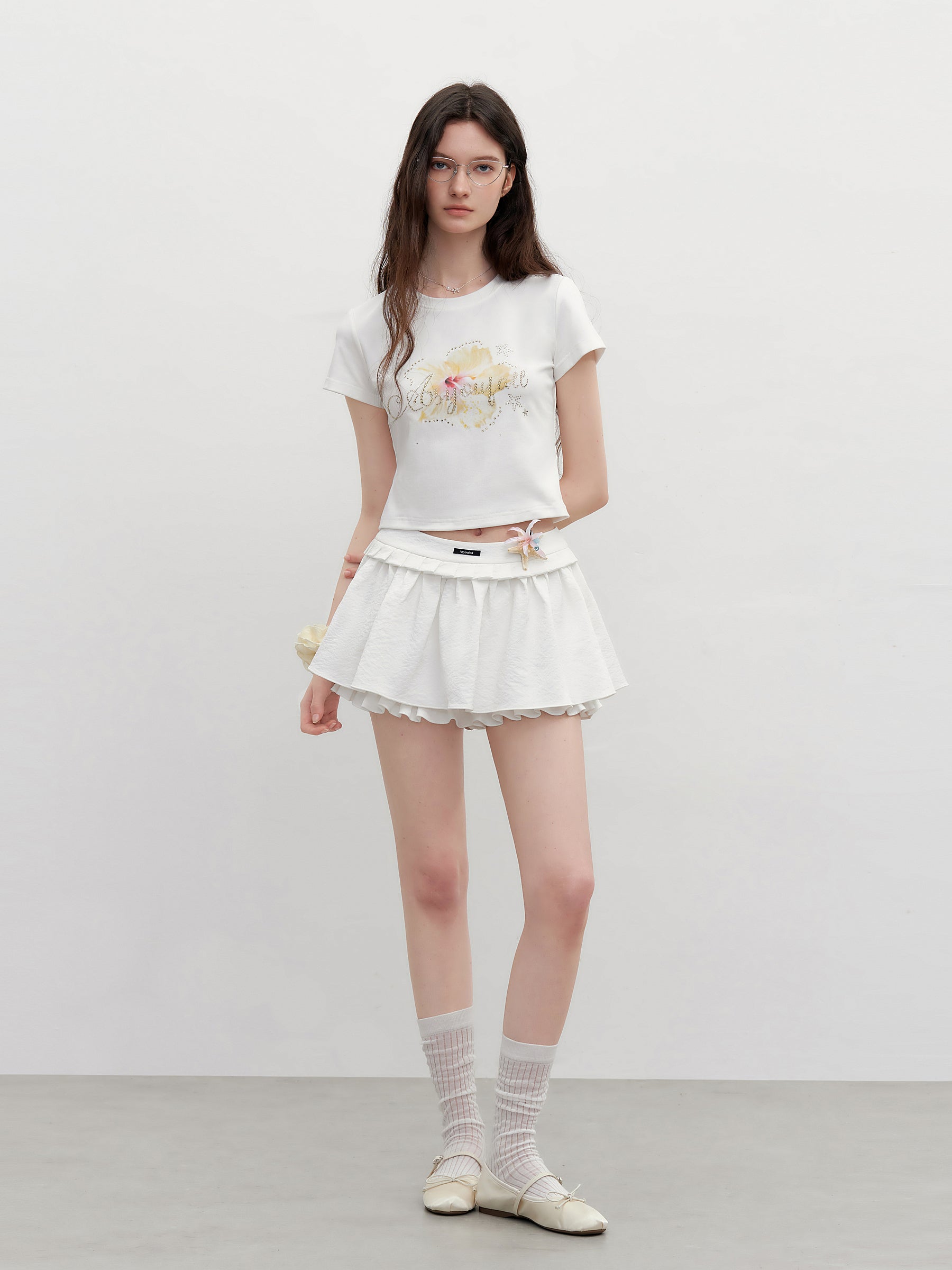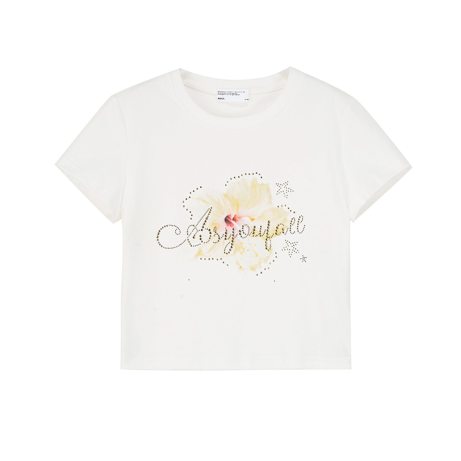 Cropped Ribbed T-Shirt With Rhinestone Flower Print