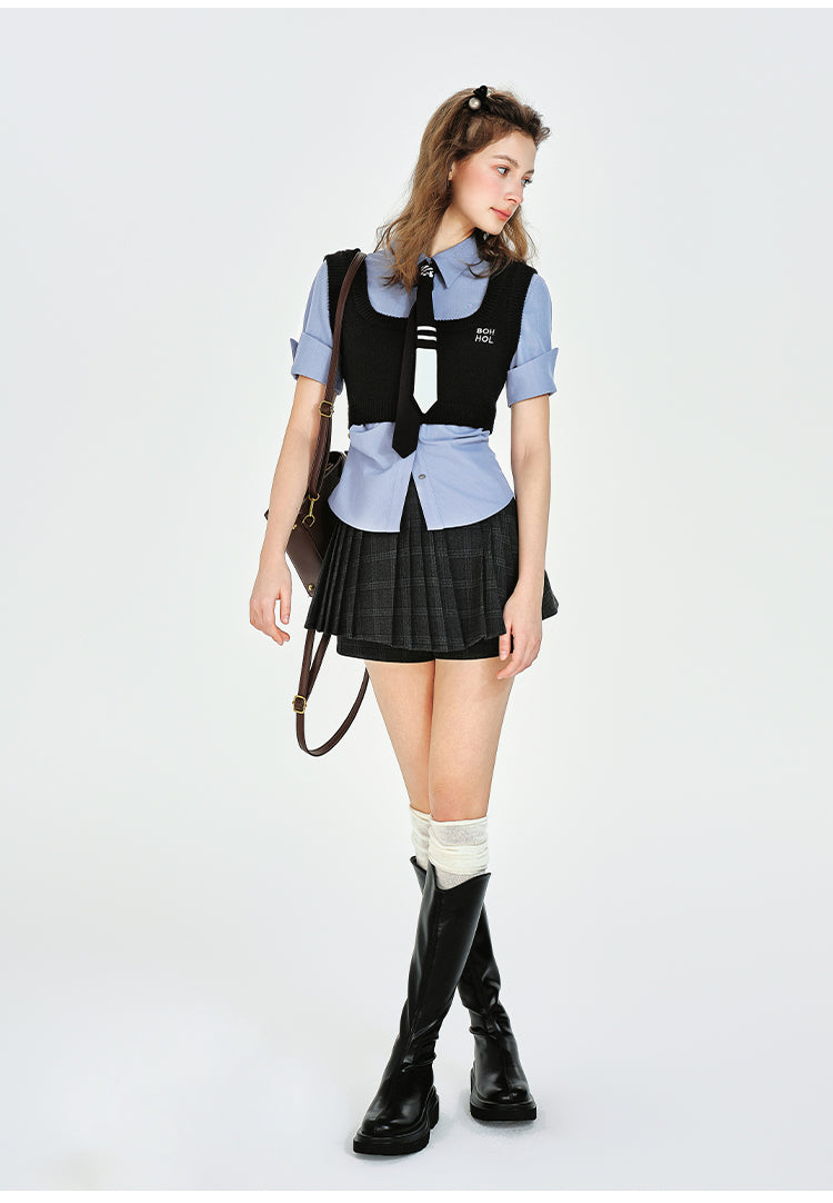 Cropped Vest, Half-Sleeve Shirt With Tie, Plaid Pleat Skort