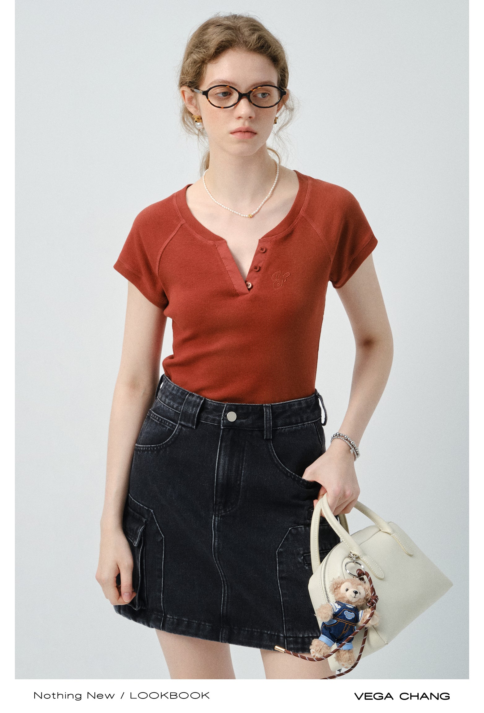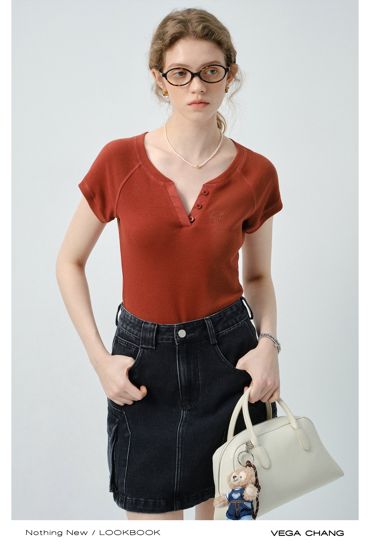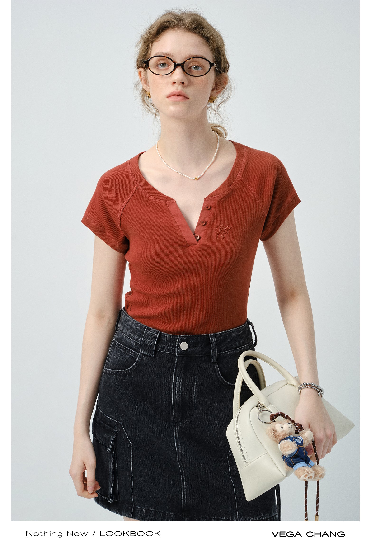 Embroidered Henley Neck Raglan Ribbed T-Shirt