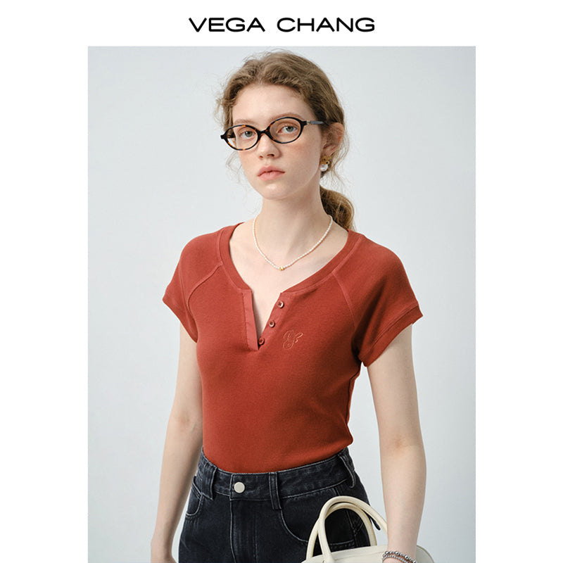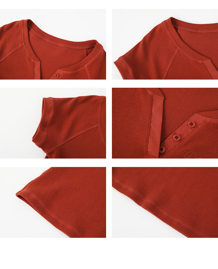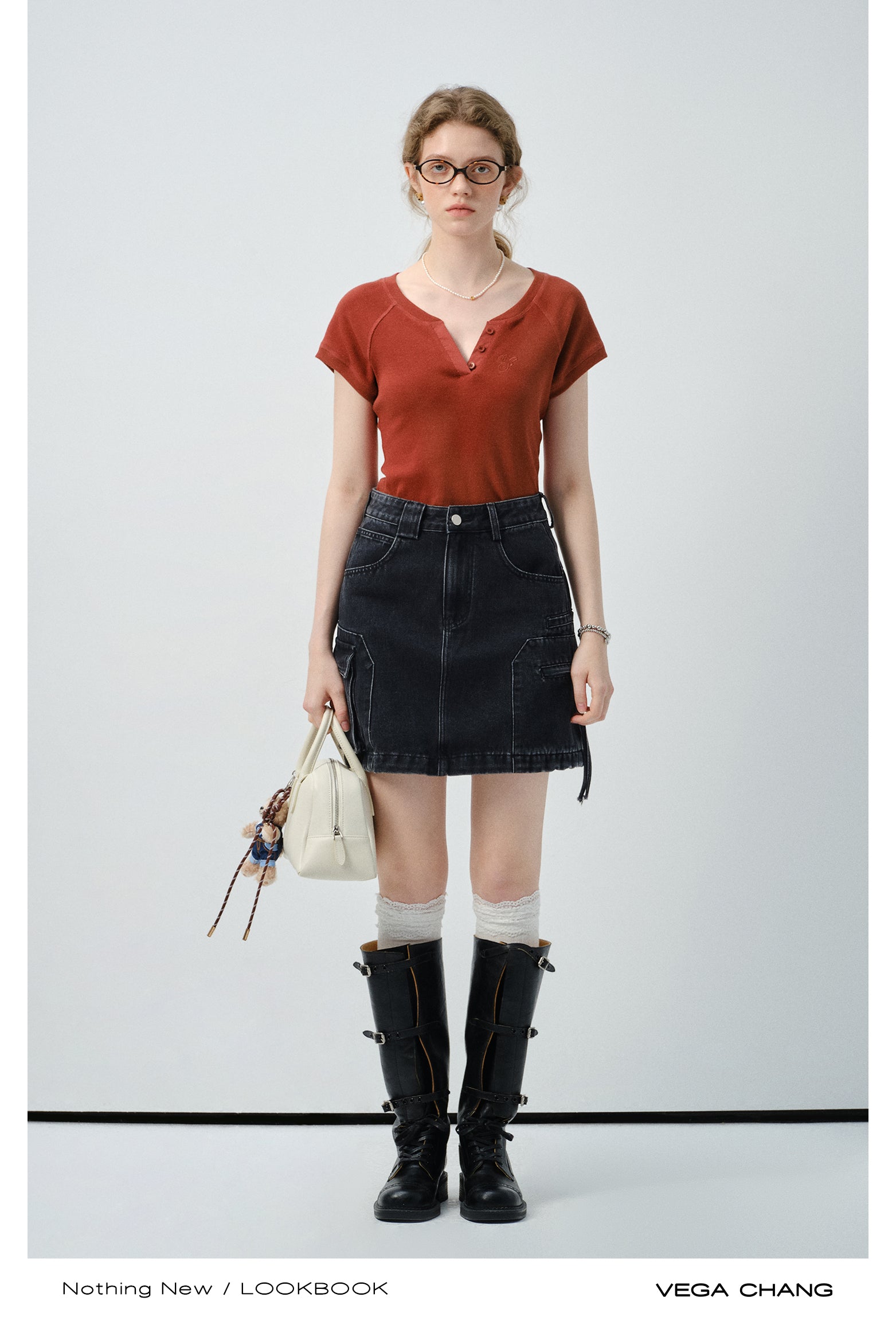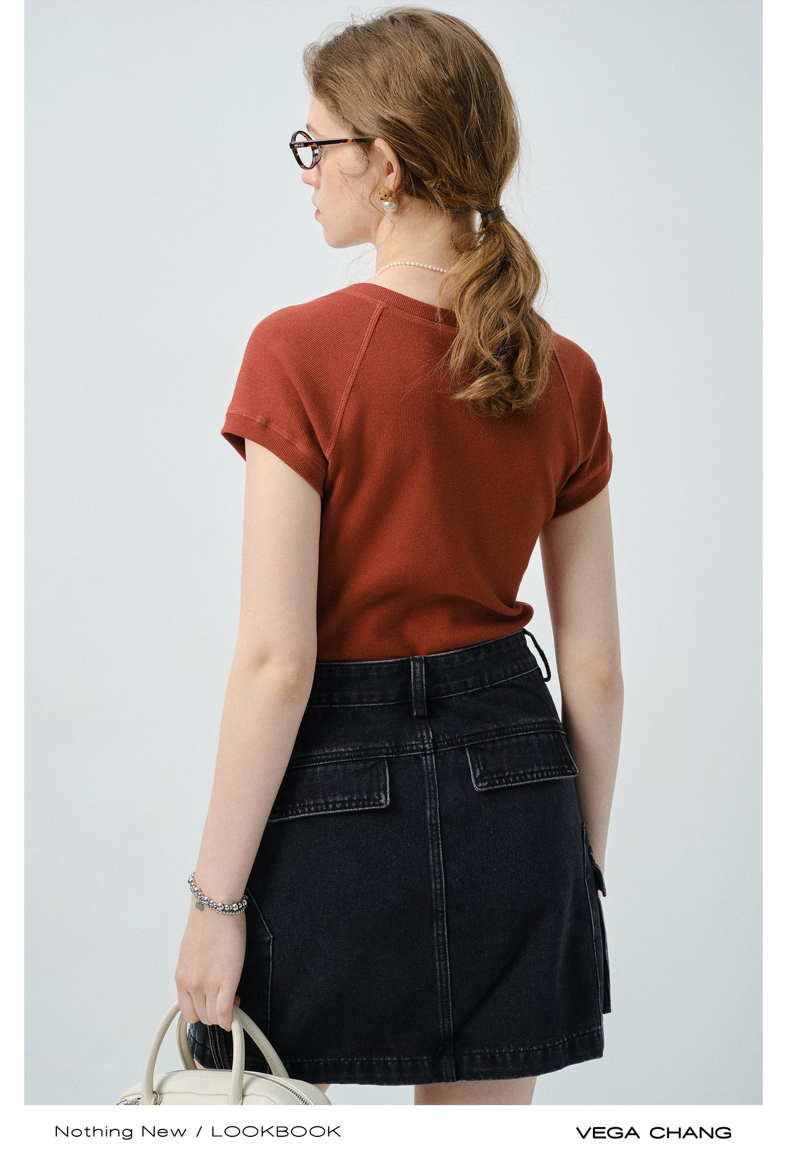 Embroidered Henley Neck Raglan Ribbed T-Shirt
