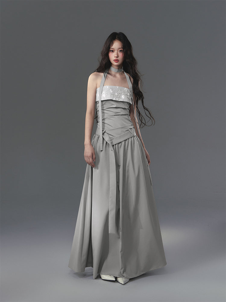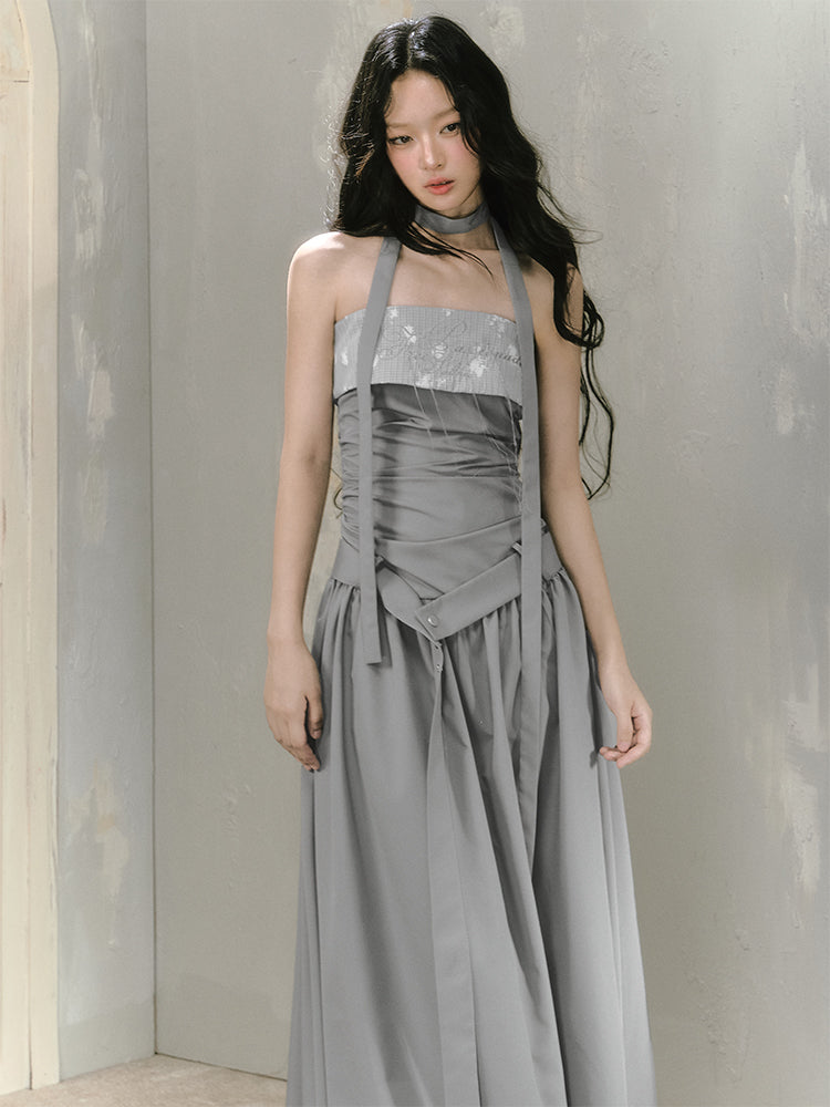 Embroidered Ruched Dress With Neckband And Belt