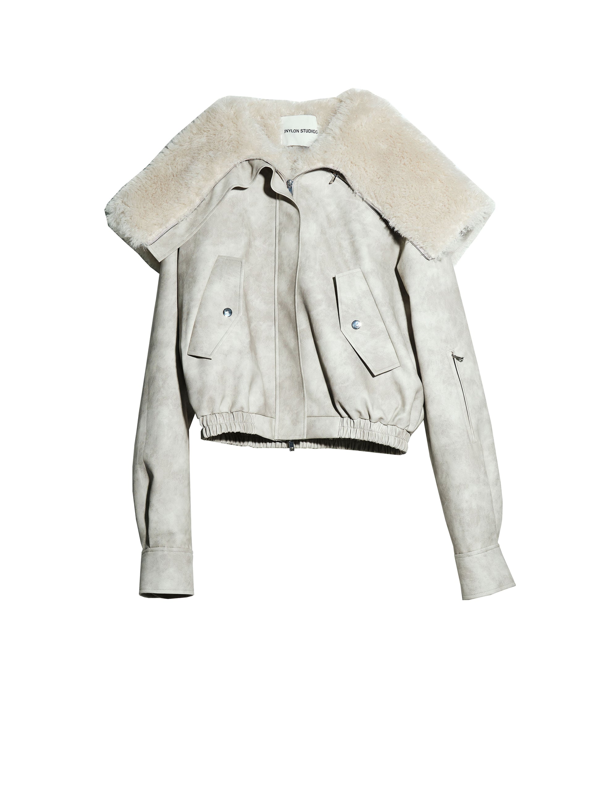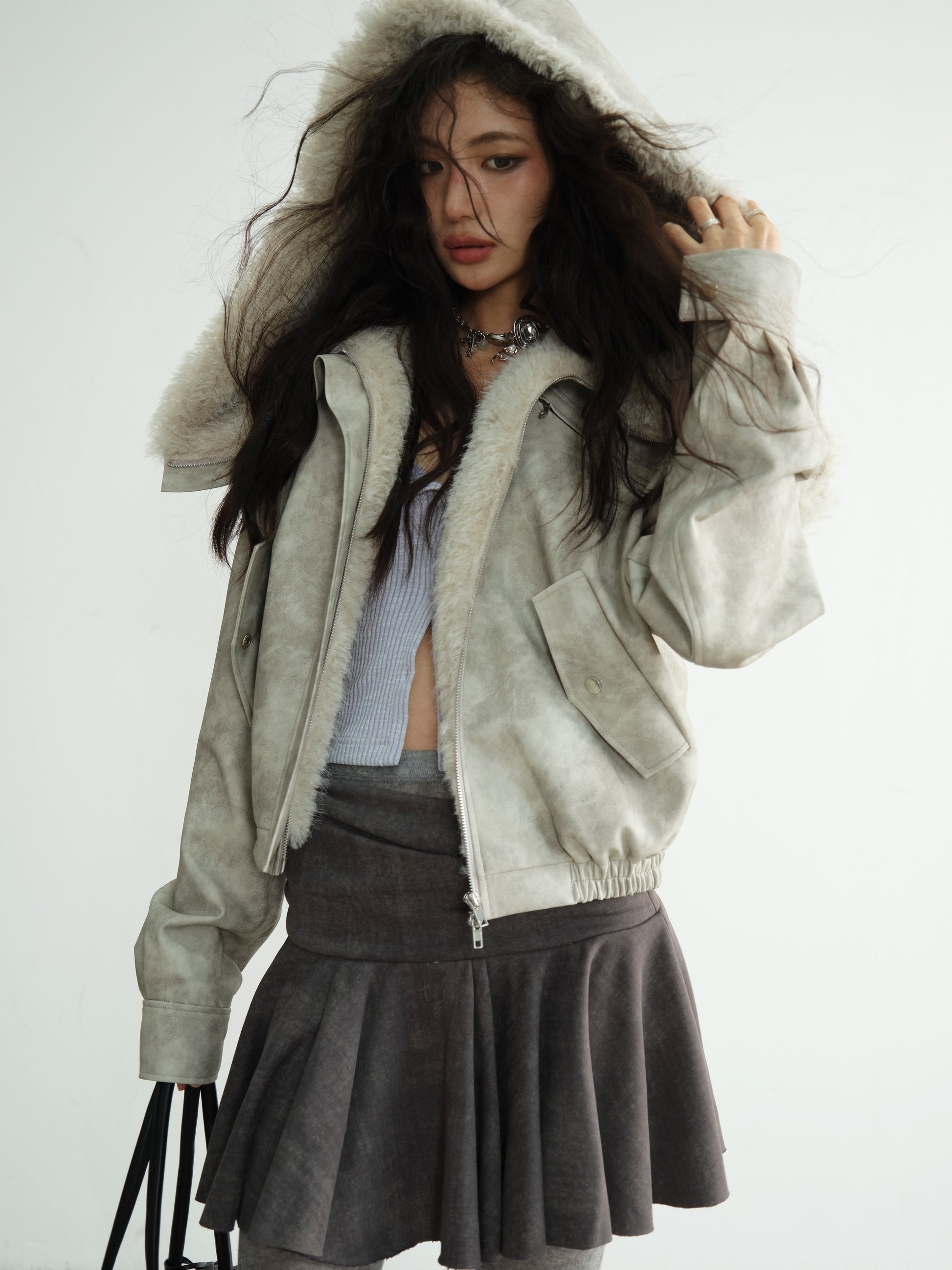 Faux Leather Jacket With Plush Oversized Fur Hood