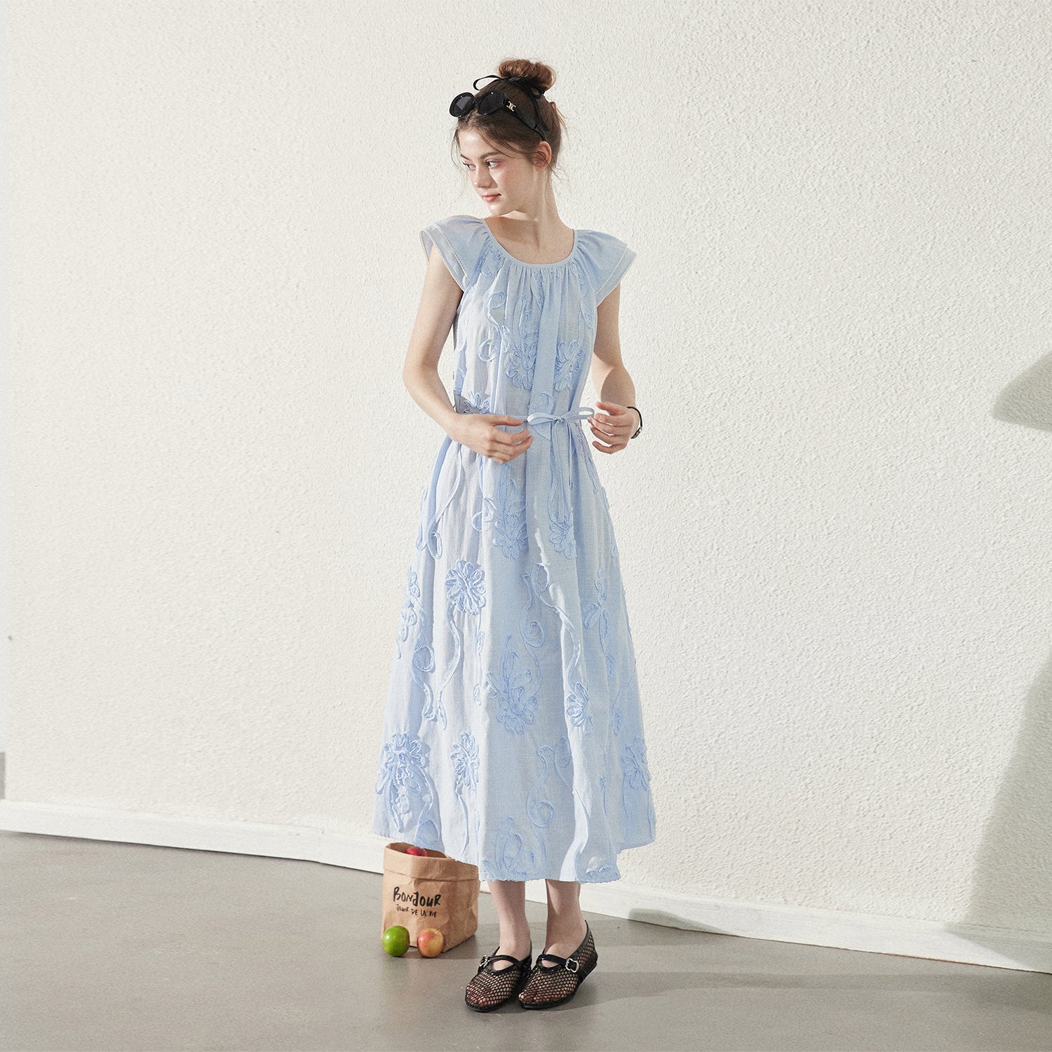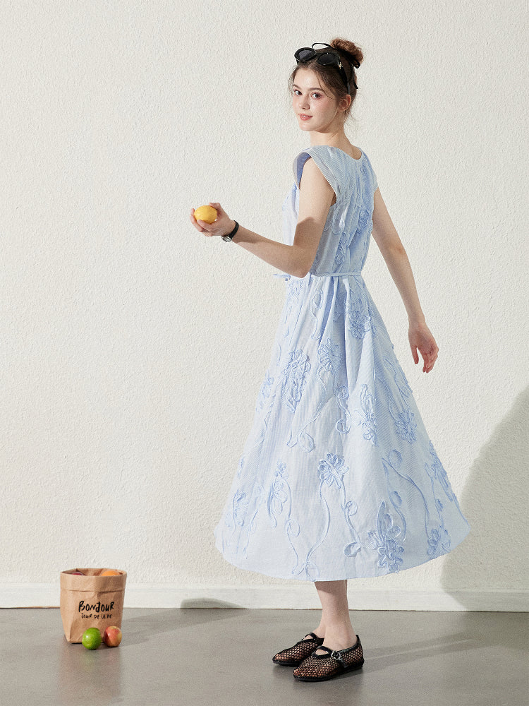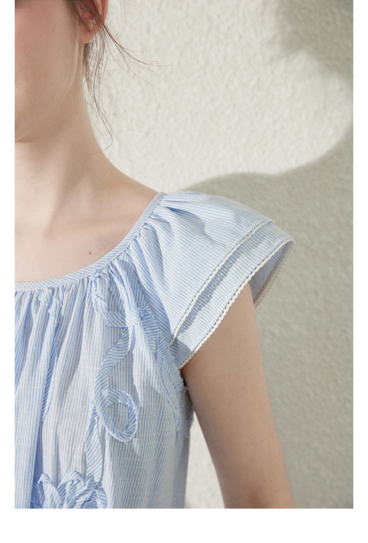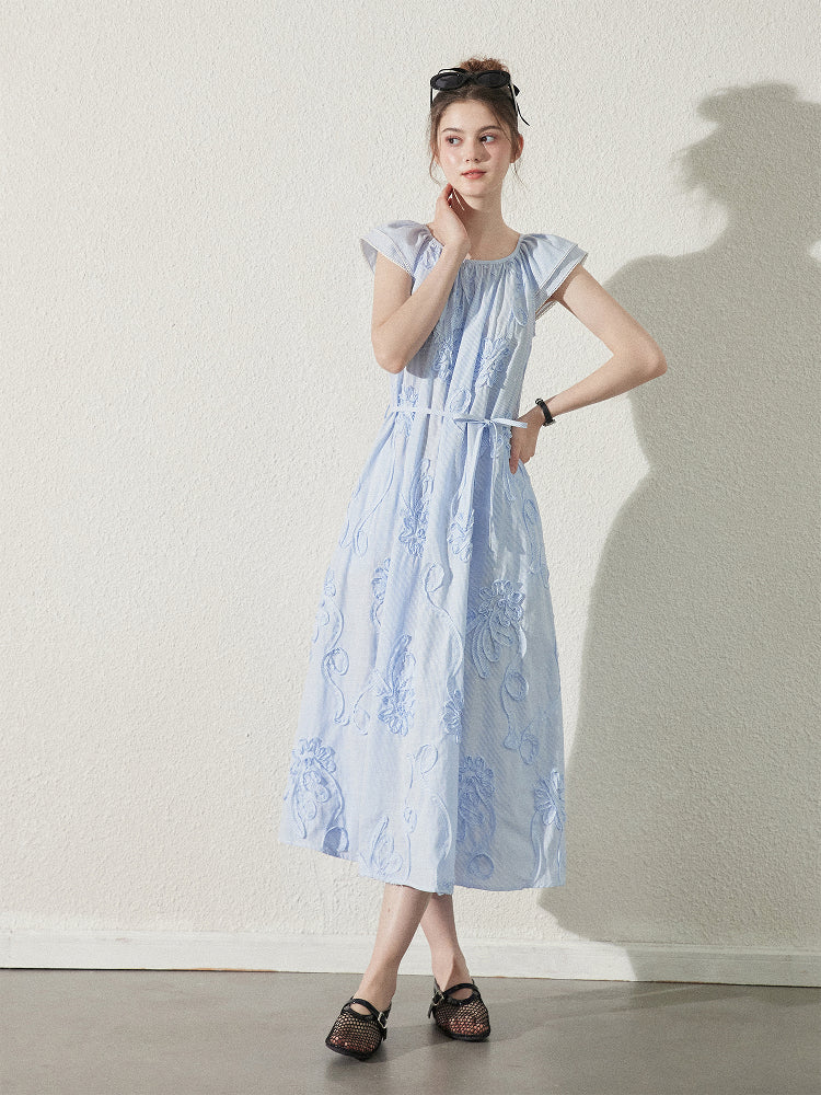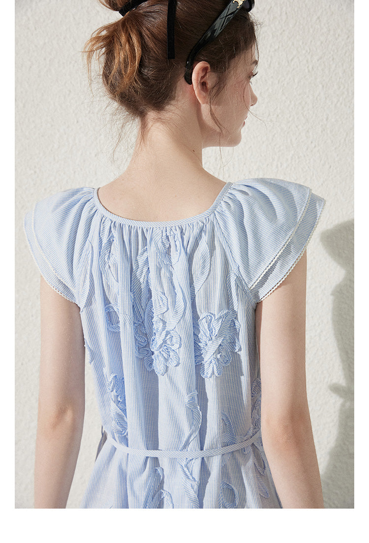 Floral Embellished Striped Dress With Butterfly Sleeves