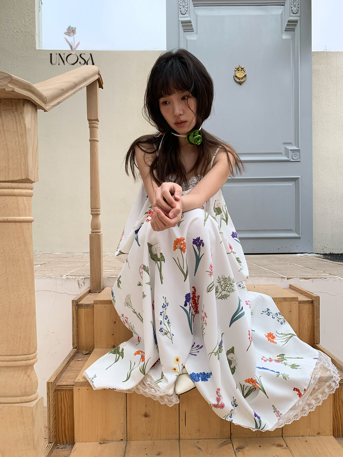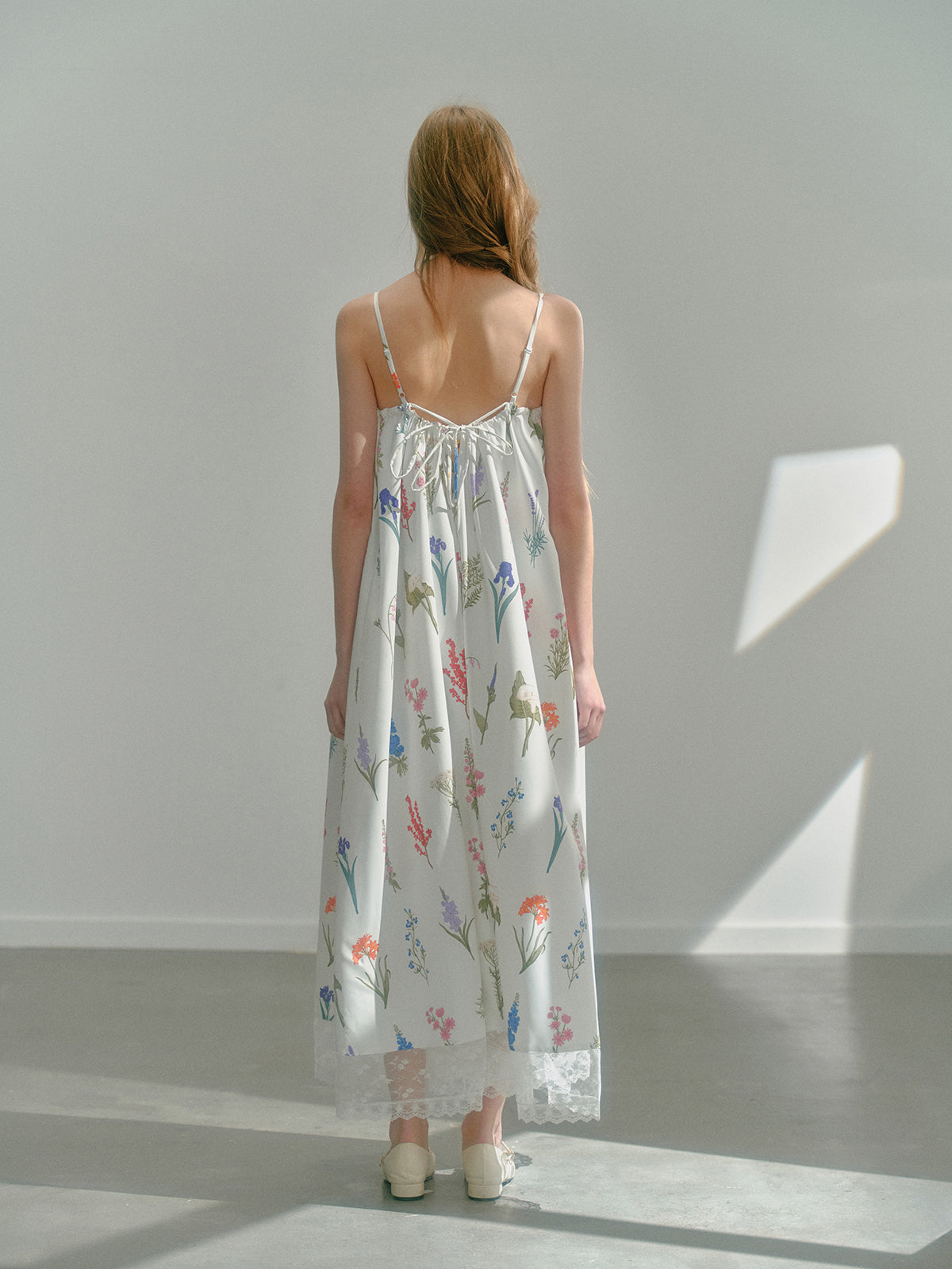 Flower Motif Lace Trim Strappy Long Flowy Dress