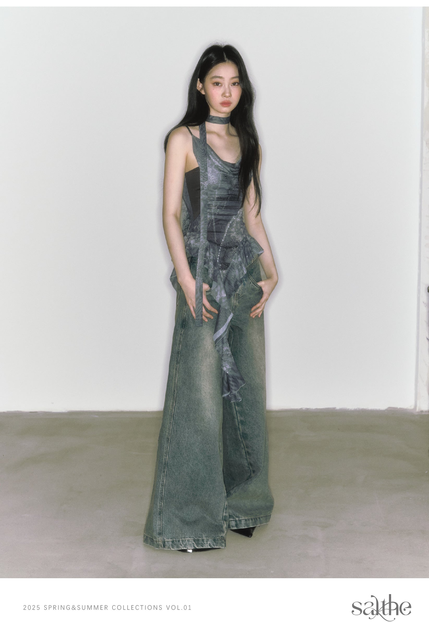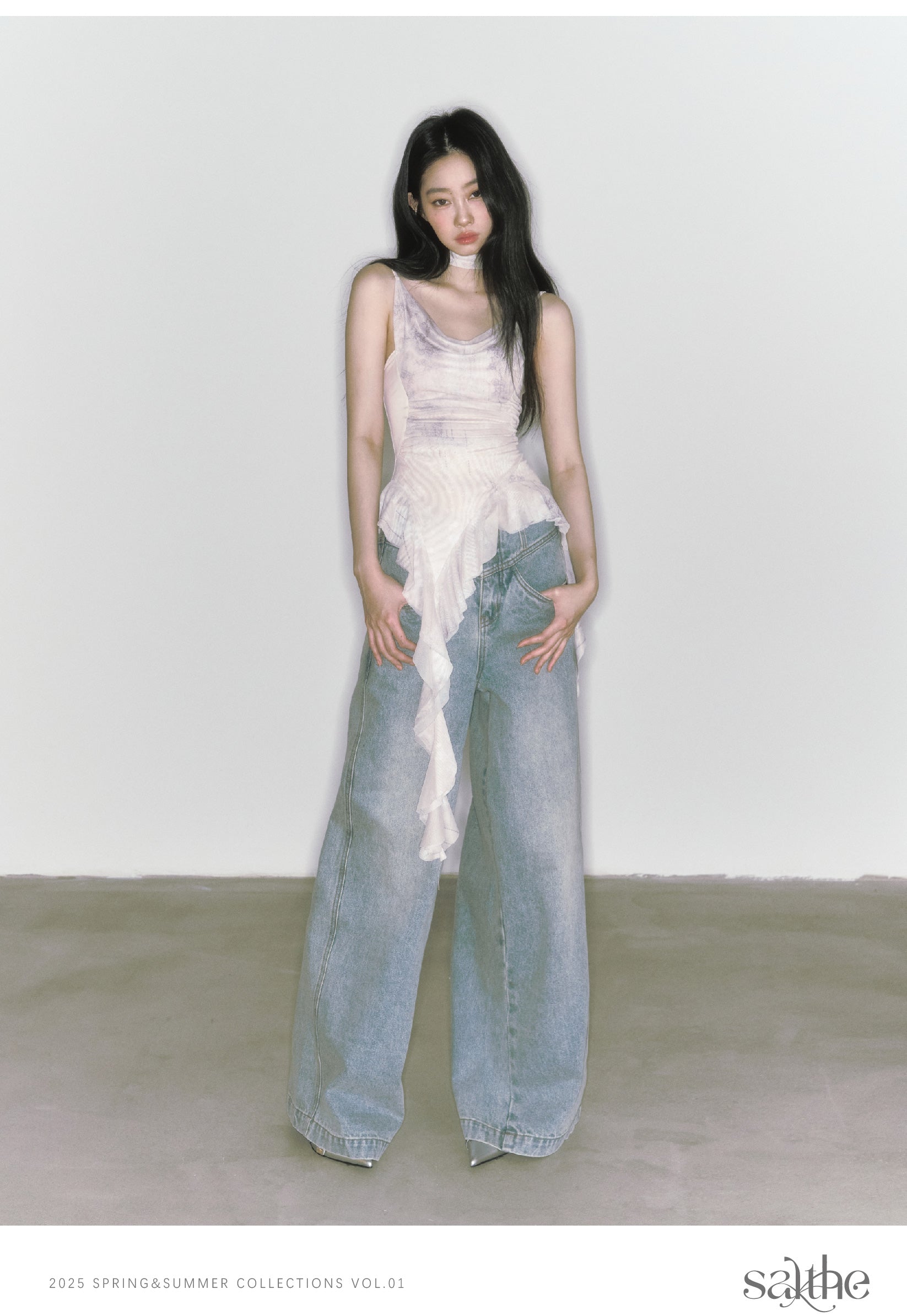 Fringed V-Waist Wide-Leg Washed Or Distressed Jeans