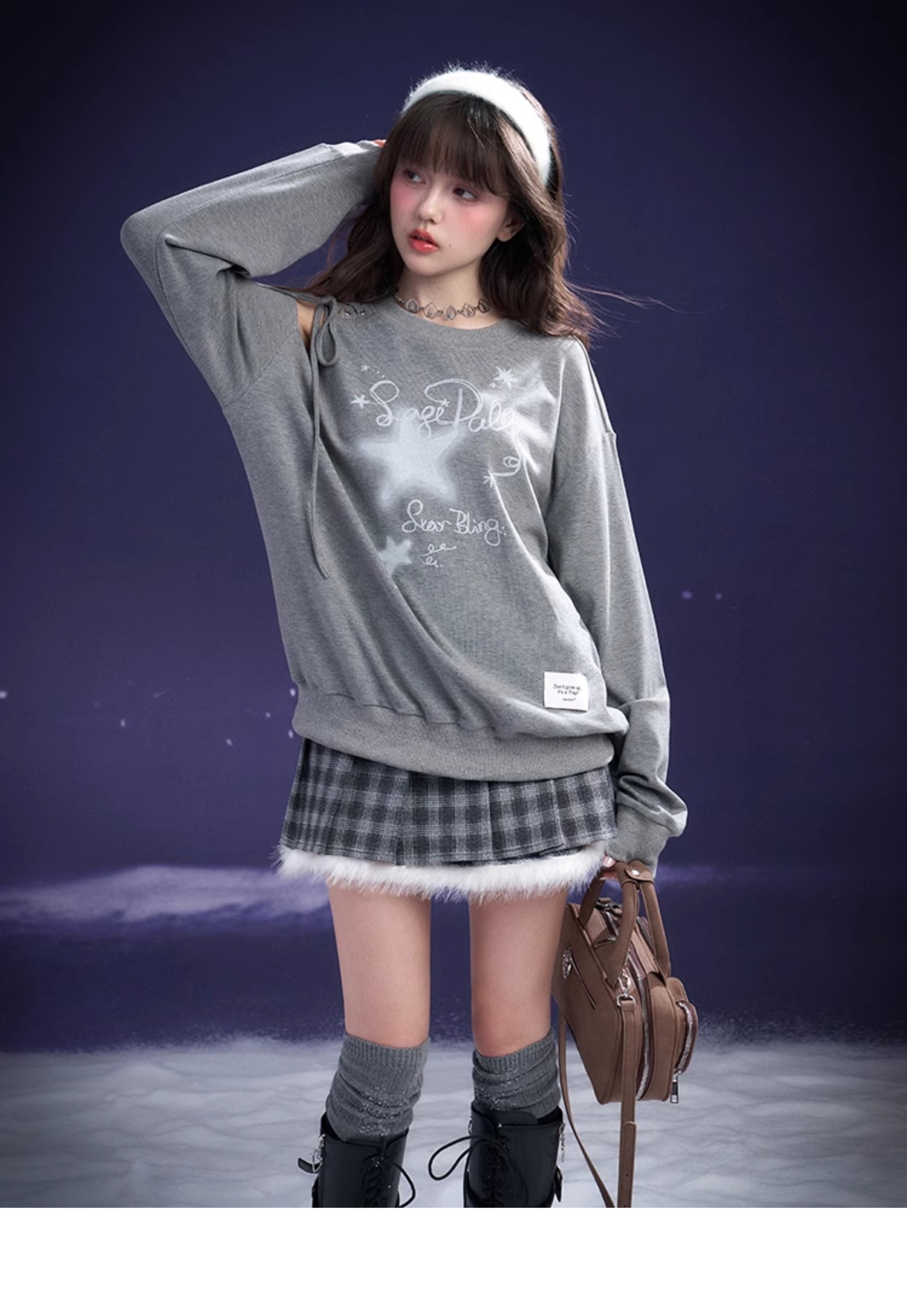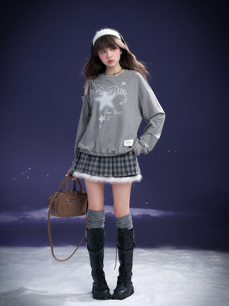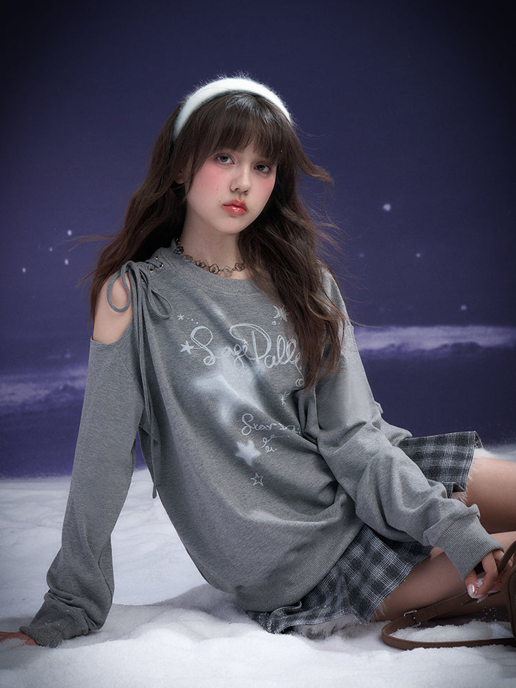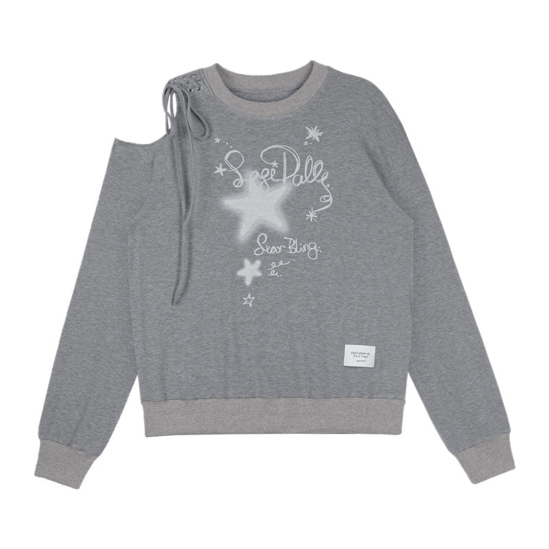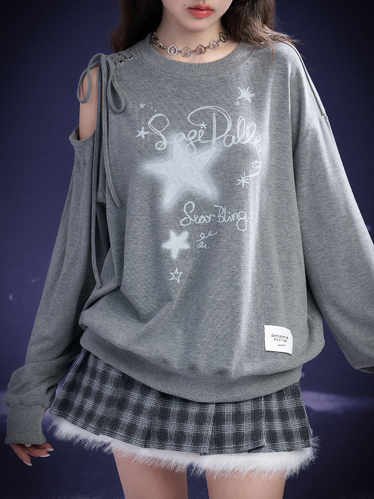 Graffiti Print Lace-Up Cut-Out Shoulder Sweatshirt