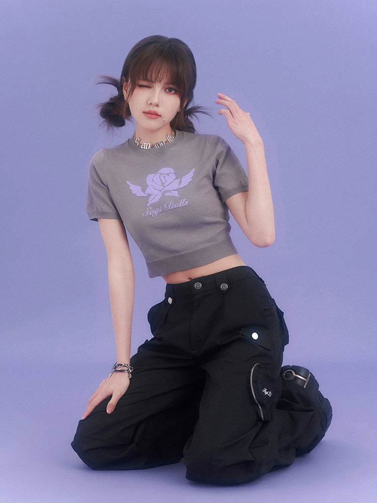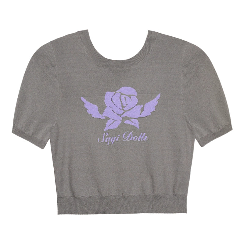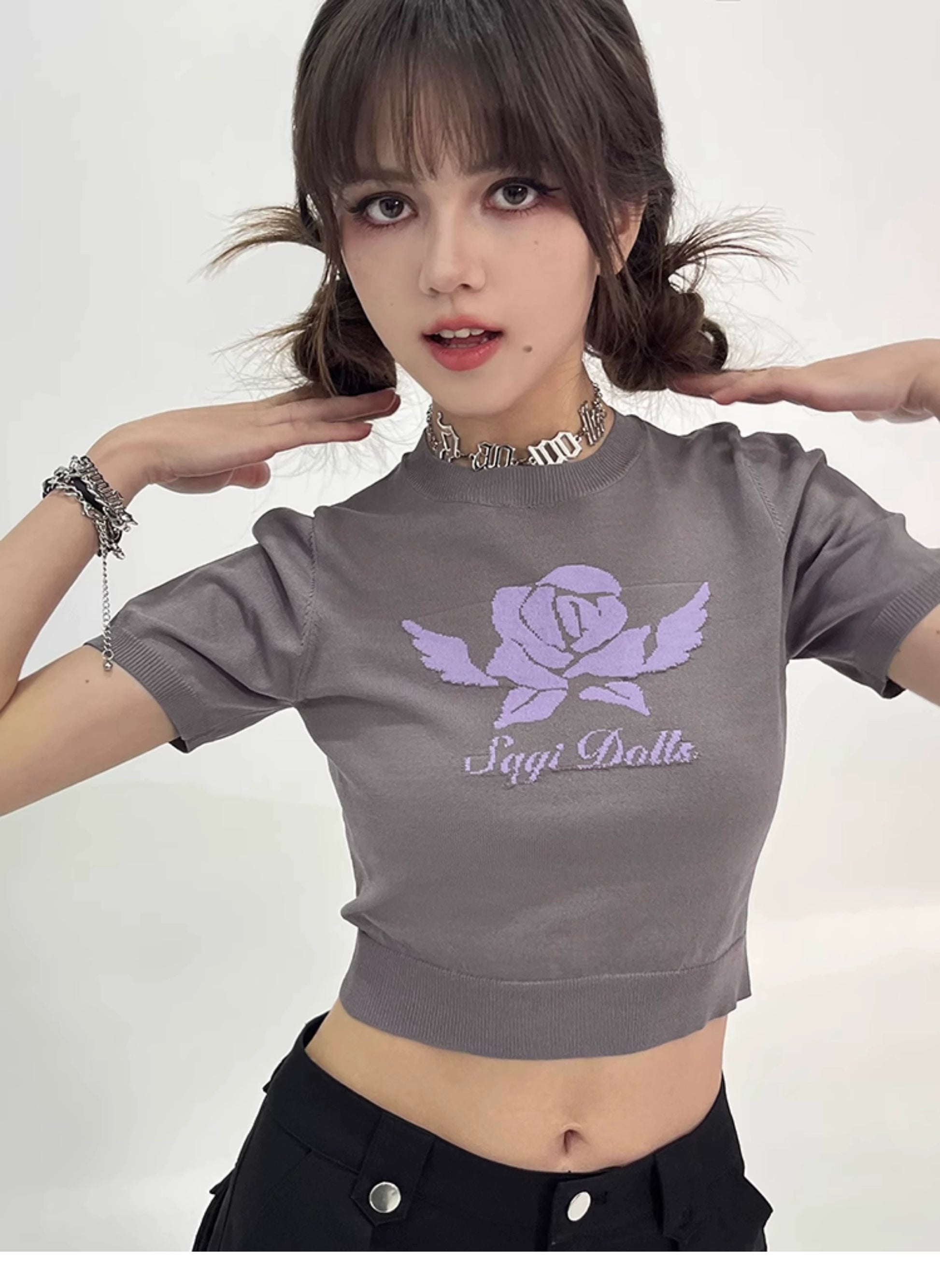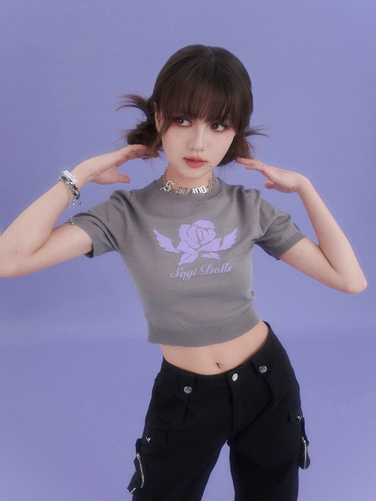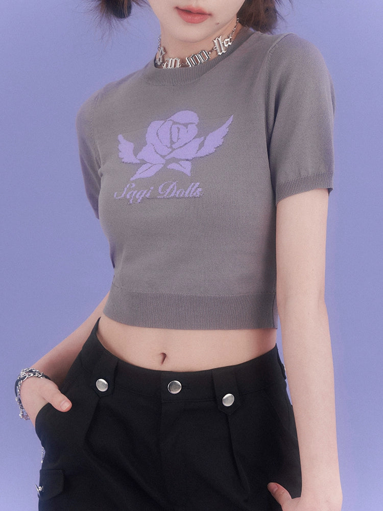 Jacquard Rose Motif Round Neck Cropped Knit T-Shirt