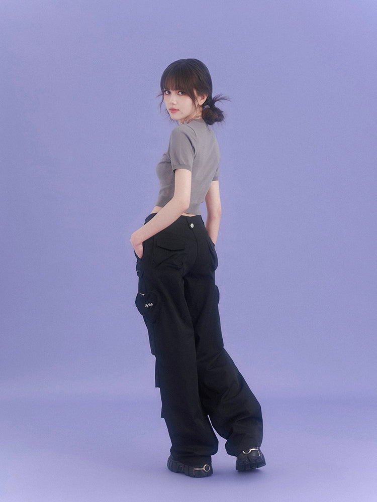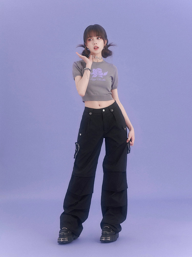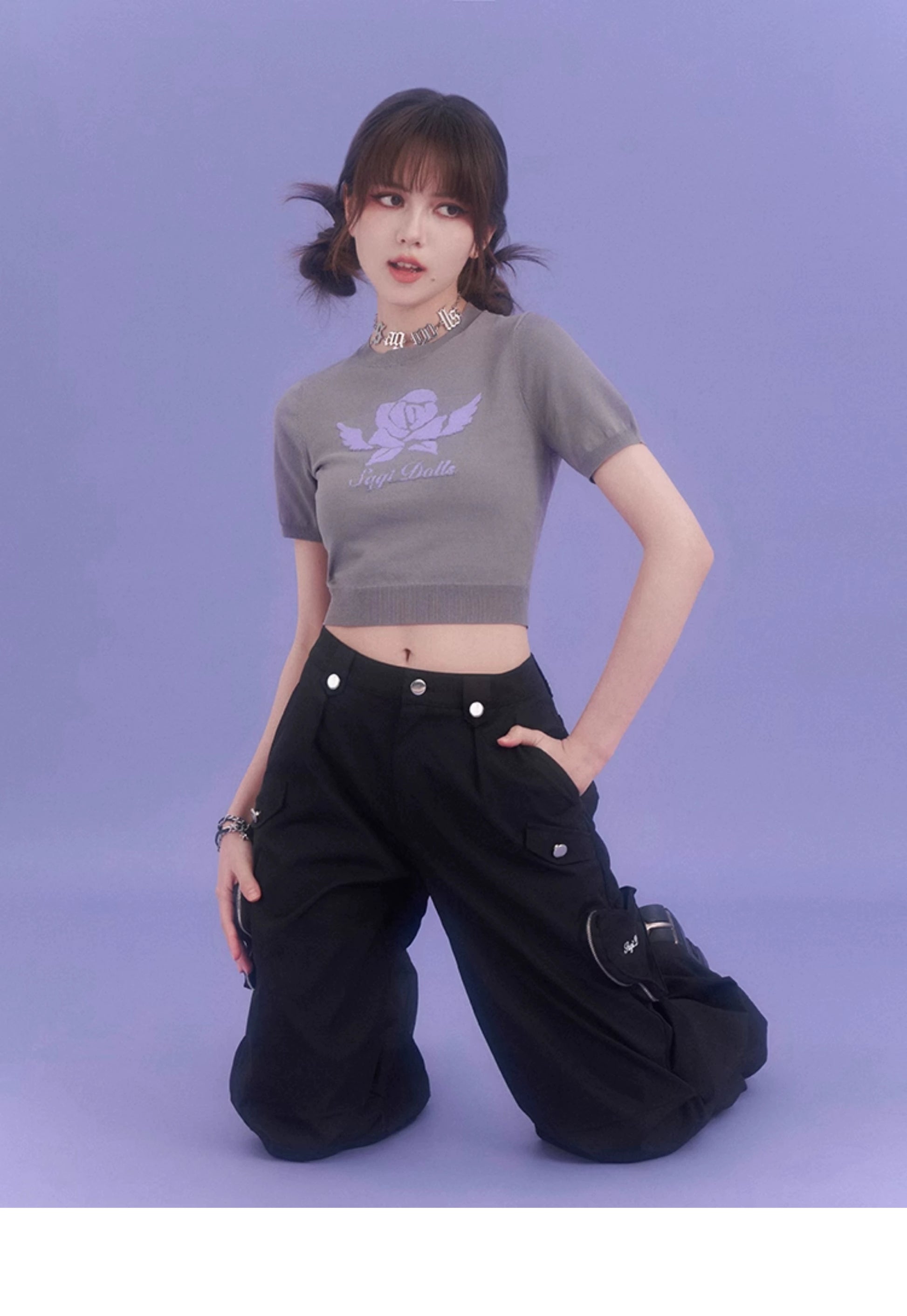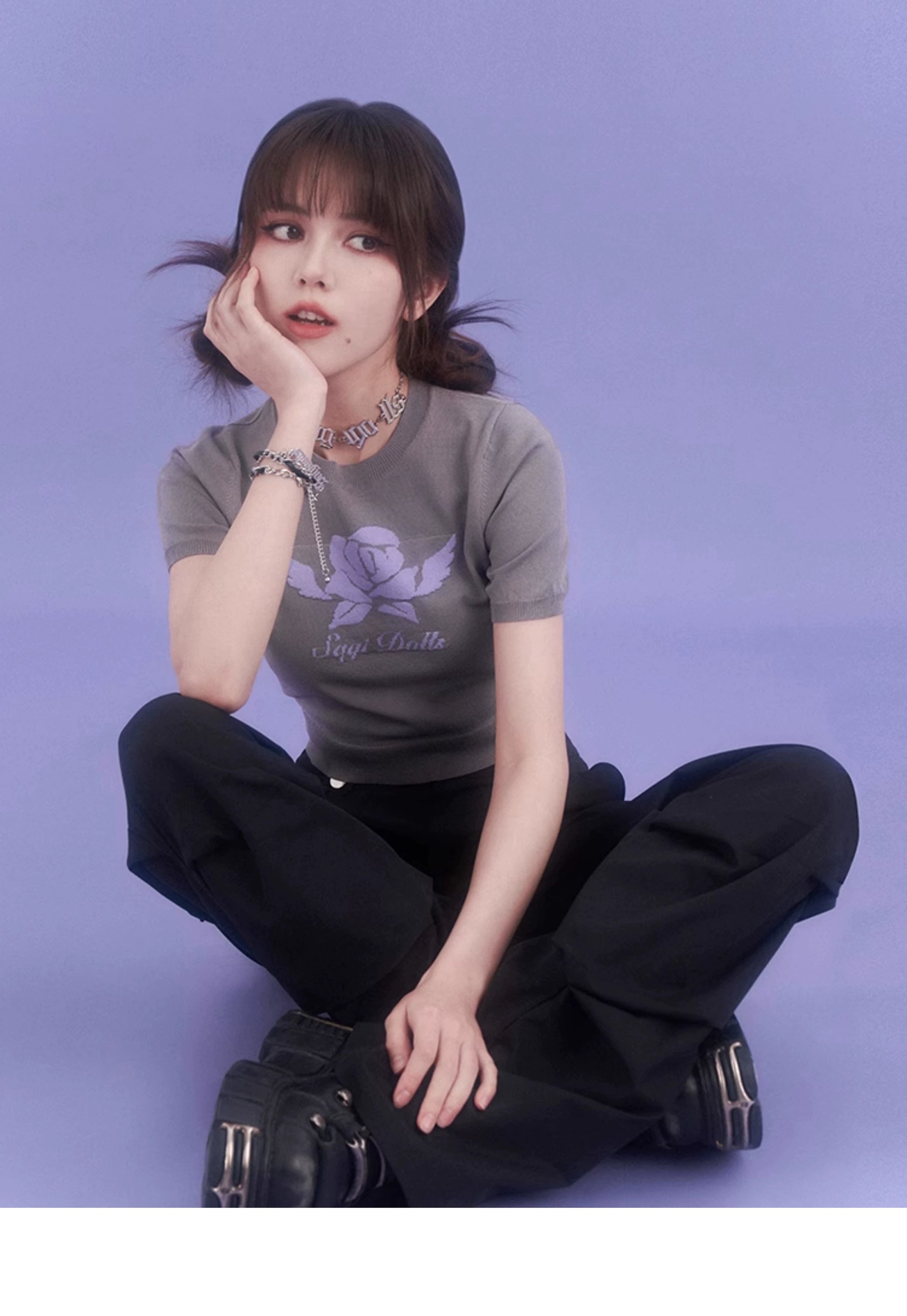 Jacquard Rose Motif Round Neck Cropped Knit T-Shirt