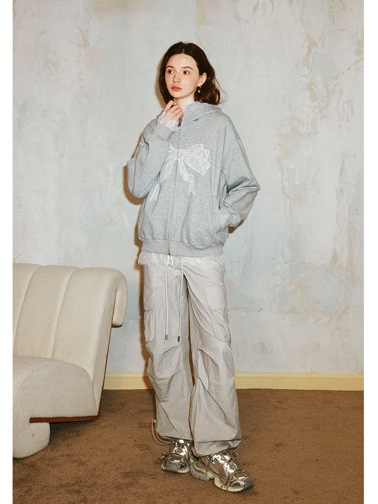 Lace Bow Zip-Up Hoodie