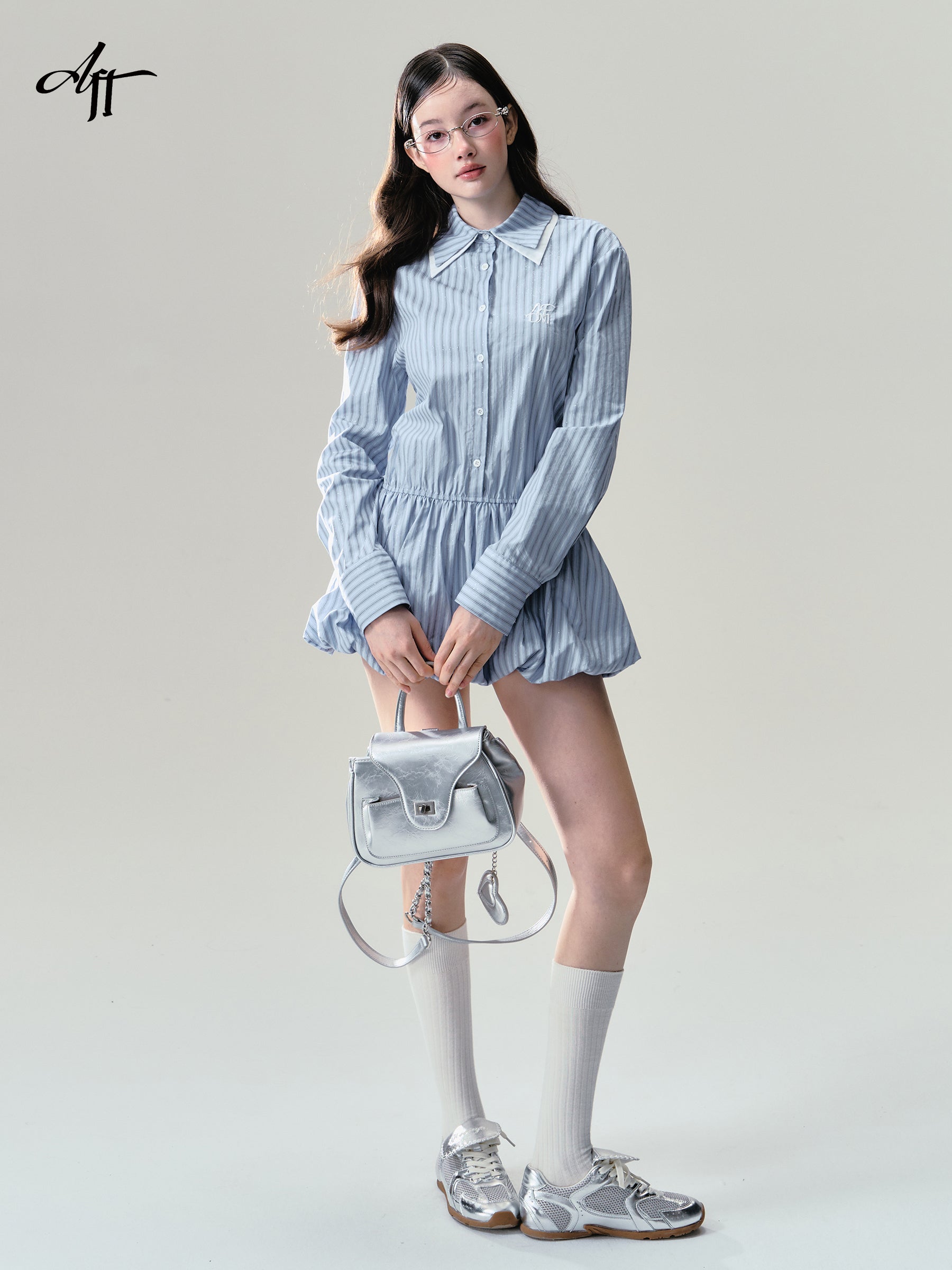 Layered Collar Glitter Striped Balloon Shirt Dress
