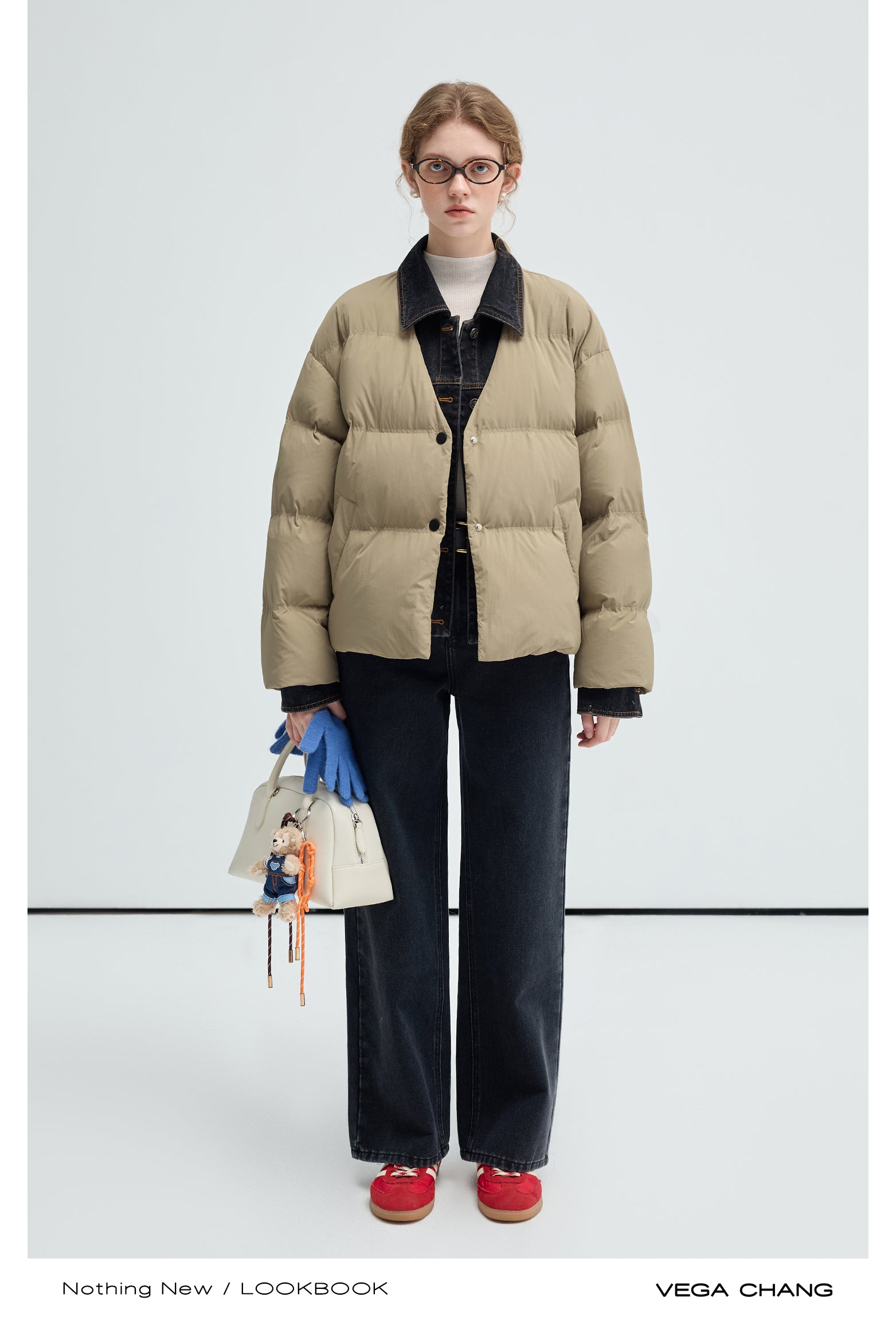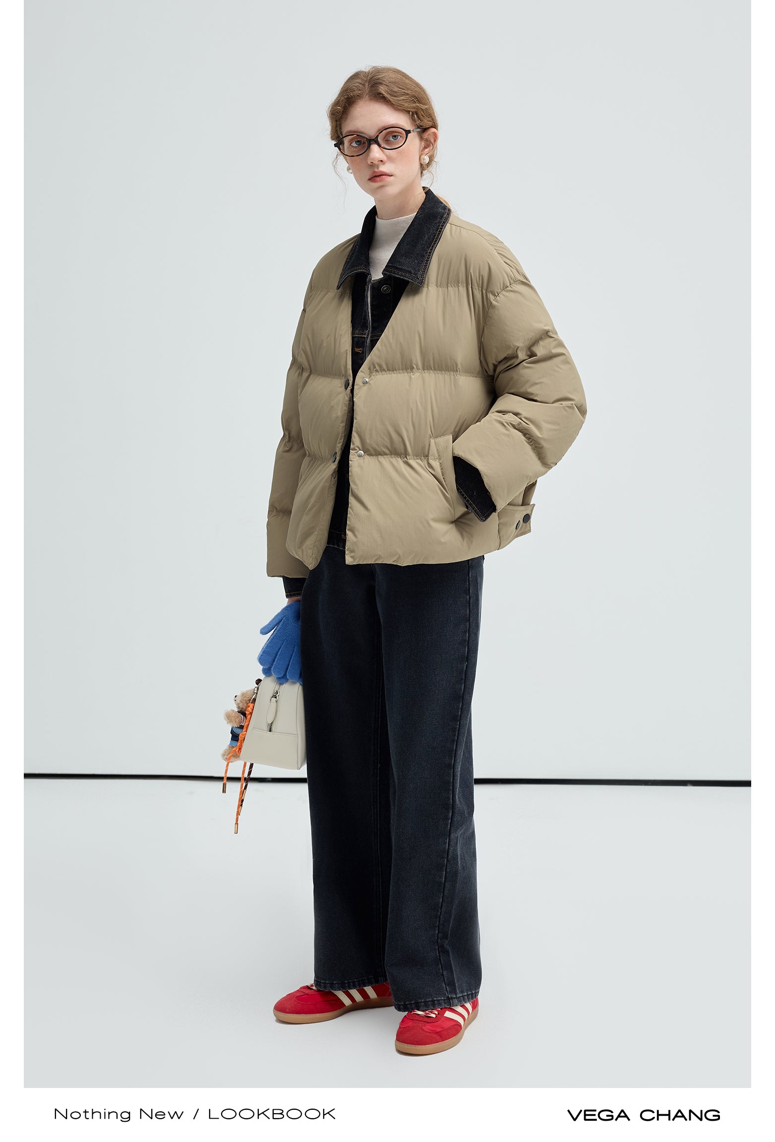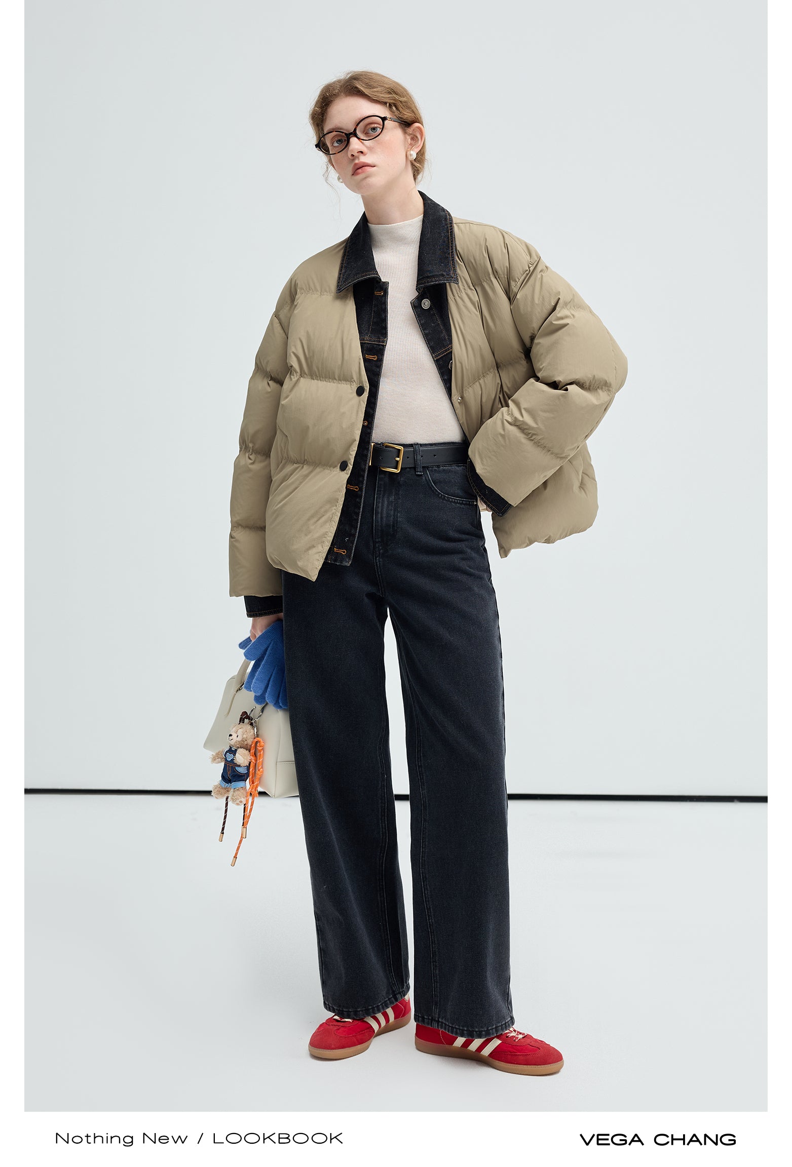 Layered-Look Duck Down Denim Collar Puffer Jacket