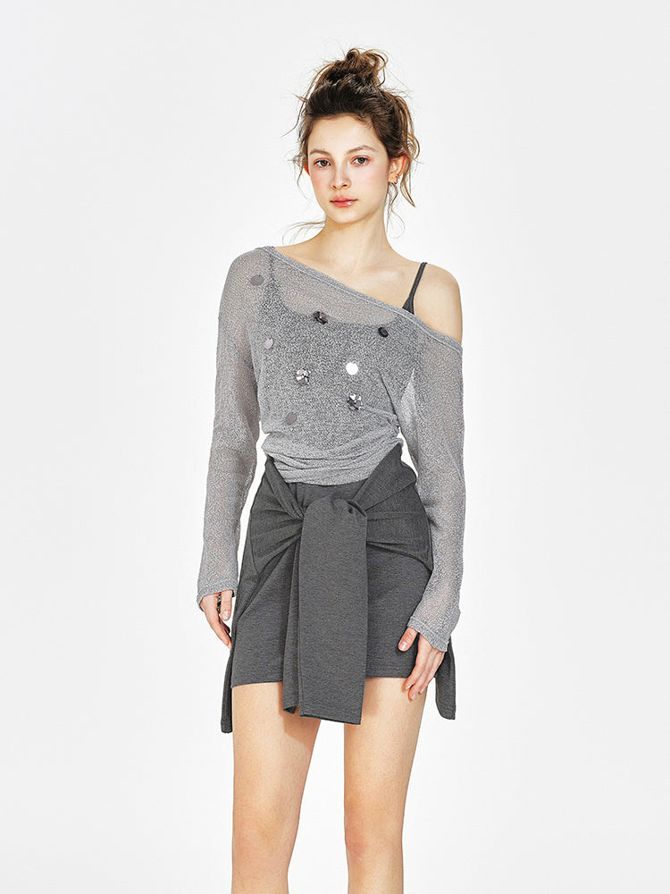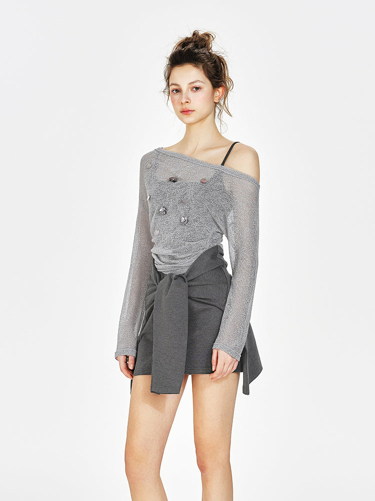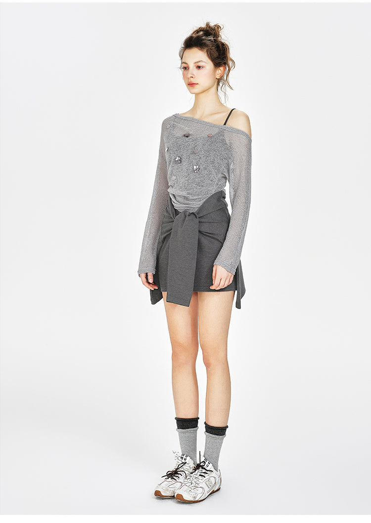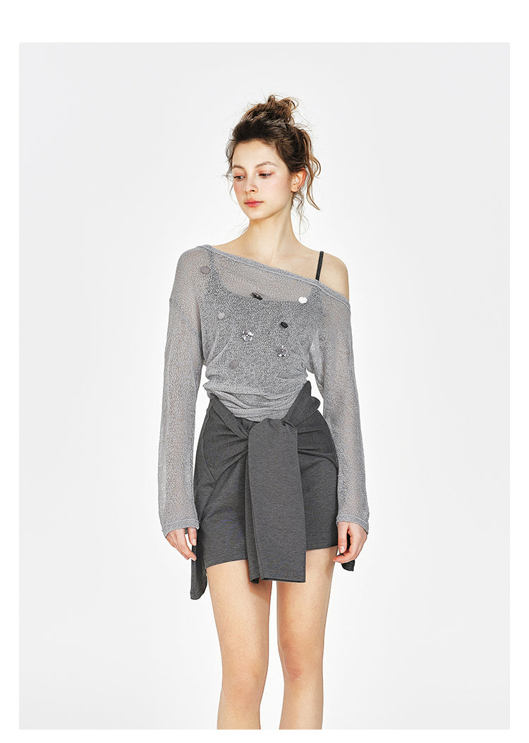 Off-Shoulder Sheer Top, Tie-Front Faux Layered Dress