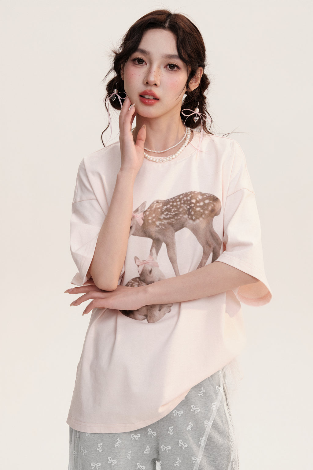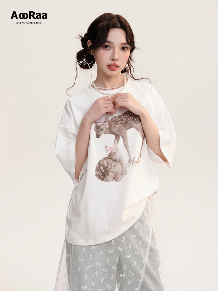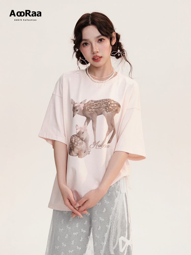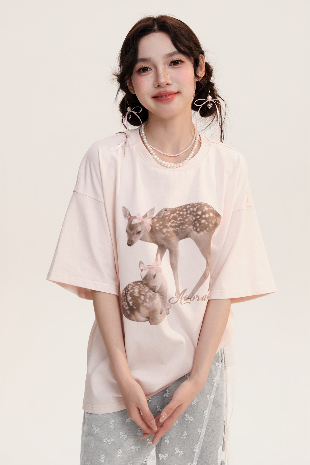 Oversized Deer Print Round Neck Cotton T-Shirt