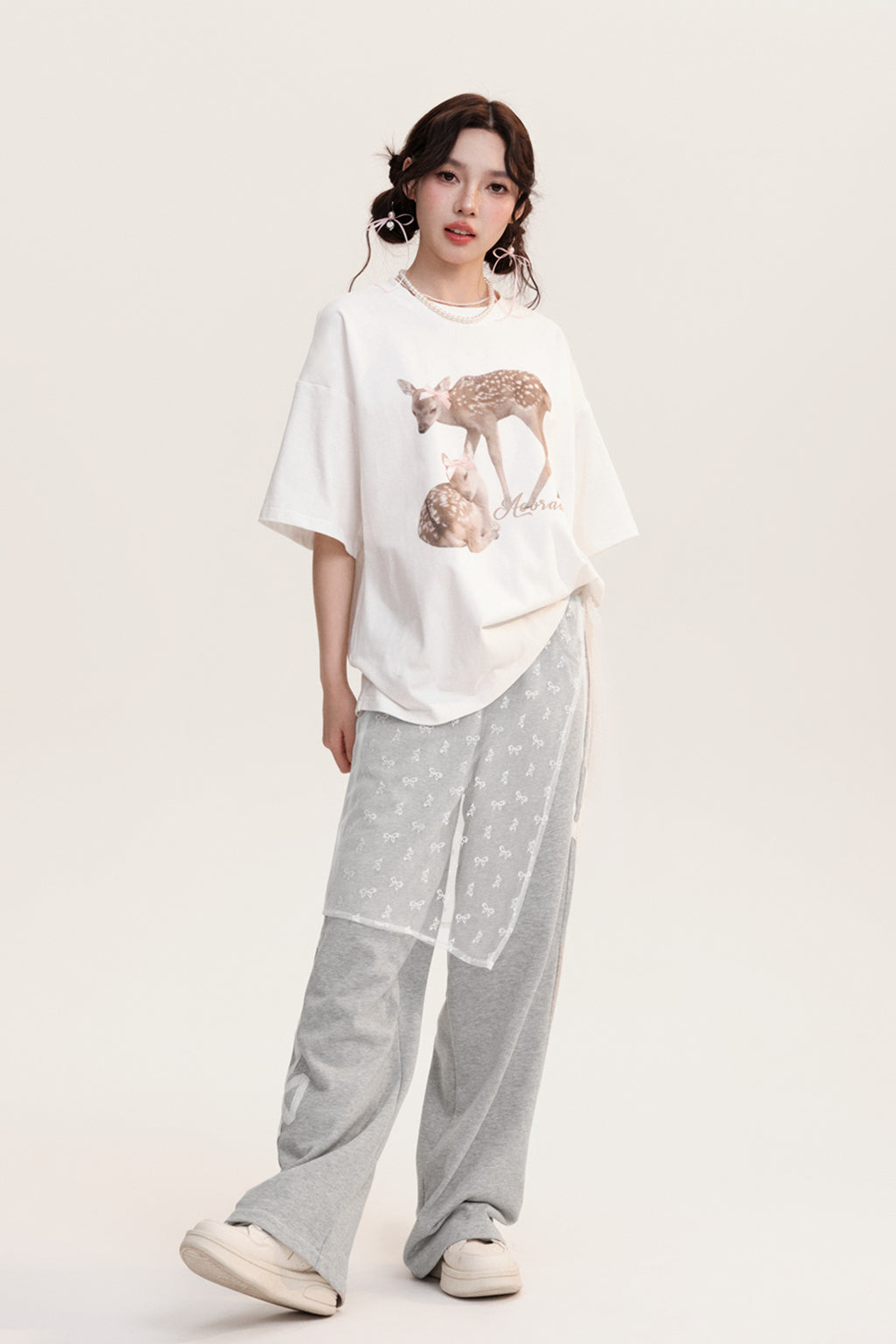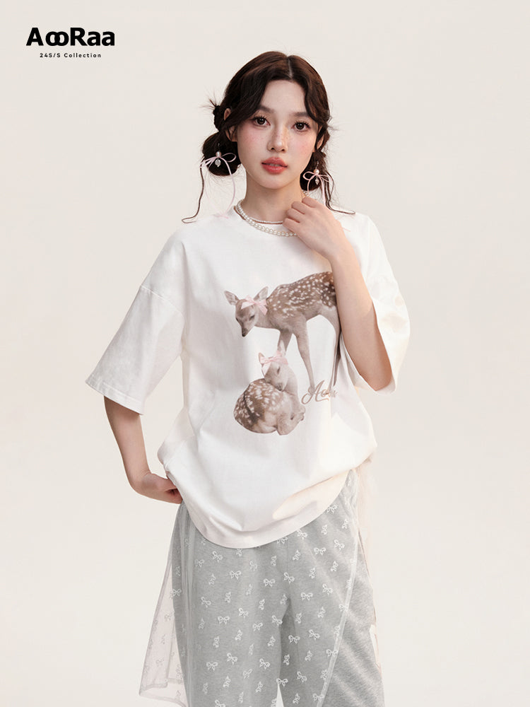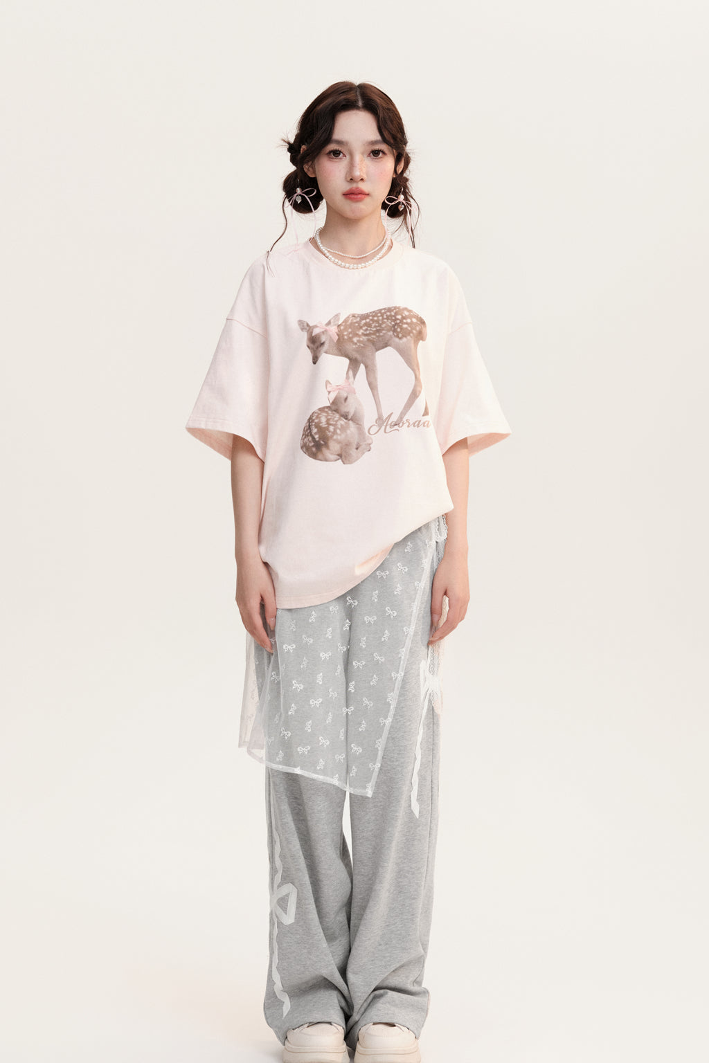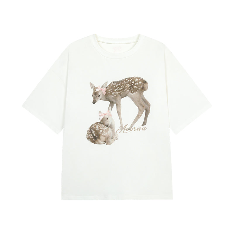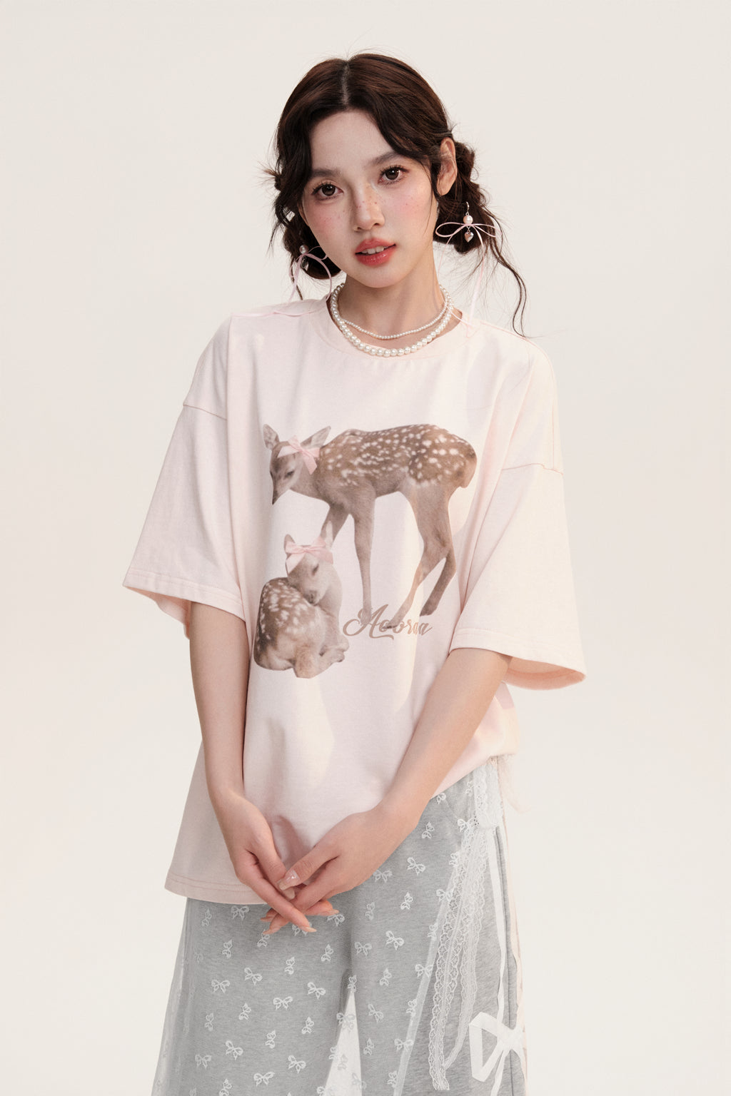Oversized Deer Print Round Neck Cotton T-Shirt