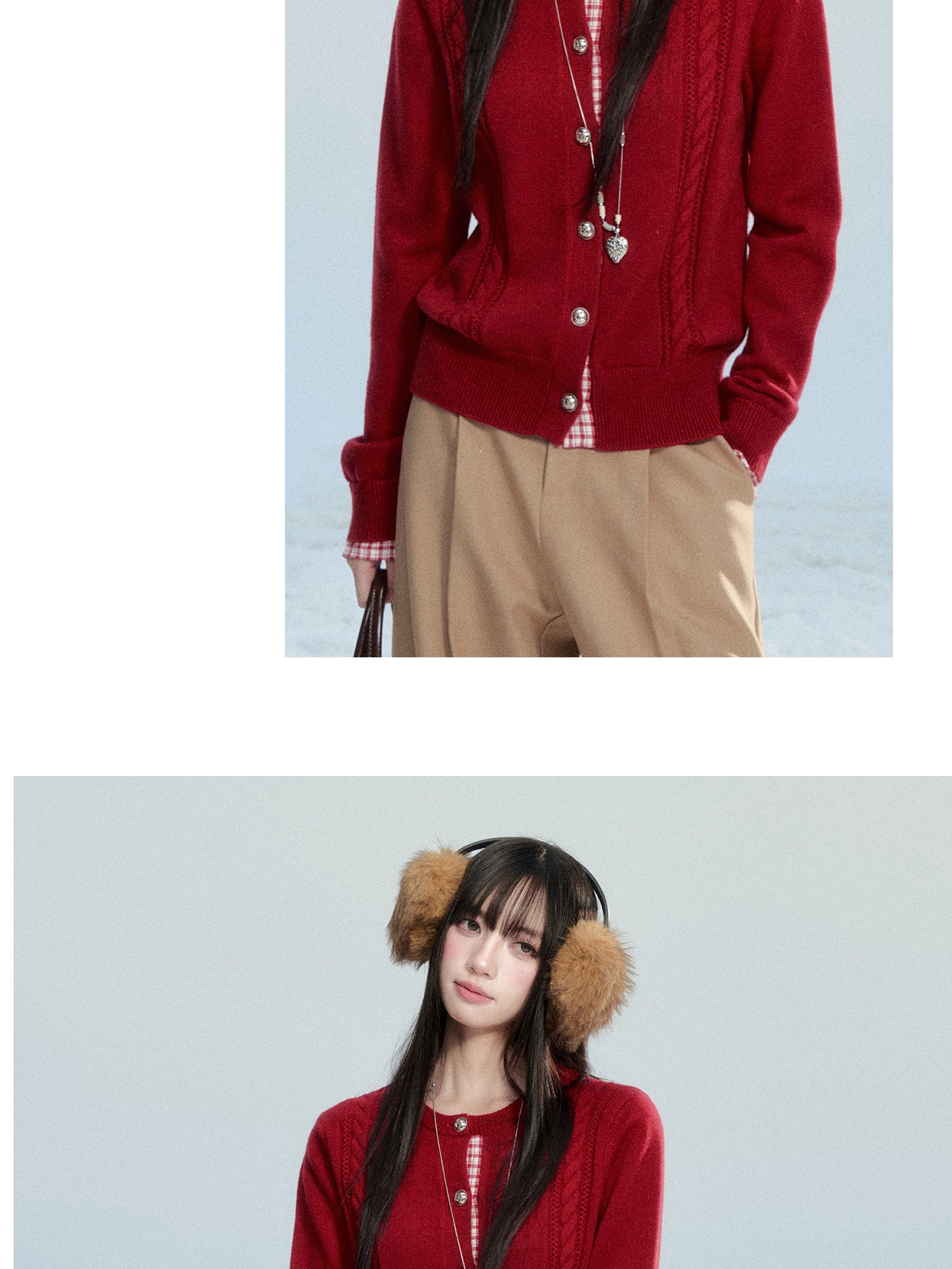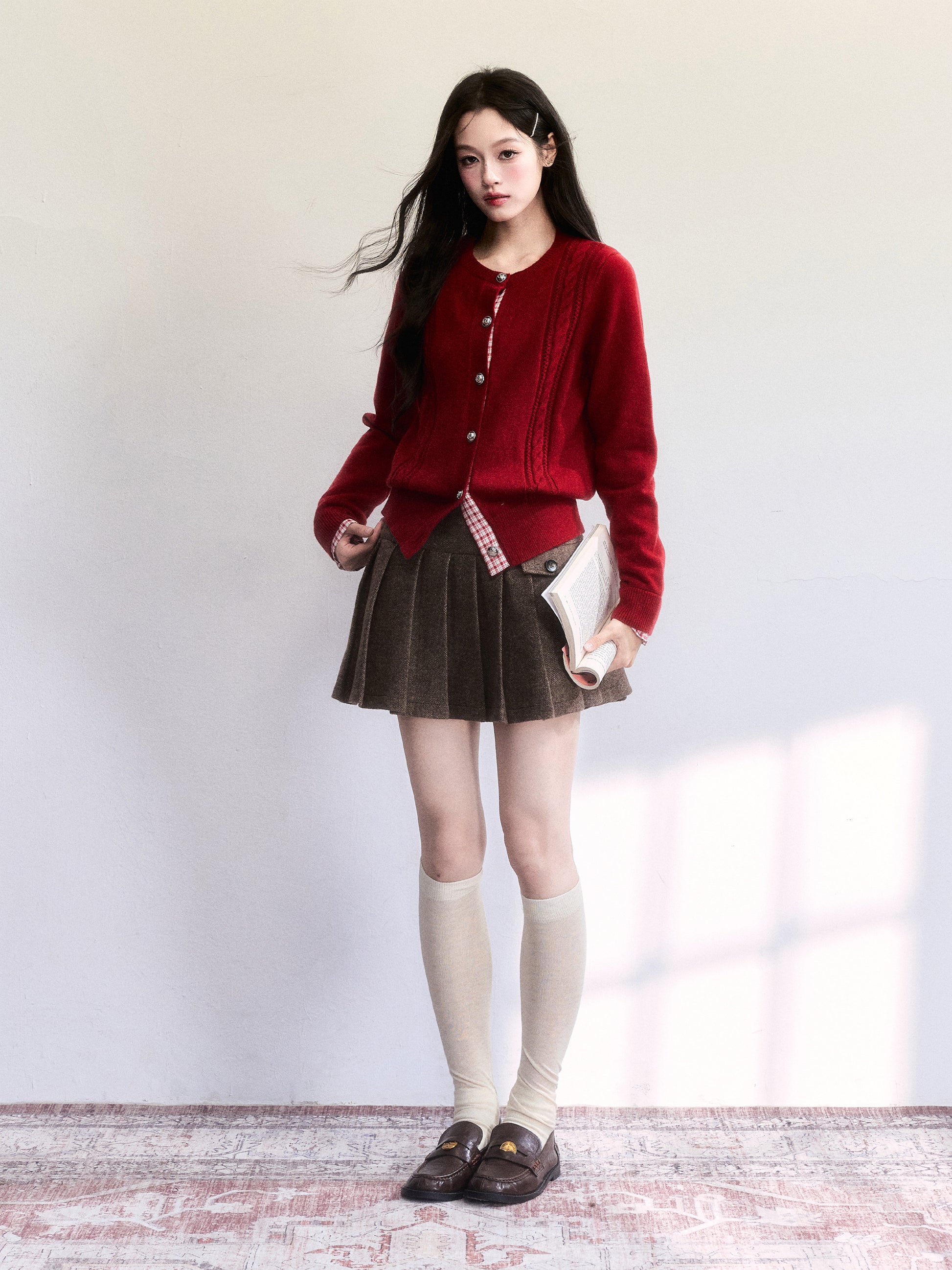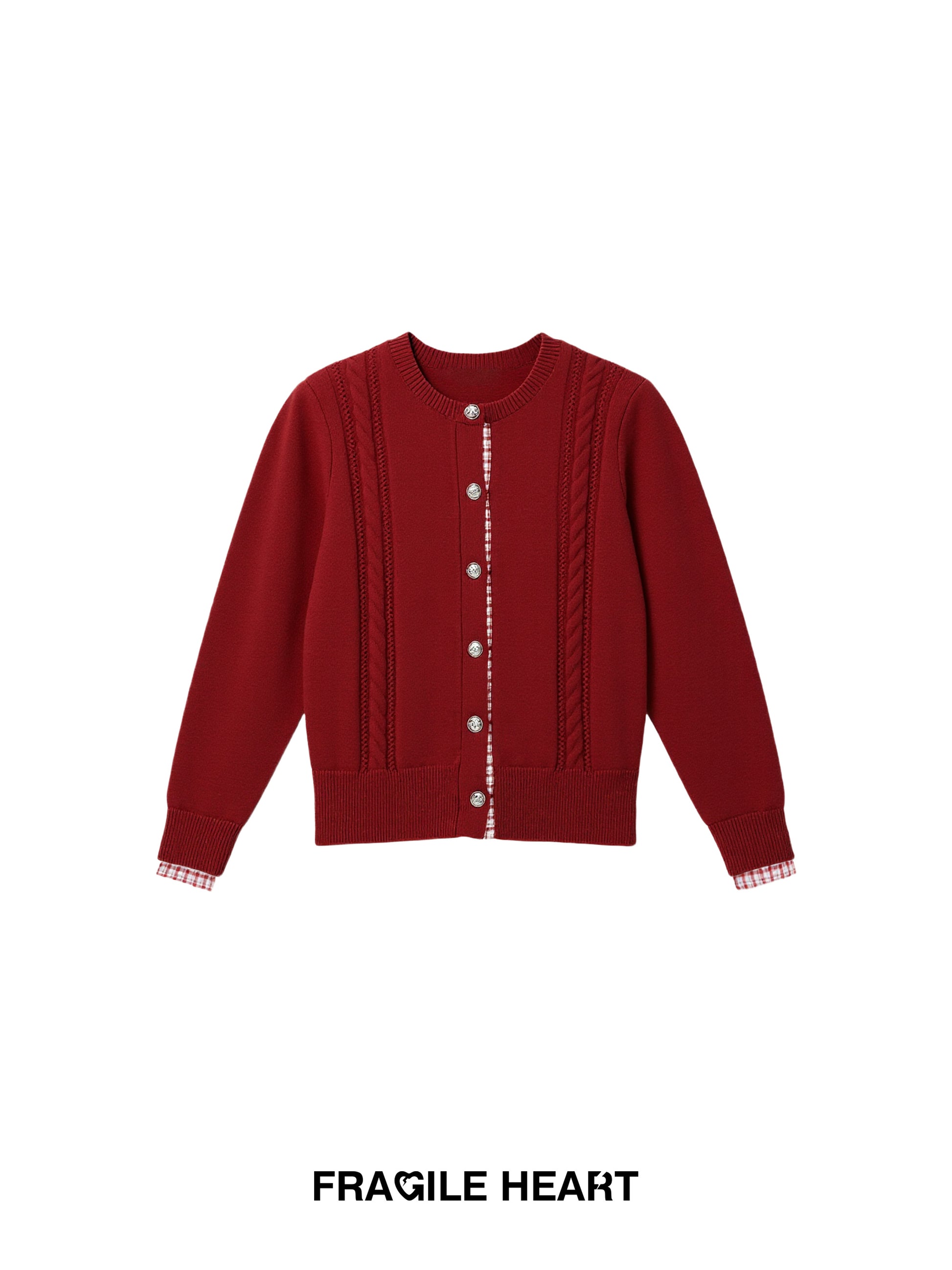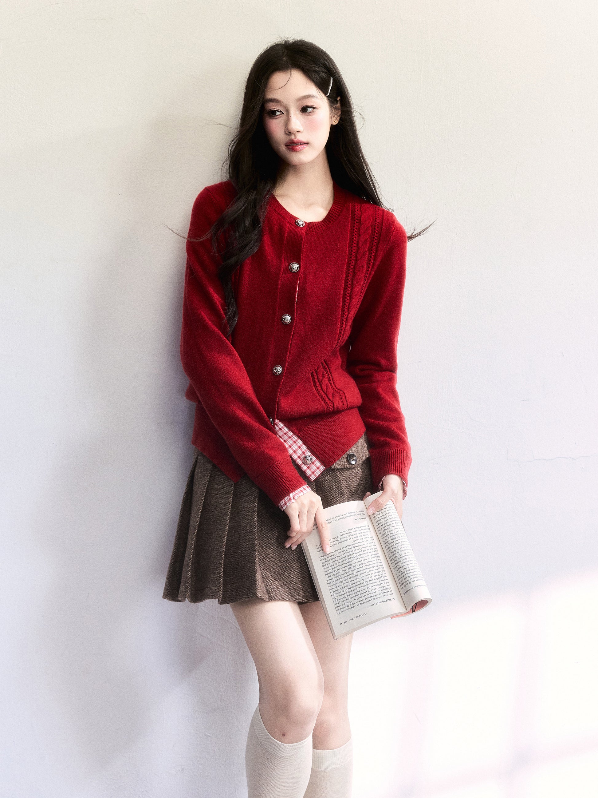Plaid-Detail Cable Knit Cardigan