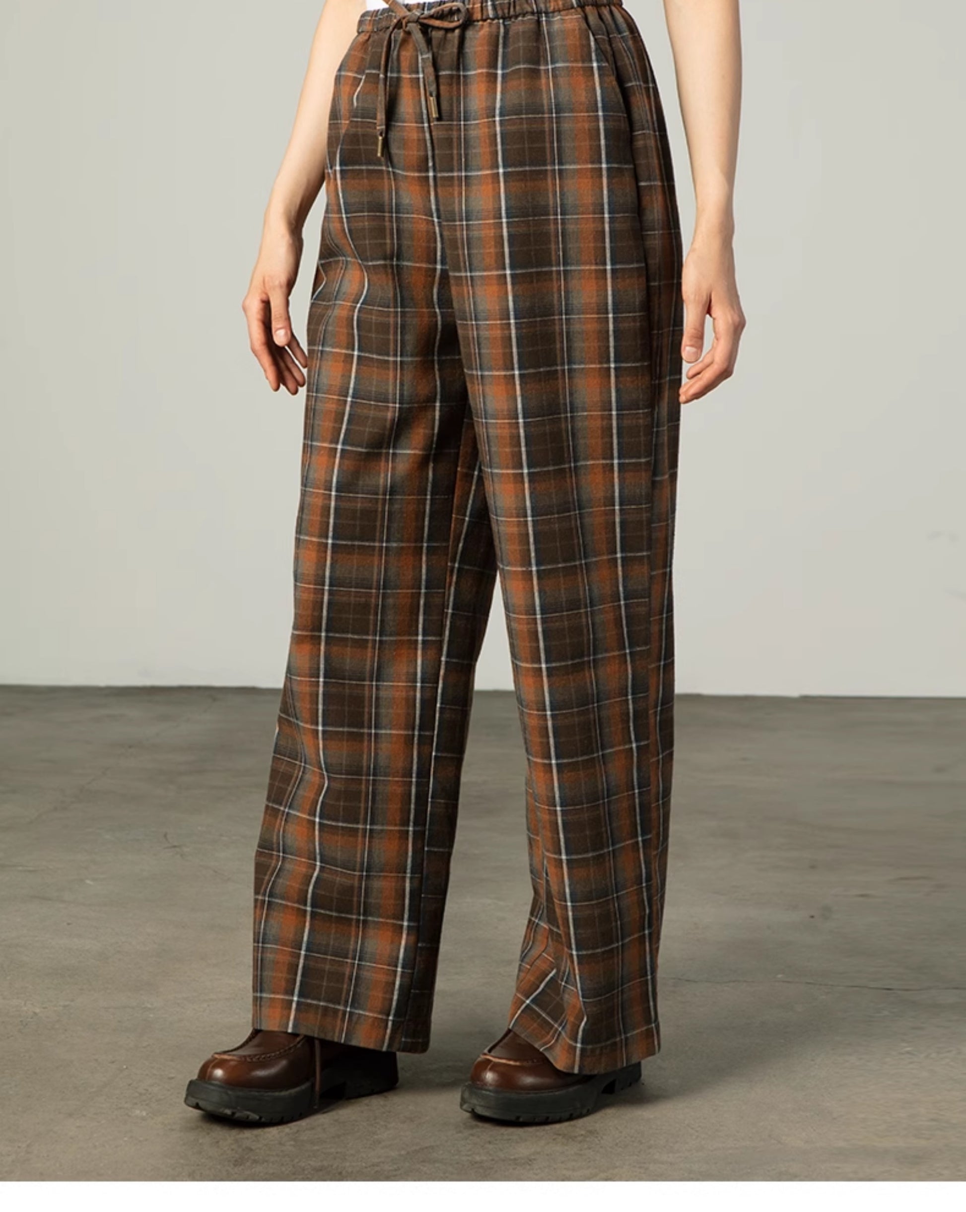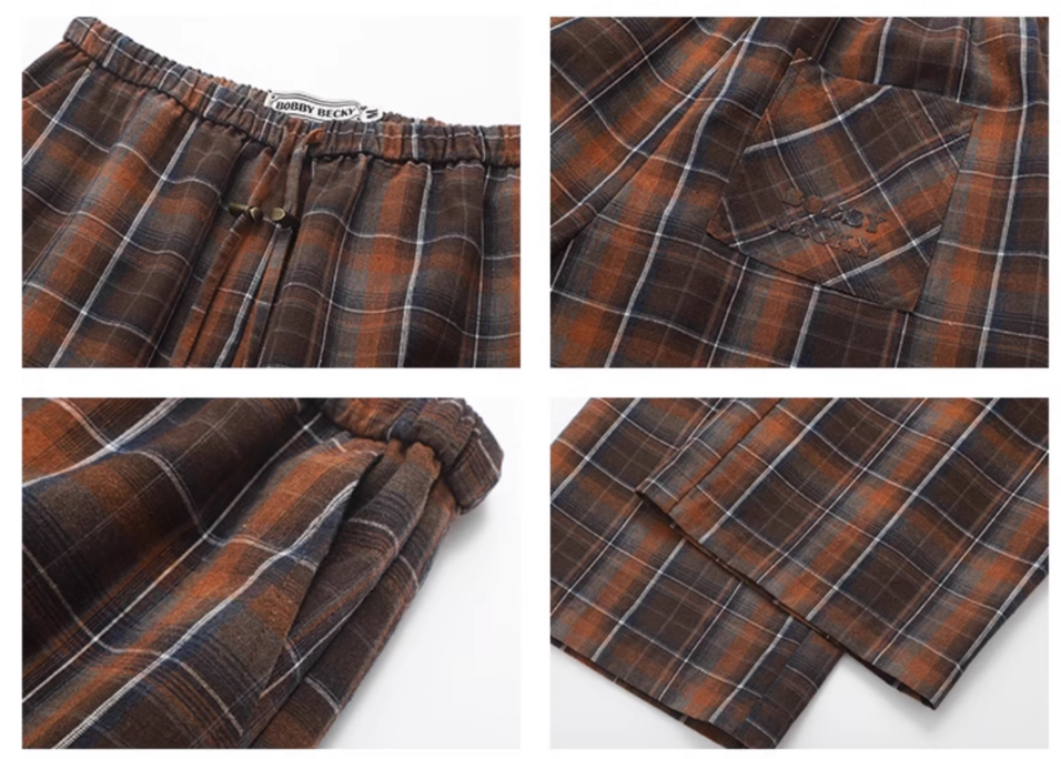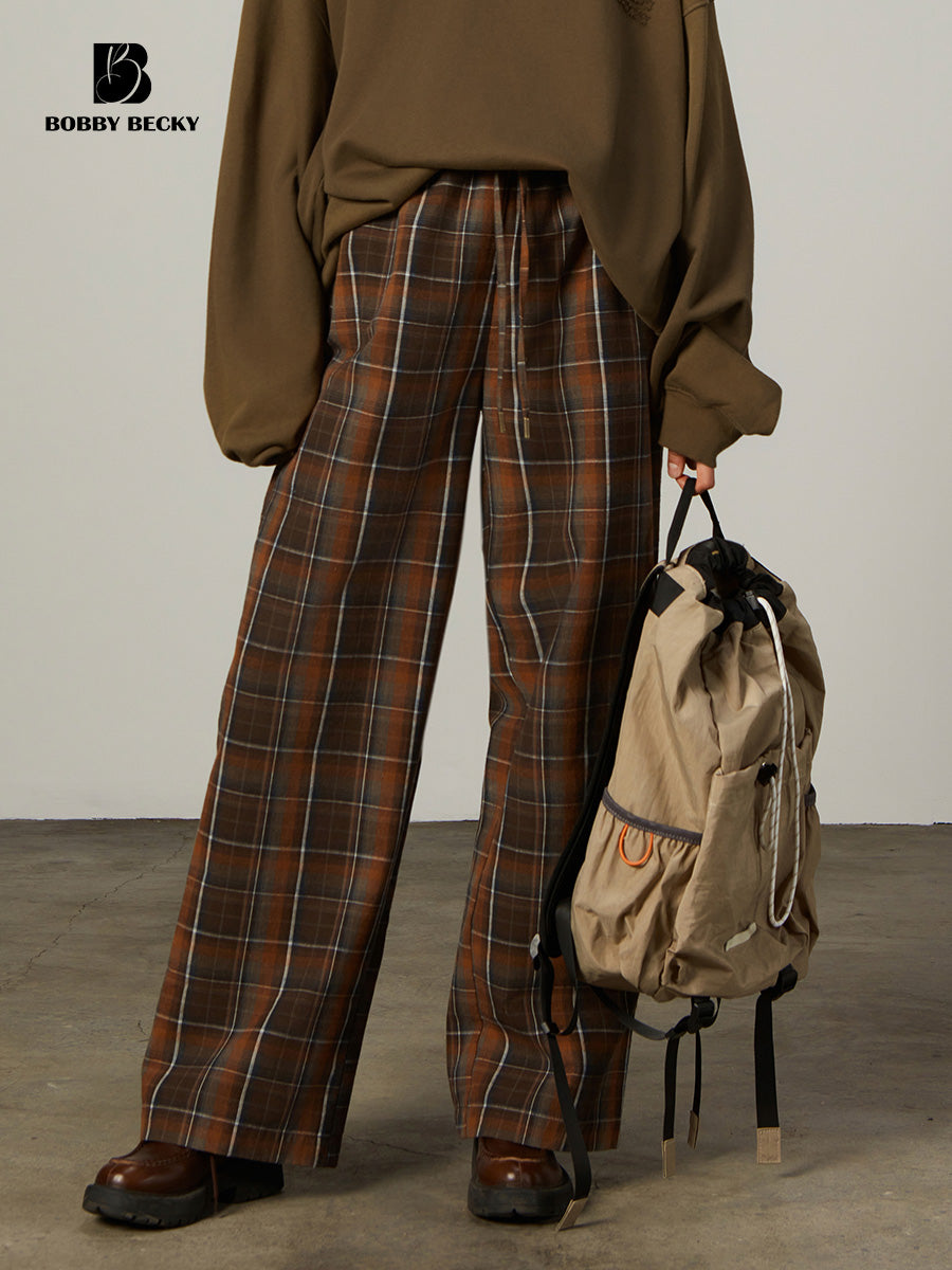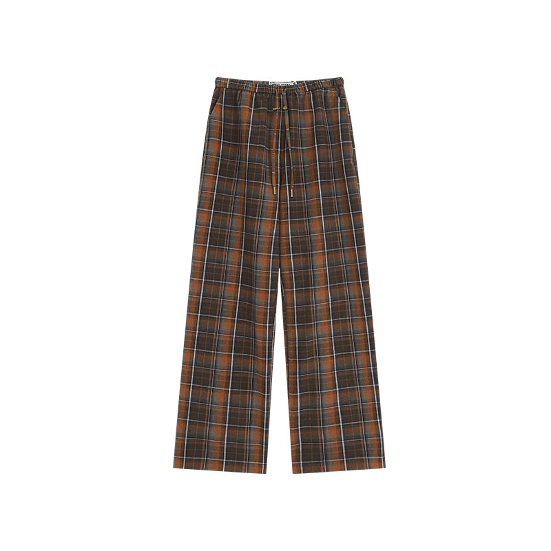 Plaid Elastic Waist Wide-Leg Cotton Pants