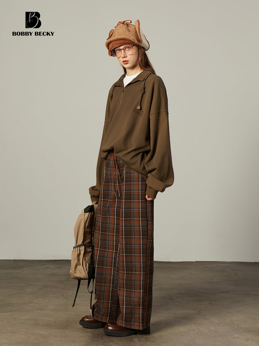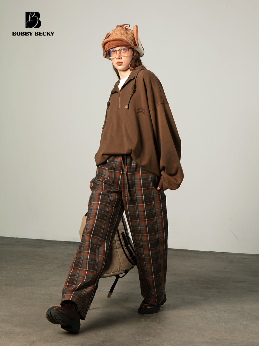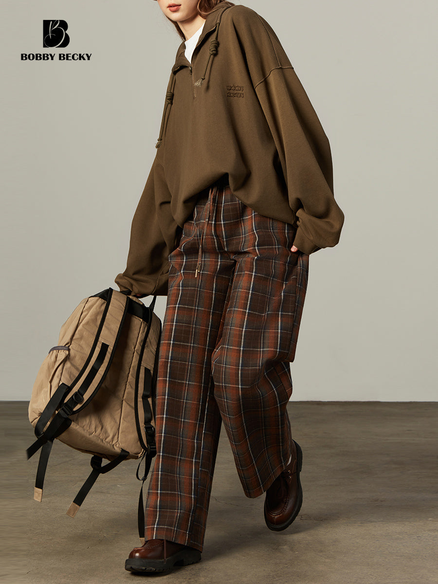 Plaid Elastic Waist Wide-Leg Cotton Pants
