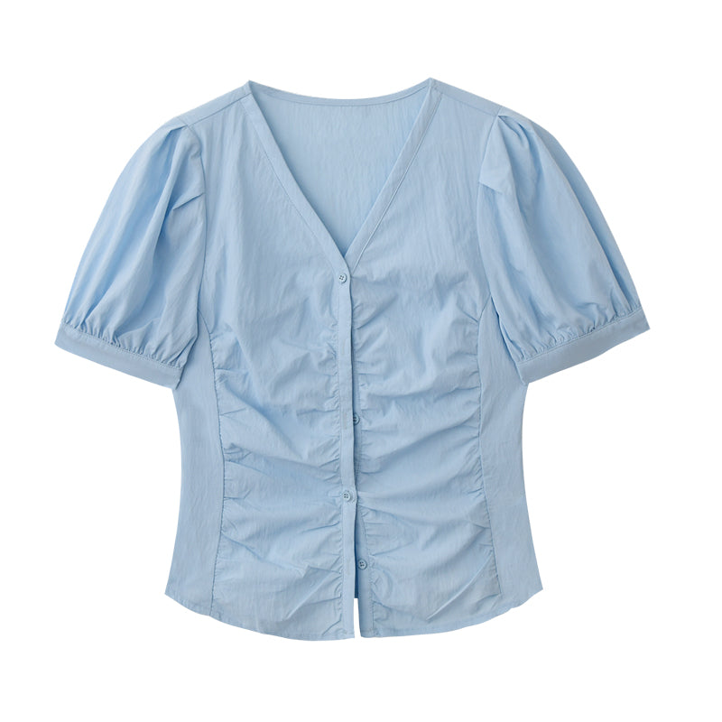 Puff-Sleeve Collarless Blouse With Ruched Front