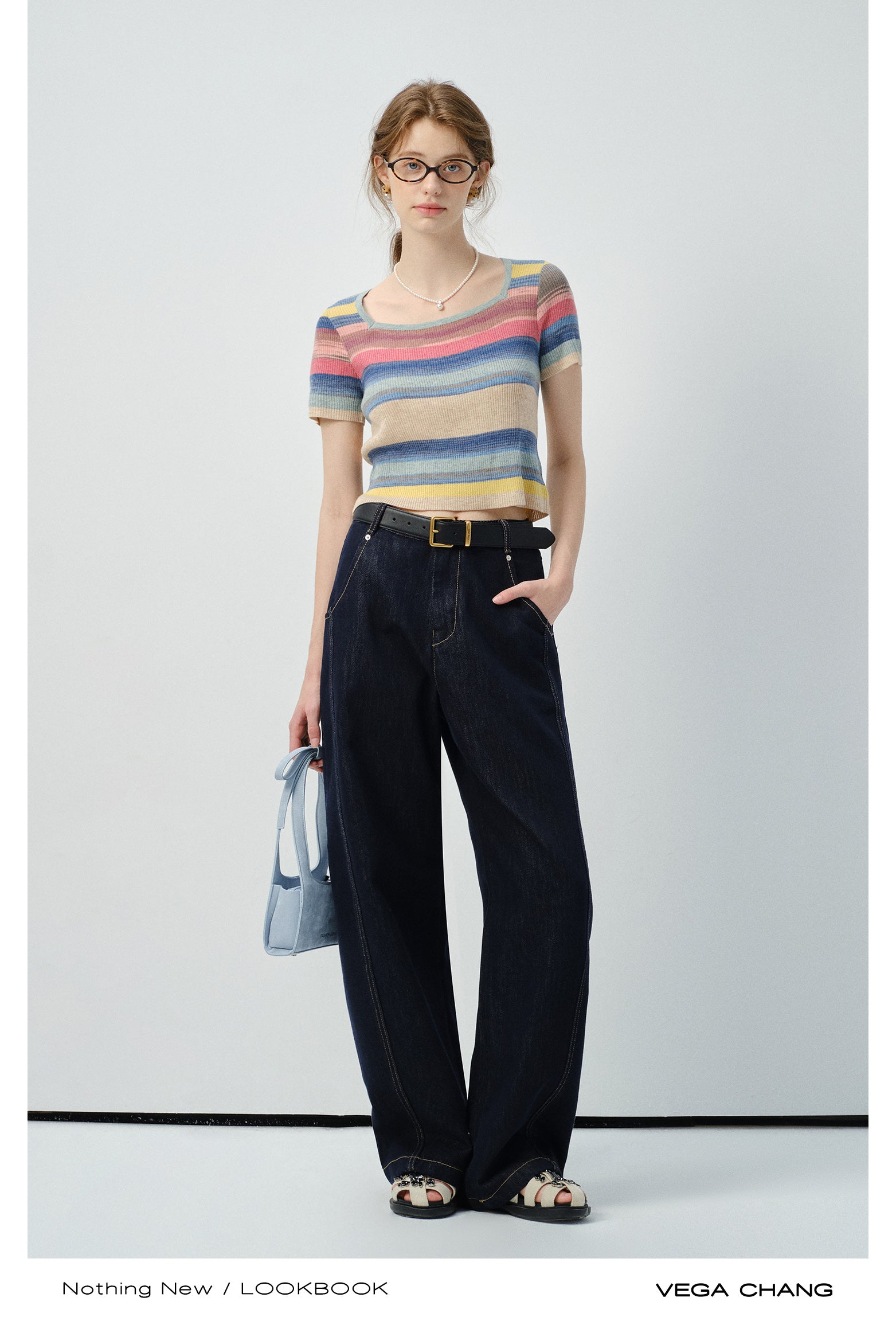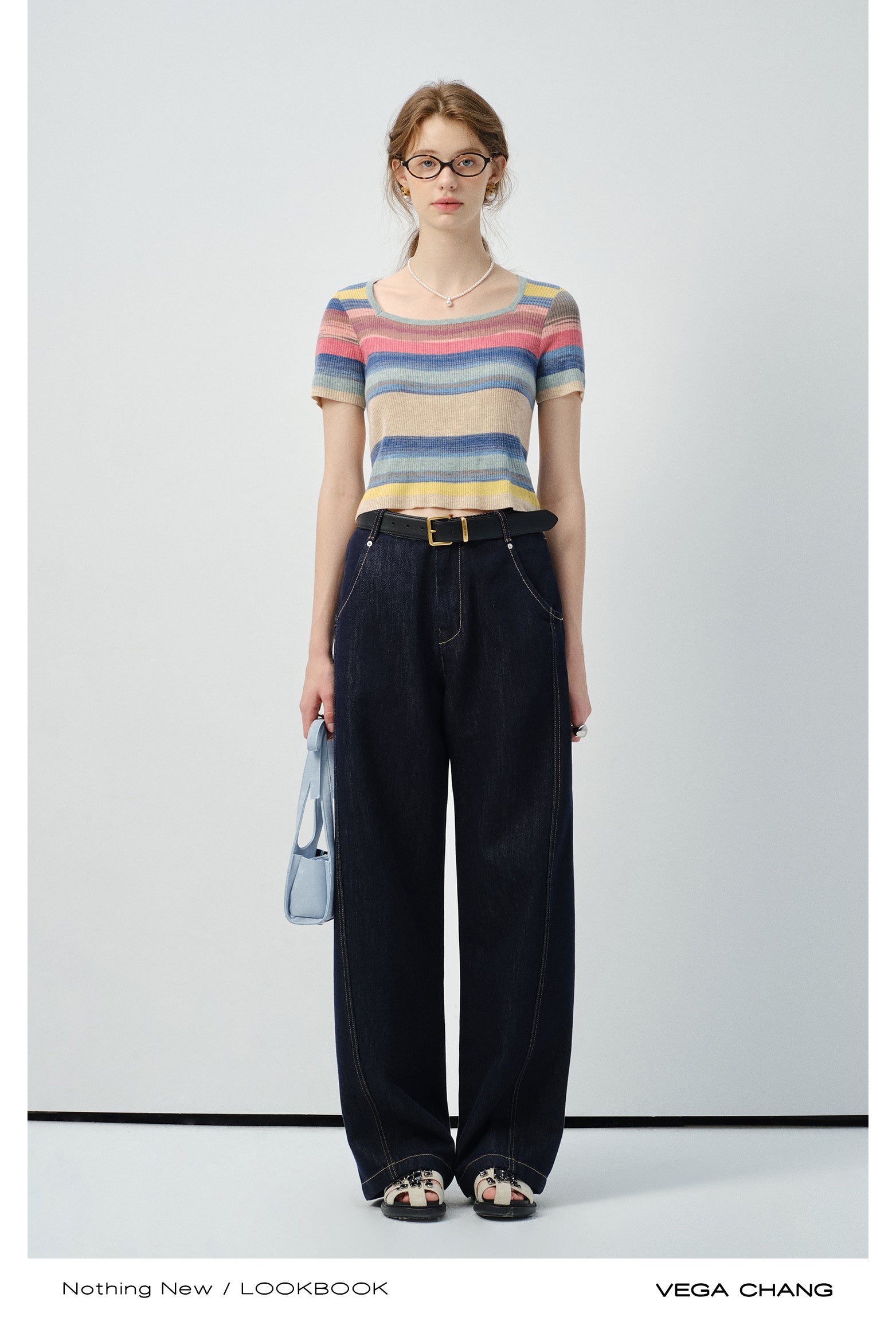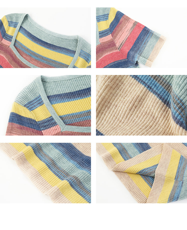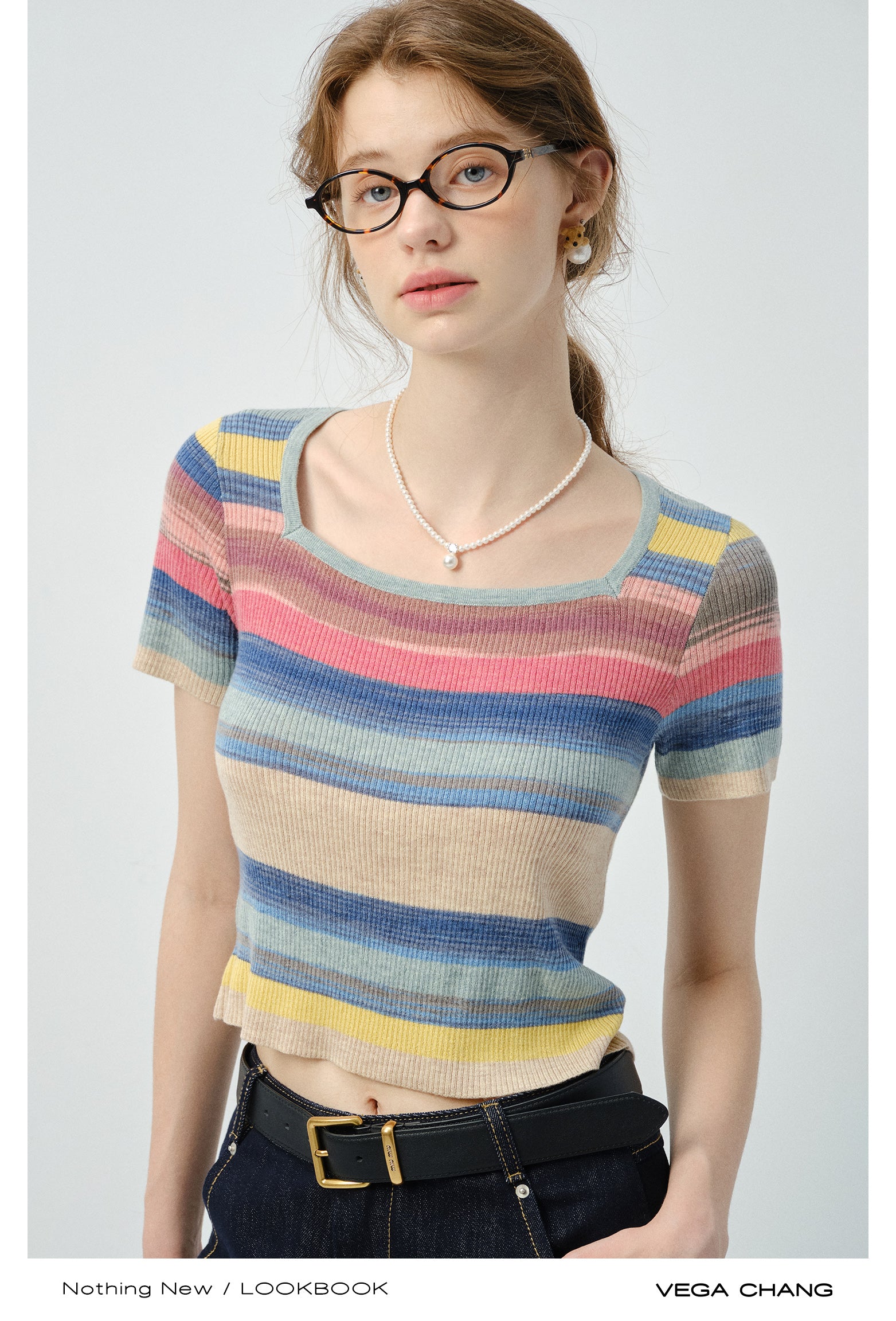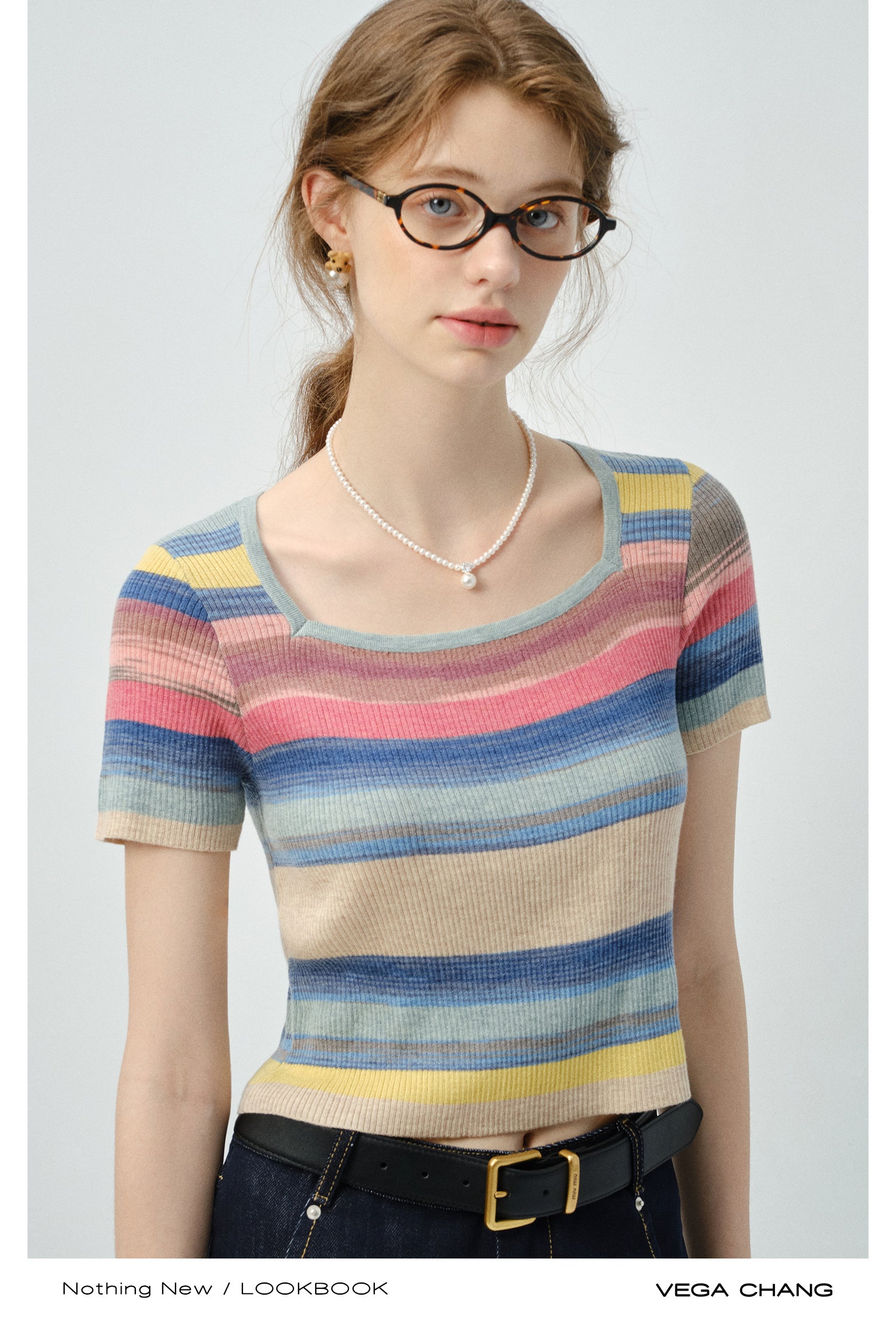 Rainbow Striped Ribbed T-Shirt With Square Collar