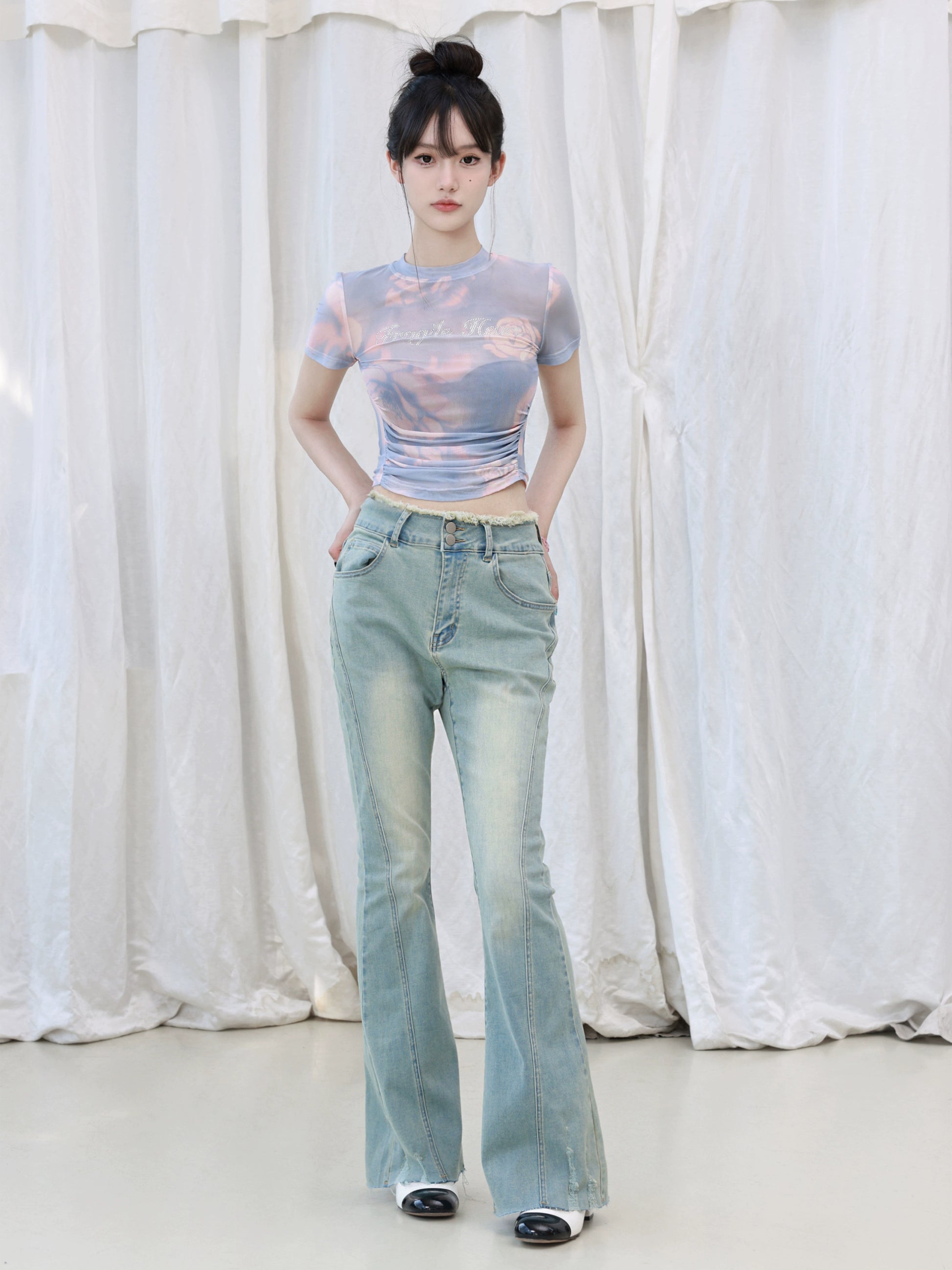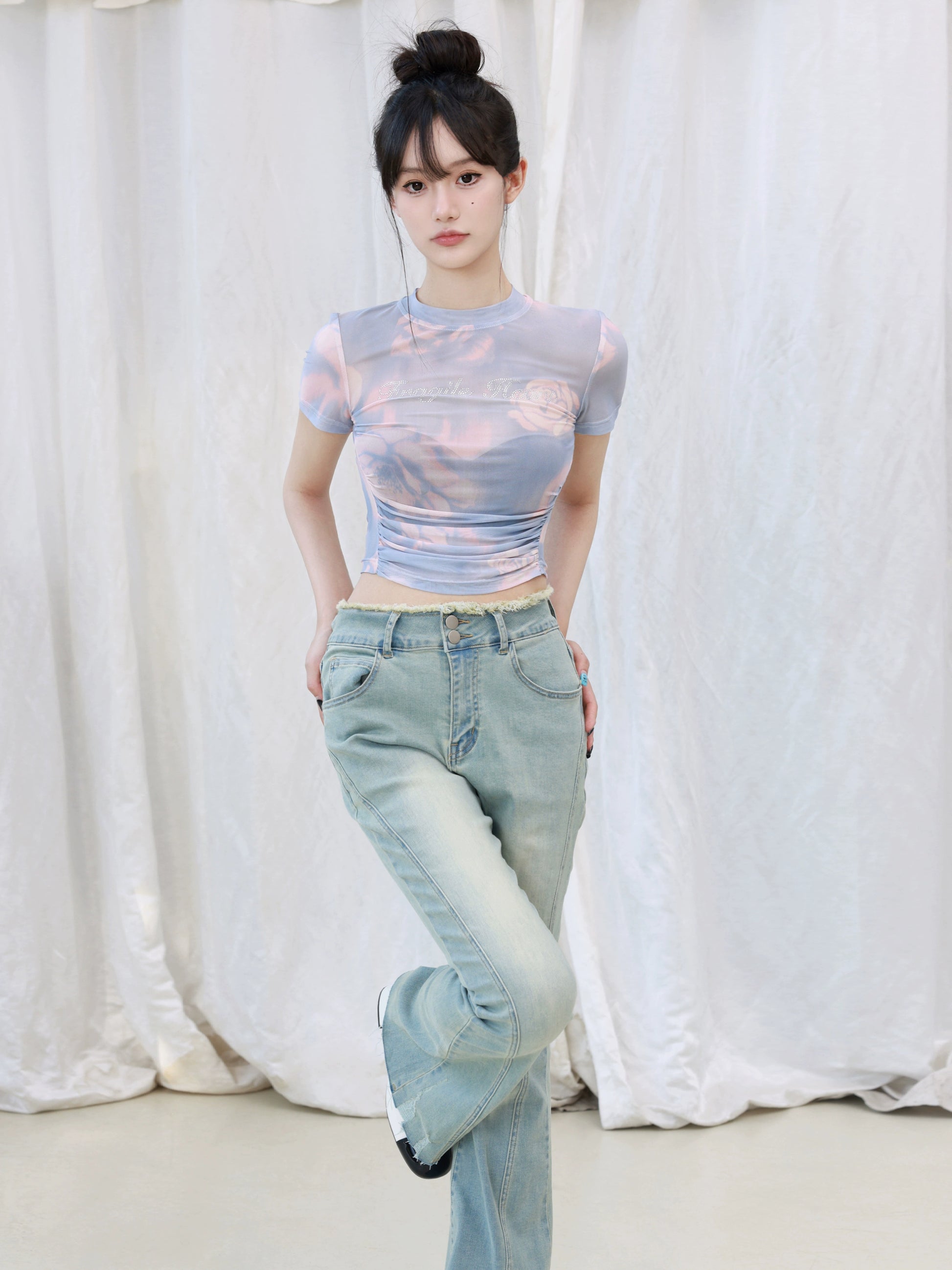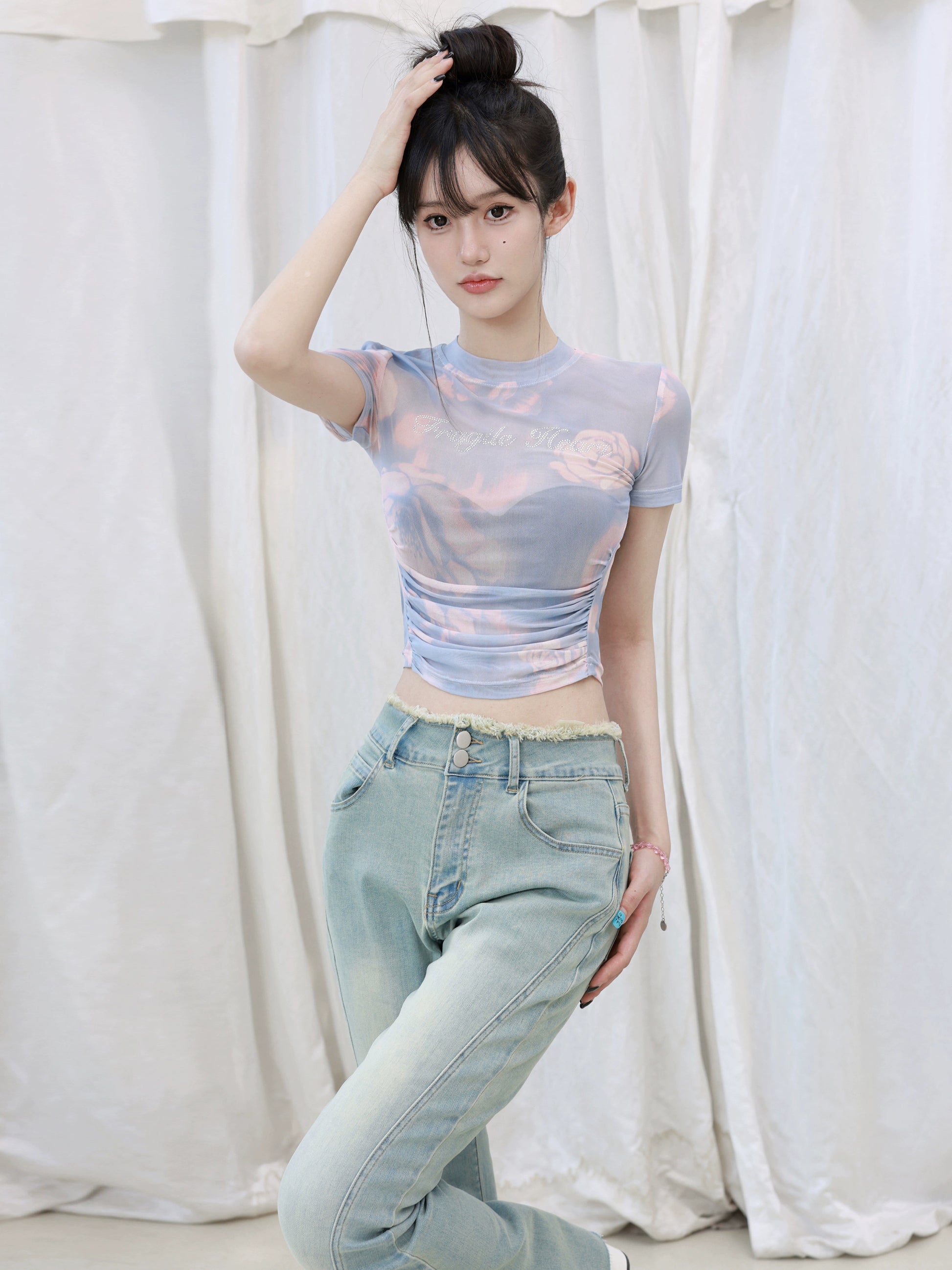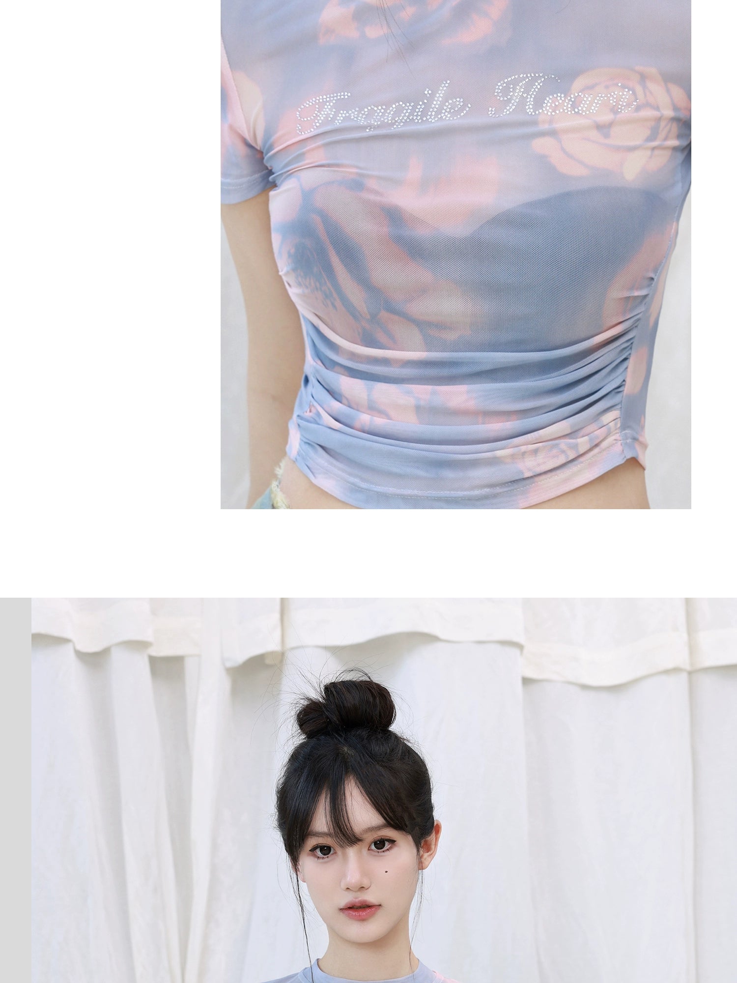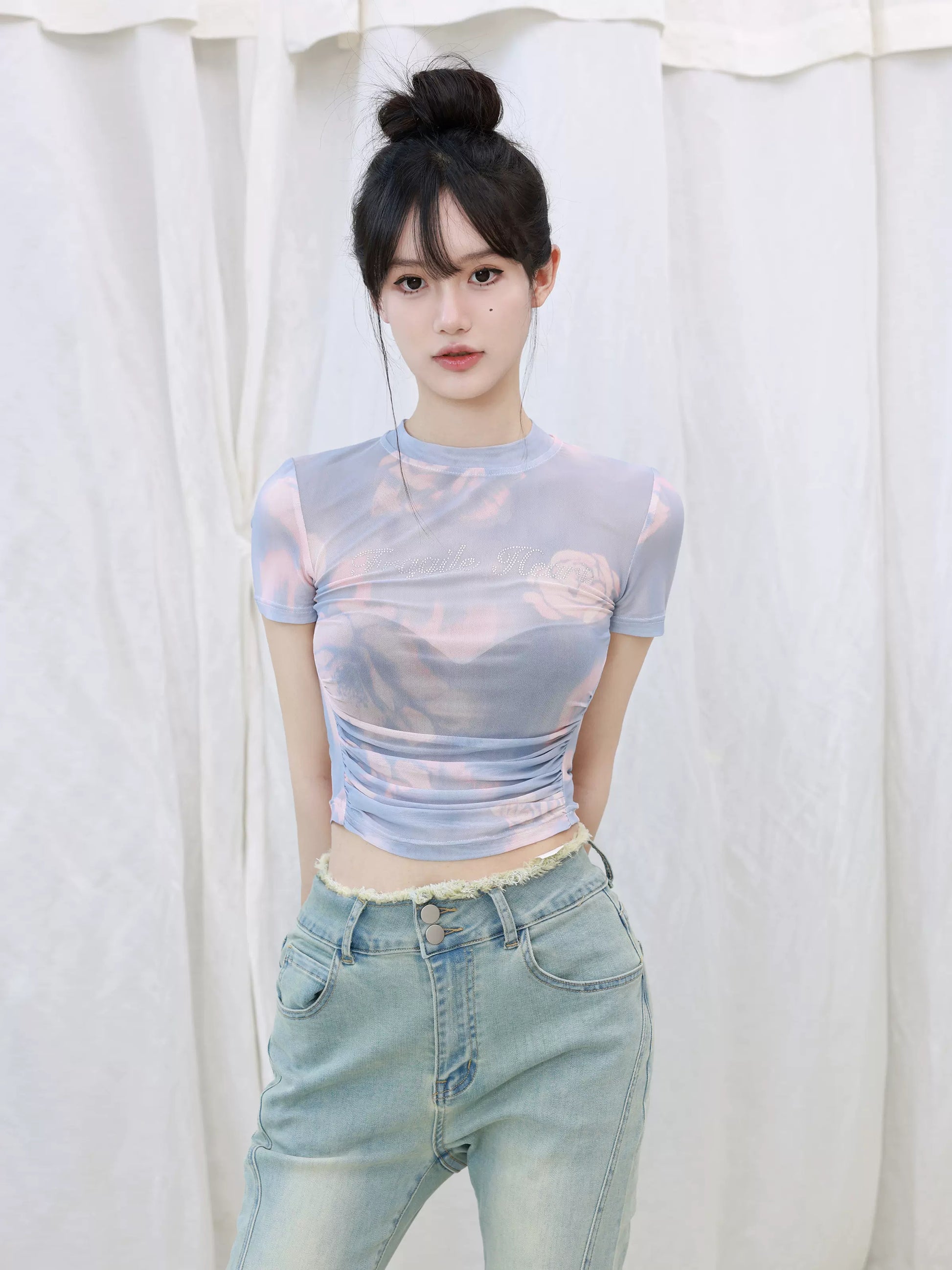 Rose Print Sheer Stretchy Ruched Mock Neck T-Shirt