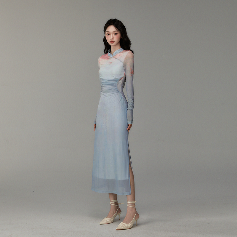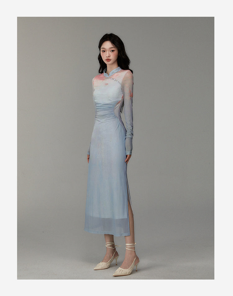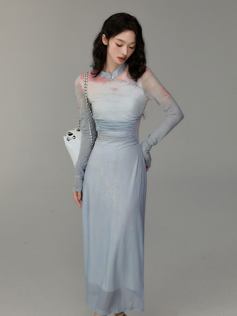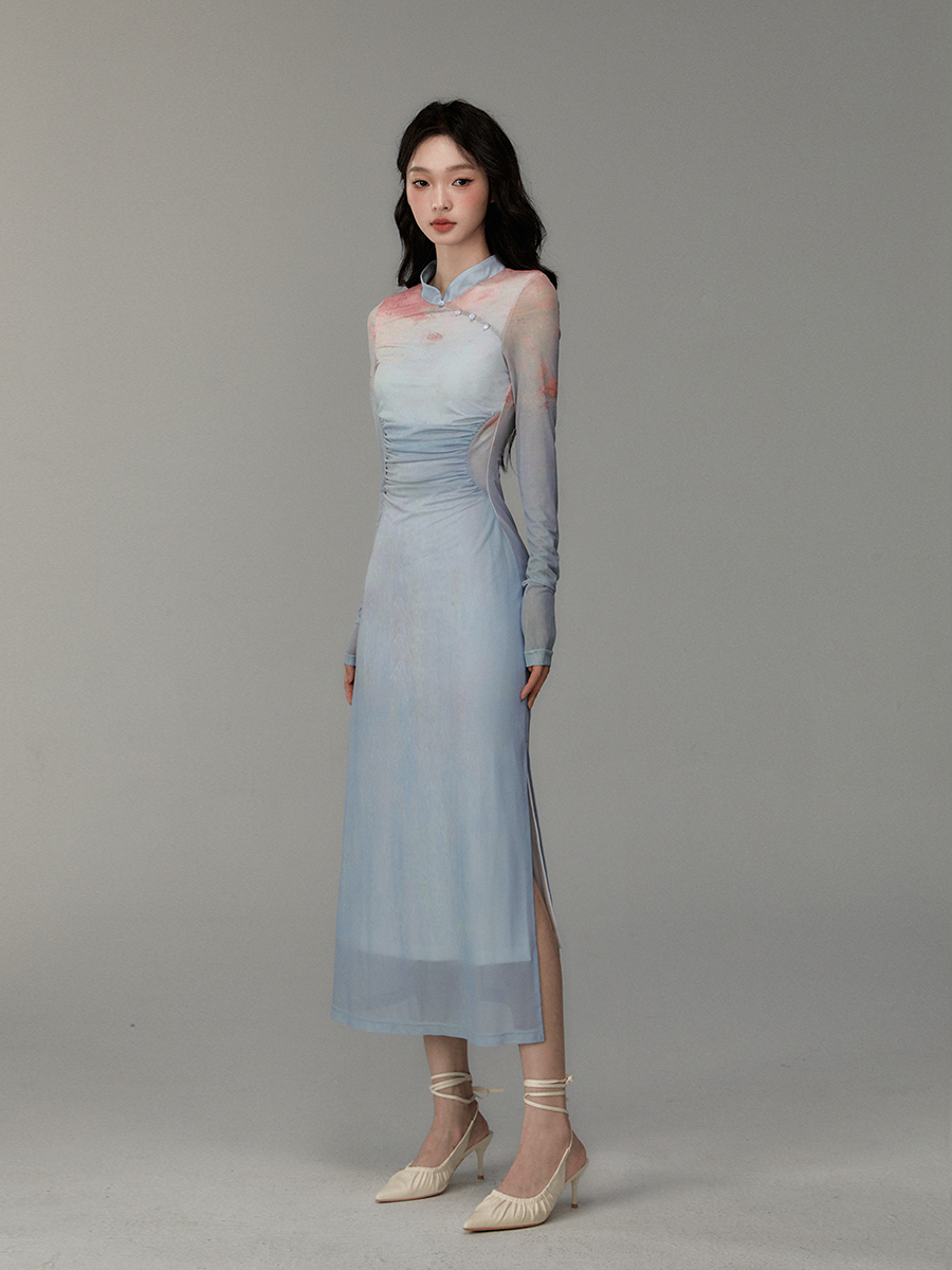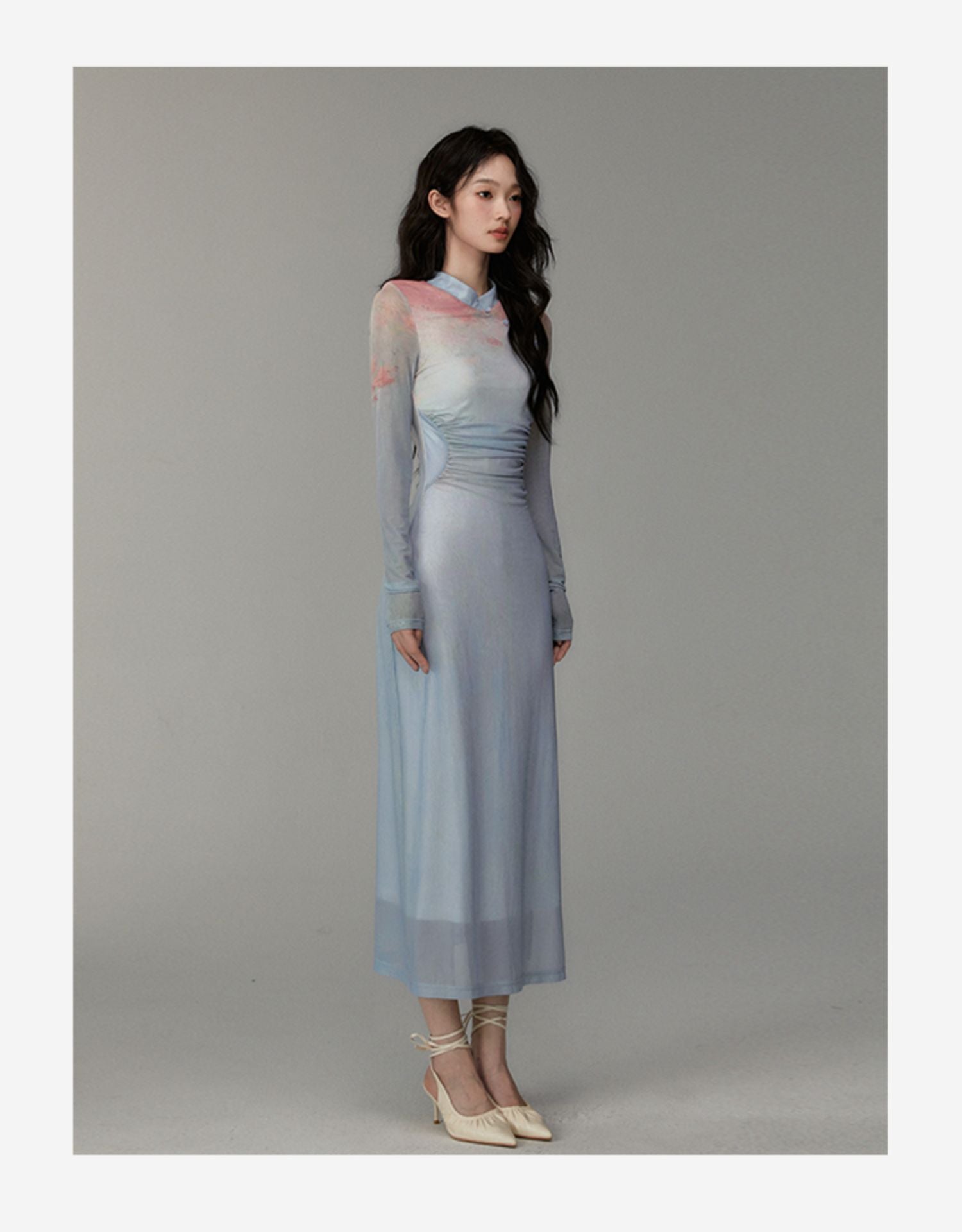 Ruched Gradient Slim-Fit Qipao Style Dress