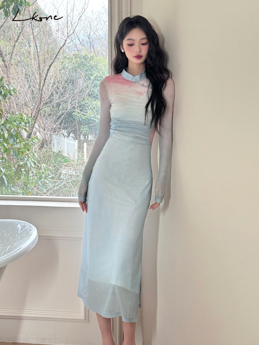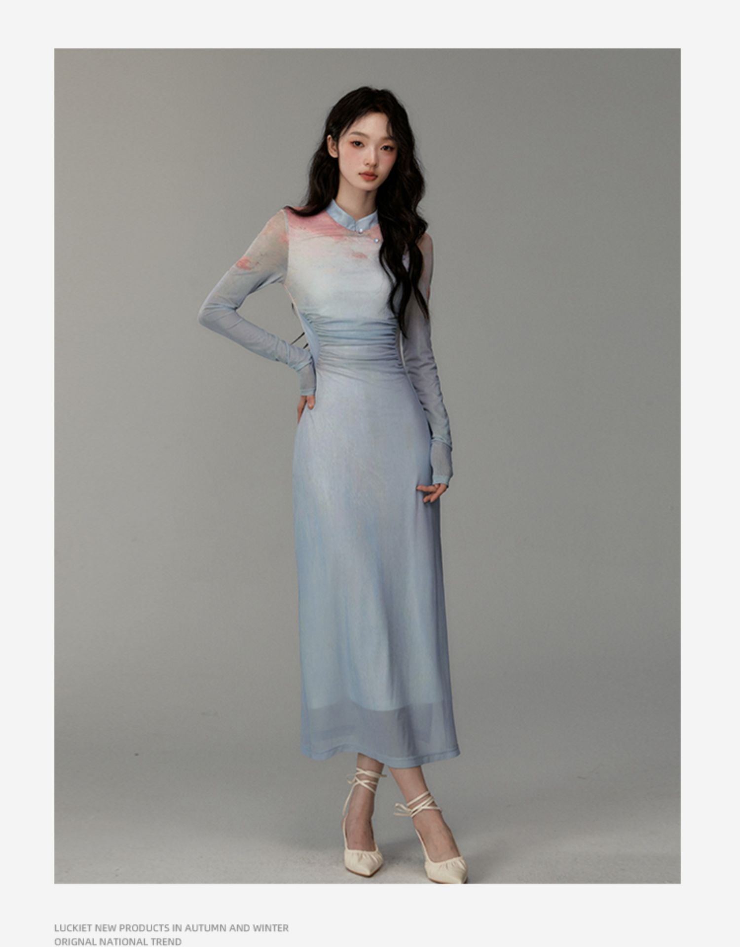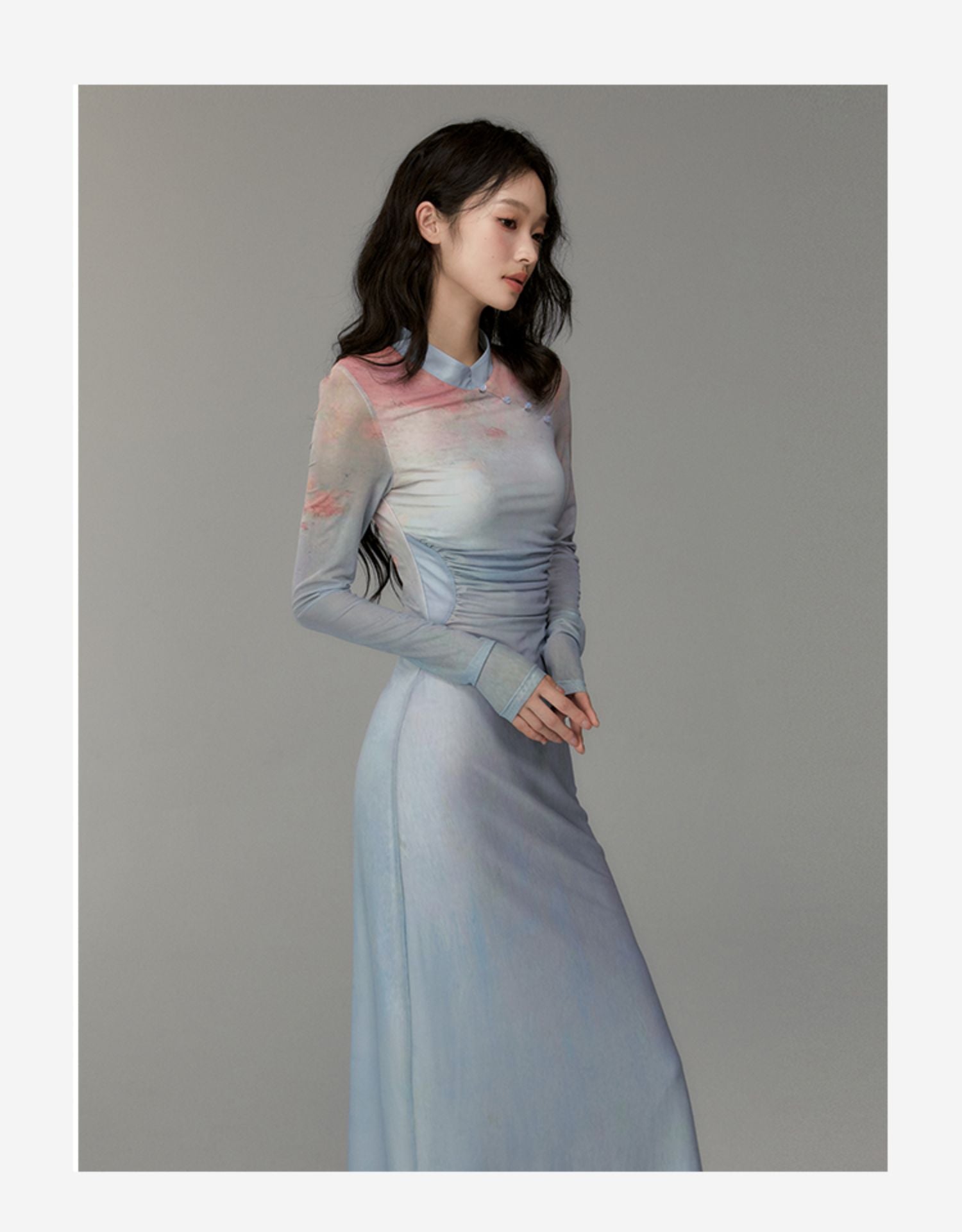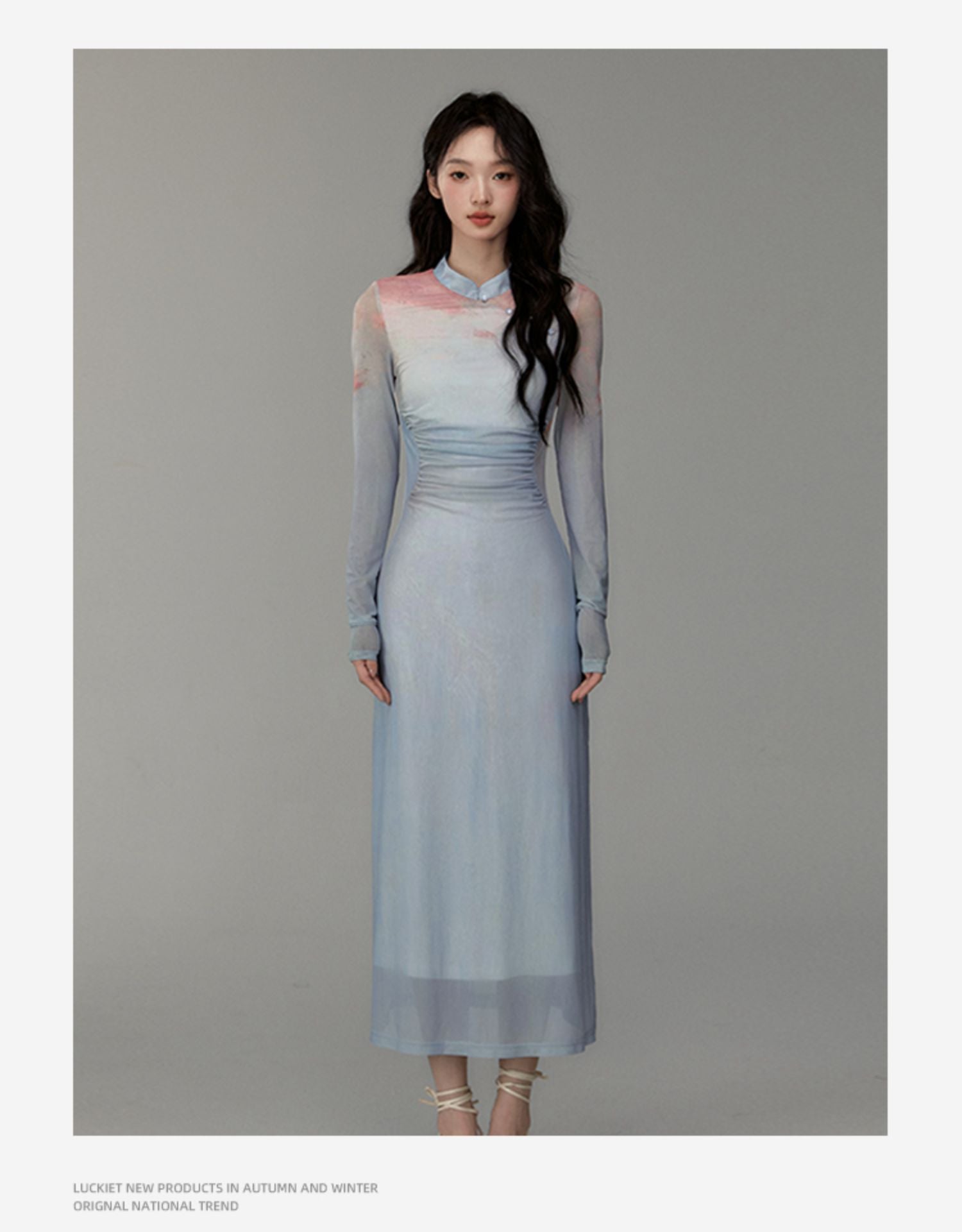 Ruched Gradient Slim-Fit Qipao Style Dress